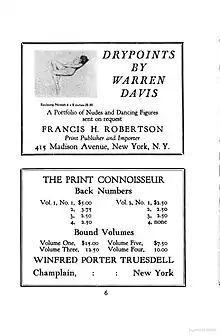 Today Davis is best known for his limited edition figure studies of idealized young women commissioned and published by Francis H. Robertson, a New York art dealer.[1] This series, described as “A Portfolio of Nudes and Dancing Figures”, was offered for sale in New York and London in an edition of 100 impressions. His treatment of his subjects considers how the human body composes itself while standing, sitting, kneeling, crouching, or lying down, unmediated by any historic, mythic, or philosophical associations based on classical references or culture.[2]
