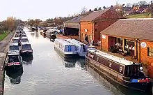 At Warwick, the canal rises by two locks to Budbrooke Junction (formerly the junction with the then-independent Warwick and Birmingham Canal). To the left is the restored Saltisford Canal Arm, a short stretch that used to run under the railway to the original canal basin complex and terminus of the Warwick and Birmingham Canal – the basin was filled-in in the 1970s. The canal used to serve one of the oldest gasworks.[4] Two hexagonal buildings that housed the gas holders are part of the world's oldest remaining gasworks buildings.[5] After half a mile the mainline reaches the bottom of the Hatton flight of 21 locks that lift the canal up out of the Avon Valley. The first 10 locks are spaced out but from the middle lock the flight is tightly spaced.