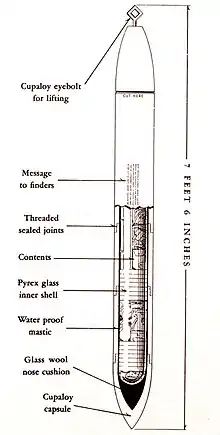 The time capsules are bullet-shaped, measure 90 inches (2.3 m) in length, and have an exterior casing of about 8.75 inches (22.2 cm) in diameter.[4] Time Capsule I weighs about 800 pounds (360 kg), while Time Capsule II weighs about 400 pounds (180 kg).[5] Time Capsule I was made of a non-ferrous alloy called Cupaloy, created especially for this project.[6] Designed to resist corrosion for 5,000 years, the alloy was made of 99.4% copper, 0.5% chromium, and 0.1% silver.[7] Westinghouse claims that Cupaloy has the same strength as steel, yet will resist most corrosion over thousands of years because it becomes an anode in electrolytic reactions, receiving deposits instead of wasting away like most iron-bearing metals.[8]
