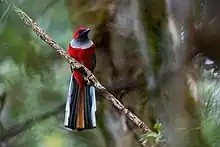 Like most trogons, Whitehead's trogon is sexually dimorphic; the male is considerably more colourful than the female.[7] It ranks among Borneo's largest trogons, measuring 29 to 33 cm (11 to 13 in) in length.[nb 1][3][9] The male is crimson on the forehead, crown, nape, and sides of the head, with bare blue skin around the eyes. The rest of his upperparts are cinnamon-brown. His throat is black, shading into a grey breast, but the rest of his underparts are crimson.[9] His wings are primarily black, with fine white barring on the secondaries and coverts.[2] His tail is mostly white underneath; above, the two central tail feathers are cinnamon with a broad black tip, and the remaining tail feathers are primarily black. The outermost tail feathers are white on the terminal half and along the outer web.[2] He has a blue beak, pinkish-brown legs and feet, and reddish-brown irises.[9][2] The female is similarly patterned, but duller, with cinnamon-brown replacing the crimson of the male.[3] The barring on her secondaries and wing coverts is cinnamon-brown rather than white.[10] The immature female is similar to the adult female, but her entire ventral side is uniformly coloured, lacking the adult's black throat and grey upper breast. She also has less blue colouring on her beak.[11]