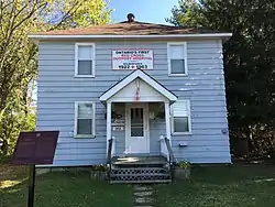 The two-storey building was constructed in the normal local style for private residences with timber framed walls, a truncated hipped roof, and open porch on the front above the main entrance door.[2] It is situated on a quarter-acre plot between two private residences, slightly set back from Burleigh Road/Ontario Highway 648 with Dark Lake to the rear.[2][3]