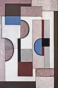 In 1979 Sandforth met the painter Heinrich Siepmann (1904–2002), one of the most important representatives of the German post-war avant-garde. As a friend for many years, Siepmann exerted no small influence on Sandforth's further development as a painter, based on similarities in his life, in his conception of art in general and in questions of pictorial form and composition. This decade is marked by greater calm: fewer exhibitions, less travel, a reduced number of new paintings. It seems as if Sandforth needed the quiet in the studio to question his own artistic expression, to develop it further and to arrive at new strictly non-representational, constructivist pictorial ideas. The relationship of the forms to each other and to the overall pictorial architecture runs thematically through the early works of the 1980s.[25] The first work in strict symmetry, Gegeneinander mit Halbrunden in der großen Fassung, he still signs in the centre front. Sandforth extended the ambivalence between calm and tension in the structure of the individual pictorial elements by introducing a vertical line as an accentuating moment in his paintings. In these works, one can see how the painter struggles for a balance in the picture, how the rising or sinking form is brought into harmony, how colour surfaces and surface boundaries circle each other.[26] And finally, he moves from abstract art towards Art Concret after Theo van Doesburg: Nothing is more concrete than a line, a colour, a surface. For Sandforth, however, harmony, regularity and balance are also part of it. His paintings with a few colour surfaces offset against each other create a harmonious spatial structure.[27]