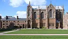 At Oxford, Butterfield designed Keble College, in a style radically divergent from the university's existing traditions of Gothic architecture, its walls boldly striped with various colours of brick. Intended for clerical students, it was largely built in 1868–70, on a fairly domestic scale, with a more monumental chapel of 1873–6. In his buildings of 1868–72 at Rugby School, the polychromy is even more brash.[2]
