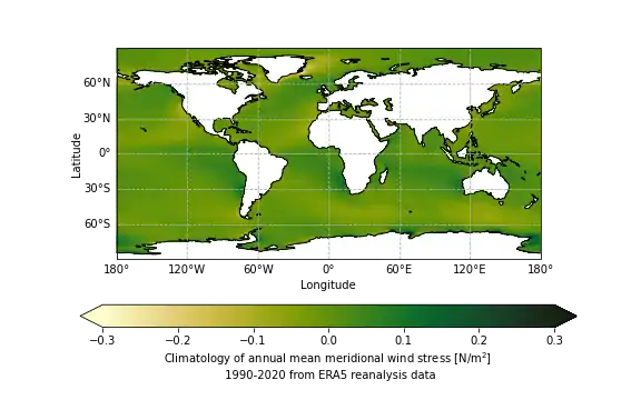 The global annual mean wind stress forces the global ocean circulation. Typical values for the wind stress are about 0.1Pa and, in general, the zonal wind stress is stronger than the meridional wind stress as can be seen in figures 2.1 and 2.2. It can also be seen that the largest values of the wind stress occur in the Southern Ocean for the zonal direction with values of about 0.3Pa. Figures 2.3 and 2.4 show that monthly variations in the wind stress patterns are only minor and the general patterns stay the same during the whole year. It can be seen that there are strong easterly winds (i.e. blowing toward the West), called easterlies or trade winds near the equator, very strong westerly winds at midlatitudes (between ±30° and ±60°), called westerlies, and weaker easterly winds at polar latitudes. Also, on a large annual scale, the wind-stress field is fairly zonally homogeneous. Important meridional wind stress patterns are northward (southward) currents on the eastern (western) coasts of continents in the Northern Hemisphere and on the western (eastern) coast in the Southern Hemisphere since these generate coastal upwelling which causes biological activity. Examples of such patterns can be observed in figure 2.2 on the East coast of North-America and on the West coast of South-America.[4][1]