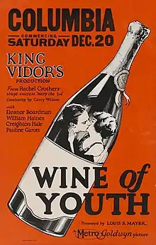 Wine of Youth is a 1924 American silent comedy drama film directed by King Vidor,[1] and released by Metro-Goldwyn-Mayer, shortly after the merger which created MGM in April 1924. Vidor did not consider it important enough to mention in his autobiography,[2] although it did advance the careers of three young stars-to-be: Ben Lyon, Eleanor Boardman, and William Haines.