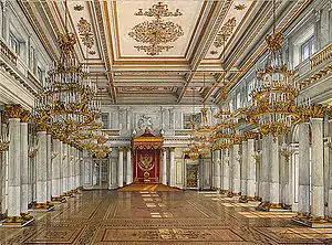 A second suite of state rooms running south to the Great Church was created for Catherine II. Between 1787 and 1795, Quarenghi added a new eastern wing to this suite which contained the great throne room, known as St George's Hall (13),[44] which linked the Winter Palace to Catherine's less formal palace, the Hermitage, next door. This suite was altered in the 1820s when the Military Gallery (11) was created from a series of small rooms, to celebrate the defeat of Napoleon. This gallery, which had been conceived by Alexander I, was designed by Carlo Rossi and was built between June and November 1826 under Nicolas I; it was inaugurated on 25 October 1826.[45] For the 1812 Gallery, the Tsar commissioned 332 portraits of the generals instrumental in the defeat of France. The artist was the Briton George Dawe, who received assistance from Alexander Polyakov and Wilhelm August Golicke.[31]