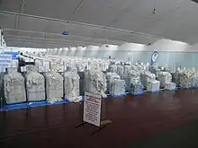 Packaging of wool has not changed much for centuries except that the early wool packs were made from jute, prior to the use of synthetic fibres. Jute packs were relatively heavy, weighing several kilograms each. In the 1960s polypropylene and high-density polyethylene packs were manufactured and used to make wool bales. Loose fibres from these packs caused contamination of the wool in the bale and led to nylon becoming the regulation fabric used in Australia.[1] In South Africa woven paper was tested but discontinued in 1973 due to poor wet strength and high cost.[2] Regulation standard white nylon packs now have a 280 mm (11 in) label sewn onto the top flap of the wool pack for inclusion of the farm brand, wool description, bale number, woolclasser stencil number and bin code. Each bale of wool packs contains 50 packs that measure 70 cm × 70 cm (27.6 in × 27.6 in) x 98 cm (38.6 in) and have 46 cm (18.1 in) flaps.[3]