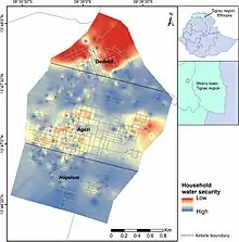 Map of Wukro town showing spatial distribution of household water security in August 2019. Red areas have low household water security.[19]