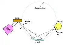 In wavelength-dispersive analysis, the fluorescent X-rays emitted by the sample are directed into a diffraction grating-based monochromator. The diffraction grating used is usually a single crystal. By varying the angle of incidence and take-off on the crystal, a small X-ray wavelength range can be selected. The wavelength obtained is given by Bragg's law: