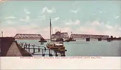 The scheme to construct the M&GN link was entitled the Lowestoft Junction Railway and entailed the construction of three viaducts: Breydon Viaduct over Breydon Water, a smaller viaduct across the River Bure and the Vauxhall Viaduct across the GER's East Suffolk line. In total, £159,758-12-4d (equivalent to £19.3 million in 2021[5]) was spent in constructing 2 miles 11 chains (3.4 km), not taking account of the costs of alterations made to Yarmouth Beach station to accommodate the new connection.[6] The track was at first double but became single for the 800 feet (240 m) Breydon Viaduct, now the most important engineering structure on the M&GN, before becoming double again to join the GER curve from Yarmouth South Town station at Gorleston North Junction.[7] The contractors for the line were Oliver & Sons of Rugby, and John Wilson from the GER was appointed as engineer.[8]