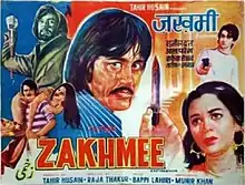 Zakhmee is a 1975 Hindi movie. Produced by Tahir Hussain, the film was directed by Raja Thakur.[1] It stars Sunil Dutt, Asha Parekh, Rakesh Roshan, Reena Roy, Tariq, Helen, Johnny Walker, Agha, Iftekhar in pivotal roles.[2] The music was composed by Bappi Lahiri, who later said that this film was his first claim to fame. The film performed "Above Average" at the box office, according to one source.[3]