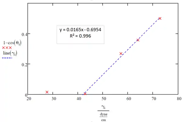 The data of the liquids given from the table above is then graphed on the Zisman Plot (Figure 2) with the independent variable as the surface tension of the liquid in dynes/cm and the dependent variable as 1-cos(θSL). There also are different variations of the Zisman plot since the Y-axis is unitless as seen in Table 1 and as mentioned above.