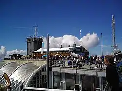 Three cable cars run to the top of the Zugspitze. The first, the Tyrolean Zugspitze Cable Car, was built in 1926 by the German company Adolf Bleichert & Co[6] and terminated on an arête below the summit at 2,805 m.a.s.l, the so-called Kammstation, before the terminus was moved to the actual summit at 2,951 m.a.s.l. in 1991. A rack railway, the Bavarian Zugspitze Railway, runs inside the northern flank of the mountain and ends on the Zugspitzplatt, from where a second cable car runs a short way down to the Schneefernerhaus, formerly a hotel, but since 1999 an environmental research station; a weather station opened there in 1900. The rack railway and the Eibsee Cable Car, the third cableway, transport an average of 500,000 people to the summit each year. In winter, nine ski lifts cover the ski area on the Zugspitzplatt.