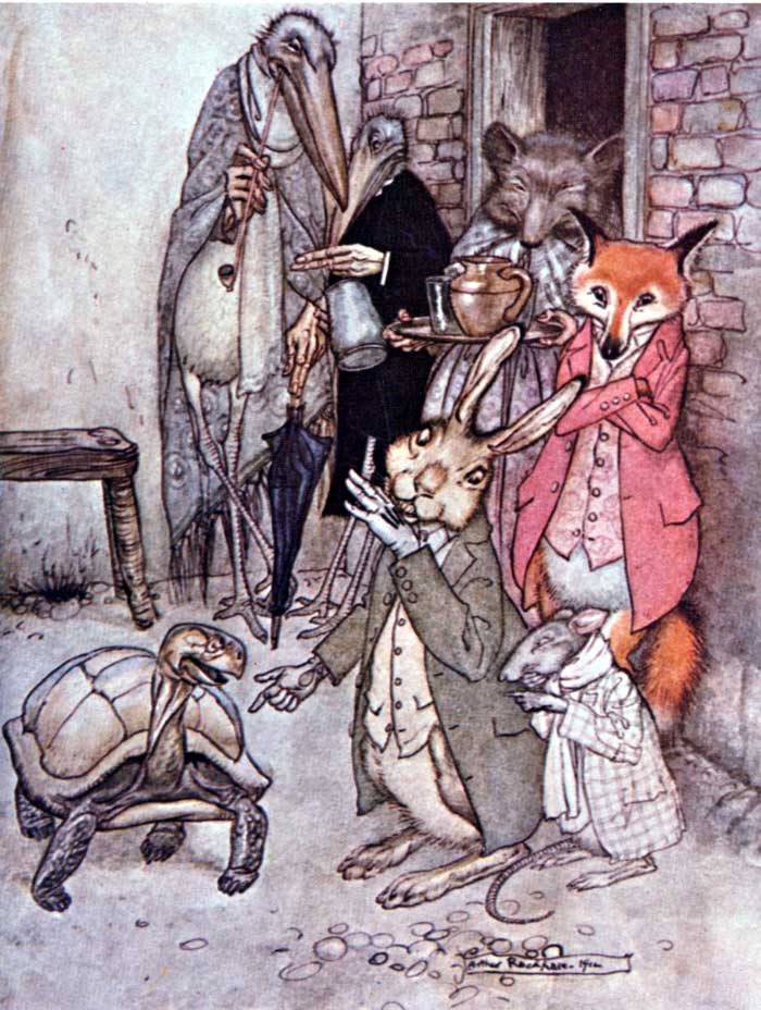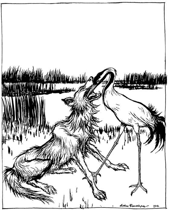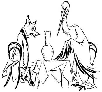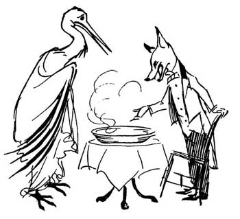 A Fox invited a Stork to dinner, at which the only fare provided was a large flat dish of soup. The Fox lapped it up with great relish, but the Stork with her long bill tried in vain to partake of the savoury broth. Her evident distress caused the sly Fox much amusement. But not long after the Stork invited him in turn, and set before him a pitcher with a long and narrow neck, into which she could get her bill with ease. Thus, while she enjoyed her dinner, the Fox sat by hungry and helpless, for it was impossible for him to reach the tempting contents of the vessel.