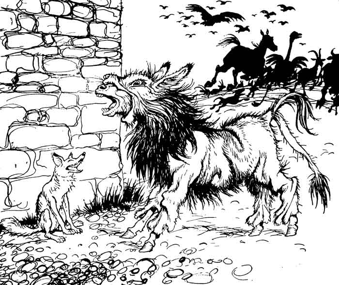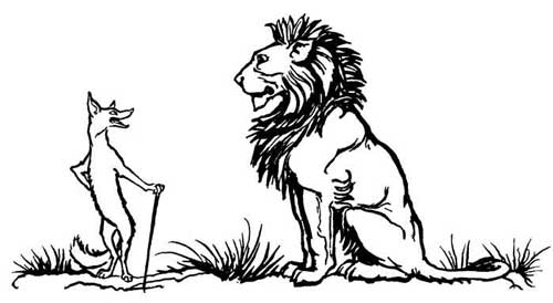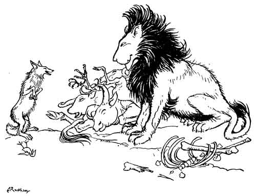 An Ass and a Fox went into partnership and sallied out to forage for food together. They hadn't gone far before they saw a Lion coming their way, at which they were both dreadfully frightened. But the Fox thought he saw a way of saving his own skin, and went boldly up to the Lion and whispered in his ear, "I'll manage that you shall get hold of the Ass without the trouble of stalking him, if you'll promise to let me go free." The Lion agreed to this, and the Fox then rejoined his companion and contrived before long to lead him by a hidden pit, which some hunter had dug as a trap for wild animals, and into which he fell. When the Lion saw that the Ass was safely caught and couldn't get away, it was to the Fox that he first turned his attention, and he soon finished him off, and then at his leisure proceeded to feast upon the Ass.