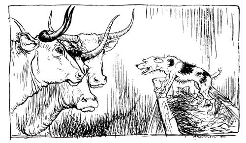 A Stag, chased from his lair by the hounds, took refuge in a farmyard, and, entering a stable where a number of oxen were stalled, thrust himself under a pile of hay in a vacant stall, where he lay concealed, all but the tips of his horns. Presently one of the Oxen said to him, "What has induced you to come in here? Aren't you aware of the risk you are running of being captured by the herdsmen?" To which he replied, "Pray let me stay for the present. When night comes I shall easily escape under cover of the dark." In the course of the afternoon more than one of the farm-hands came in, to attend to the wants of the cattle, but not one of them noticed the presence of the Stag, who accordingly began to congratulate himself on his escape and to express his gratitude to the Oxen. "We wish you well," said the one who had spoken before, "but you are not out of danger yet. If the master comes, you will certainly be found out, for nothing ever escapes his keen eyes." Presently, sure enough, in he came, and made a great to-do about the way the Oxen were kept. "The beasts are starving," he cried; "here, give them more hay, and put plenty of litter under them." As he spoke, he seized an armful himself from the pile where the Stag lay concealed, and at once detected him. Calling his men, he had him seized at once and killed for the table.