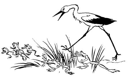 Some mischievous Boys were playing on the edge of a pond, and, catching sight of some Frogs swimming about in the shallow water, they began to amuse themselves by pelting them with stones, and they killed several of them. At last one of the Frogs put his head out of the water and said, "Oh, stop! stop! I beg of you: what is sport to you is death to us."