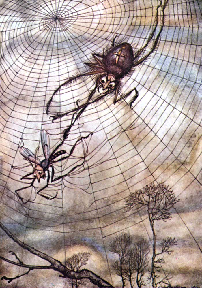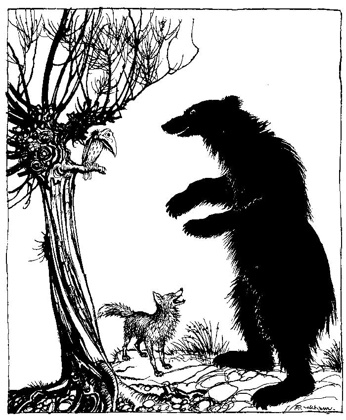 A Crow was sitting on a branch of a tree with a piece of cheese in her beak when a Fox observed her and set his wits to work to discover some way of getting the cheese. Coming and standing under the tree he looked up and said, "What a noble bird I see above me! Her beauty is without equal, the hue of her plumage exquisite. If only her voice is as sweet as her looks are fair, she ought without doubt to be Queen of the Birds." The Crow was hugely flattered by this, and just to show the Fox that she could sing she gave a loud caw. Down came the cheese, of course, and the Fox, snatching it up, said, "You have a voice, madam, I see: what you want is wits."