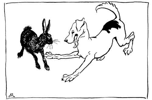 The Hares once gathered together and lamented the unhappiness of their lot, exposed as they were to dangers on all sides and lacking the strength and the courage to hold their own. Men, dogs, birds and beasts of prey were all their enemies, and killed and devoured them daily: and sooner than endure such persecution any longer, they one and all determined to end their miserable lives. Thus resolved and desperate, they rushed in a body towards a neighbouring pool, intending to drown themselves. On the bank were sitting a number of Frogs, who, when they heard the noise of the Hares as they ran, with one accord leaped into the water and hid themselves in the depths. Then one of the older Hares who was wiser than the rest cried out to his companions, "Stop, my friends, take heart; don't let us destroy ourselves after all: see, here are creatures who are afraid of us, and who must, therefore, be still more timid than ourselves."