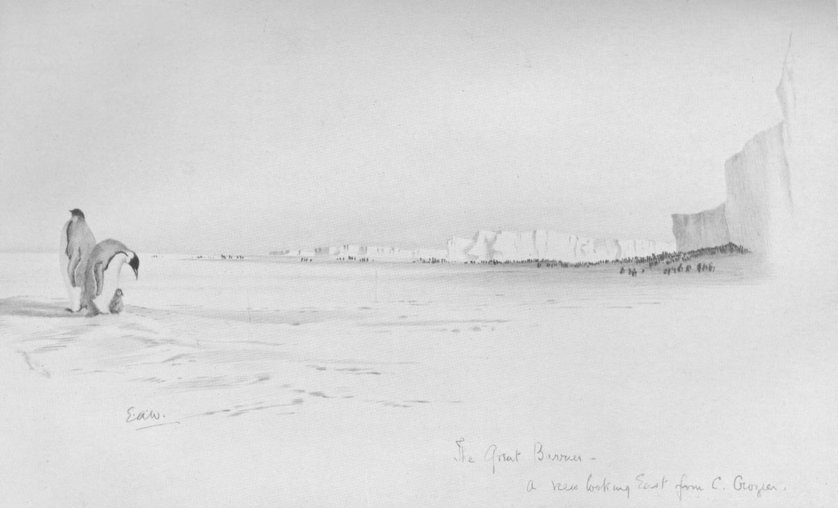 "We started down the slope in a wind which was rising all the time and -15°. My job was to balance the sledge behind: I was so utterly done I don't believe I could have pulled effectively. Birdie was much the strongest of us. The strain and want of sleep was getting me in the neck, and Bill looked very bad. At the bottom we turned our faces to the Barrier, our backs to the penguins, but after doing about a mile it looked so threatening in the south that we camped in a big wind, our hands going one after the other. We had nothing but the hardest wind-swept sastrugi, and it was a long business: there was only the smallest amount of drift, and we were afraid the icy snow blocks would chafe the tent. Birdie lashed the full biscuit tin to the door to prevent its flapping, and also got what he called the tent downhaul round the cap and then tied it about himself outside his bag: if the tent went he was going too.