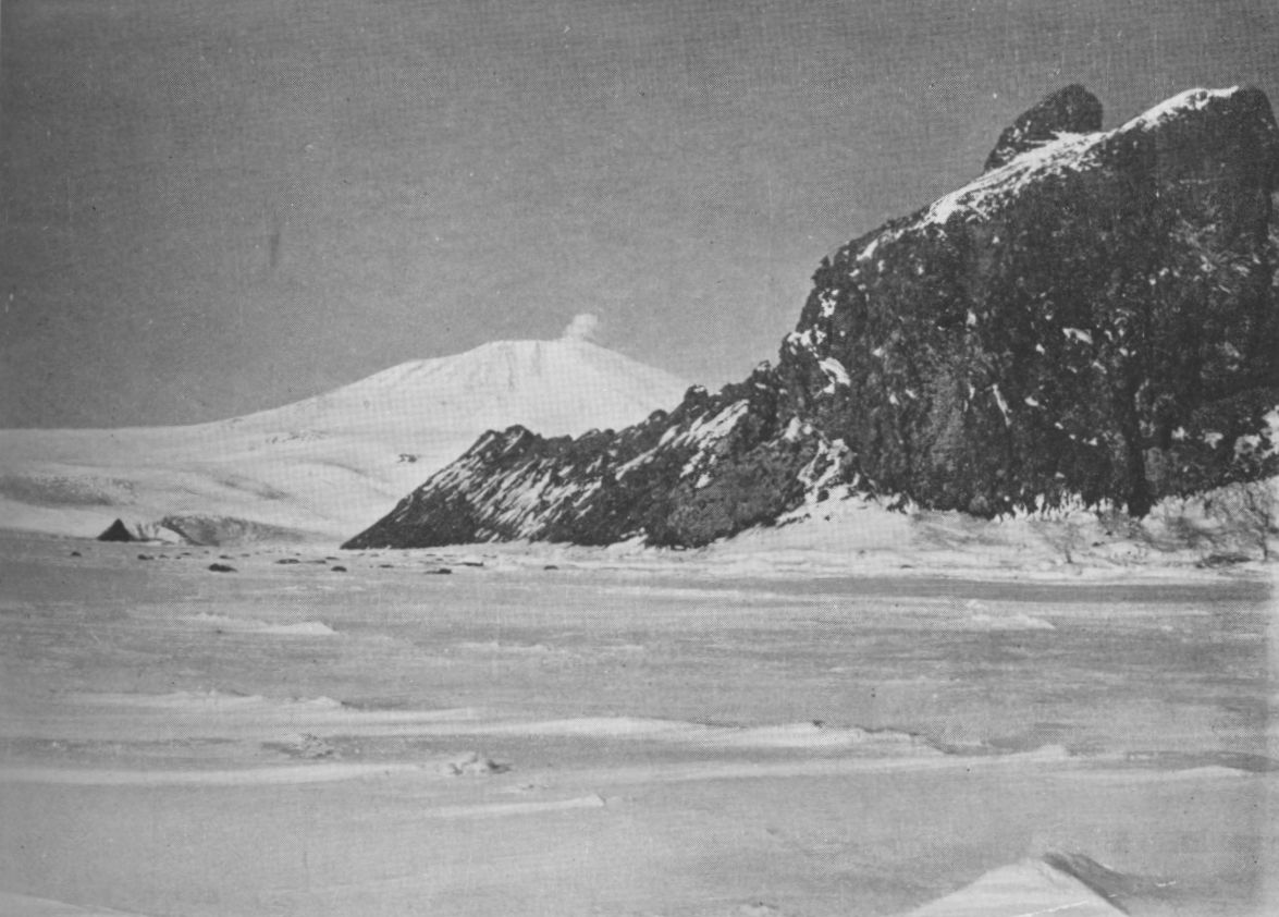 It was -49° in the night and we were away early in -47°. By mid-day we were rising Terror Point, opening Erebus rapidly, and got the first really light day, though the sun would not appear over the horizon for another month. I cannot describe what a relief the light was to us. We crossed the point outside our former track, and saw inside us the ridges where we had been blizzed for three days on our outward journey.