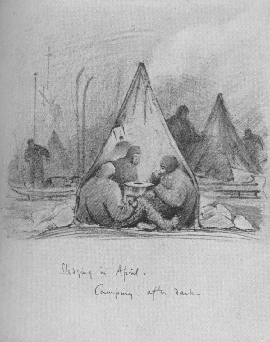 "I was feeling as if I should crack, and accepted Birdie's eider-down. It was wonderfully self-sacrificing of him: more than I can write. I felt a brute to take it, but I was getting useless unless I got some sleep which my big bag would not allow. Bill and Birdie kept on telling me to do less: that I was doing more than my share of the work: but I think that I was getting more and more weak. Birdie kept wonderfully strong: he slept most of the night: the difficulty for him was to get into his bag without going to sleep. He kept the meteorological log untiringly, but some of these nights he had to give it up for the time because he could not keep awake. He used to fall asleep with his pannikin in his hand and let it fall: and sometimes he had the primus.
