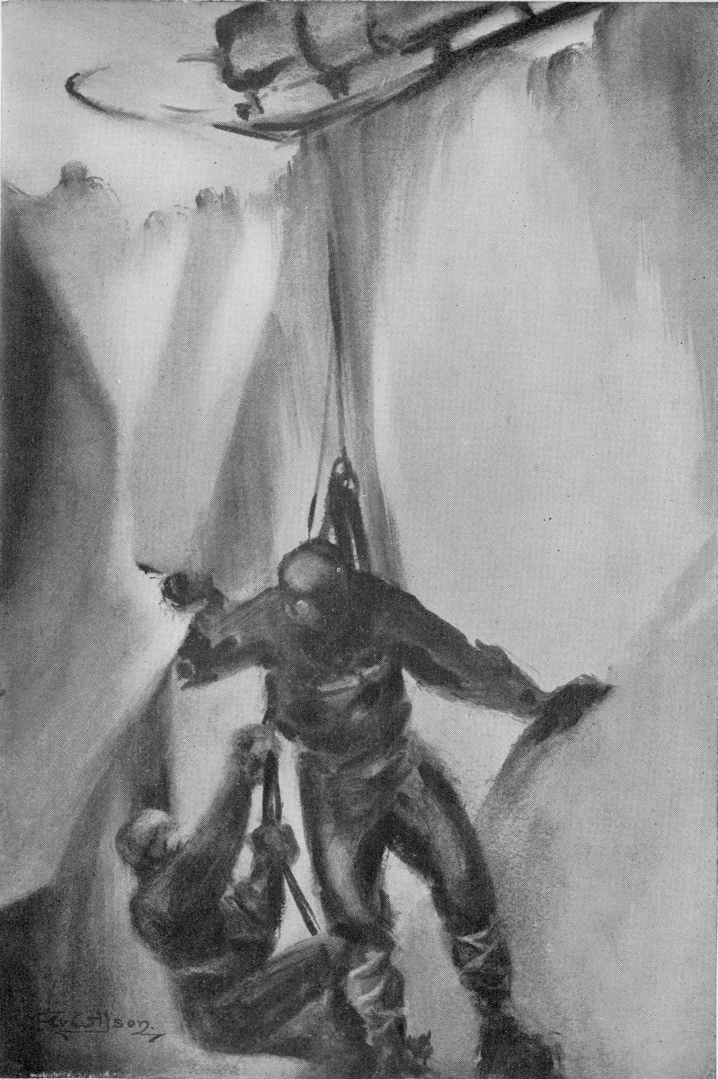 "My helmet was so frozen up," wrote Bowers, "that my head was encased in a solid block of ice, and I could not look down without inclining my whole body. As a result Bill stumbled one foot into a crevasse and I landed in it with both mine [even as I shouted a warning[165] ], the bridge gave way and down I went. Fortunately our sledge harness is made with a view to resisting this sort of thing, and there I hung with the bottomless pit below and the ice-crusted sides alongside, so narrow that to step over it would have been quite easy had I been able to see it. Bill said, 'What do you want?' I asked for an Alpine rope with a bowline for my foot: and taking up first the bowline and then my harness they got me out."[166] Meanwhile on the surface I lay over the crevasse and gave Birdie the bowline: he put it on his foot: then he raised his foot, giving me some slack: I held the rope while he raised himself on his foot, thus giving Bill some slack on the harness: Bill then held the harness, allowing Birdie to raise his foot and give me some slack again. We got him up inch by inch, our fingers getting bitten, for the temperature was -46°. Afterwards we often used this way of getting people out of crevasses, and it was a wonderful piece of presence of mind that it was invented, so far as I know, on the spur of the moment by a frozen man hanging in one himself.