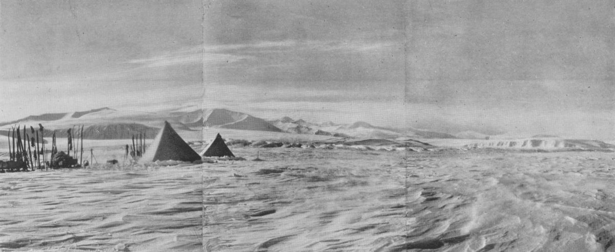 | Our night Camp at the foot of the Buckley Island ice-falls. December 20, 1911. Buckley Island in the background. Note ablation pits in the snow. | 364 | |