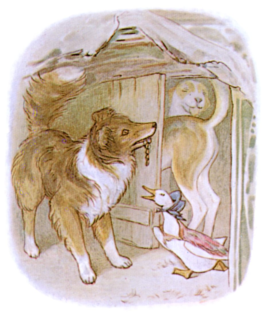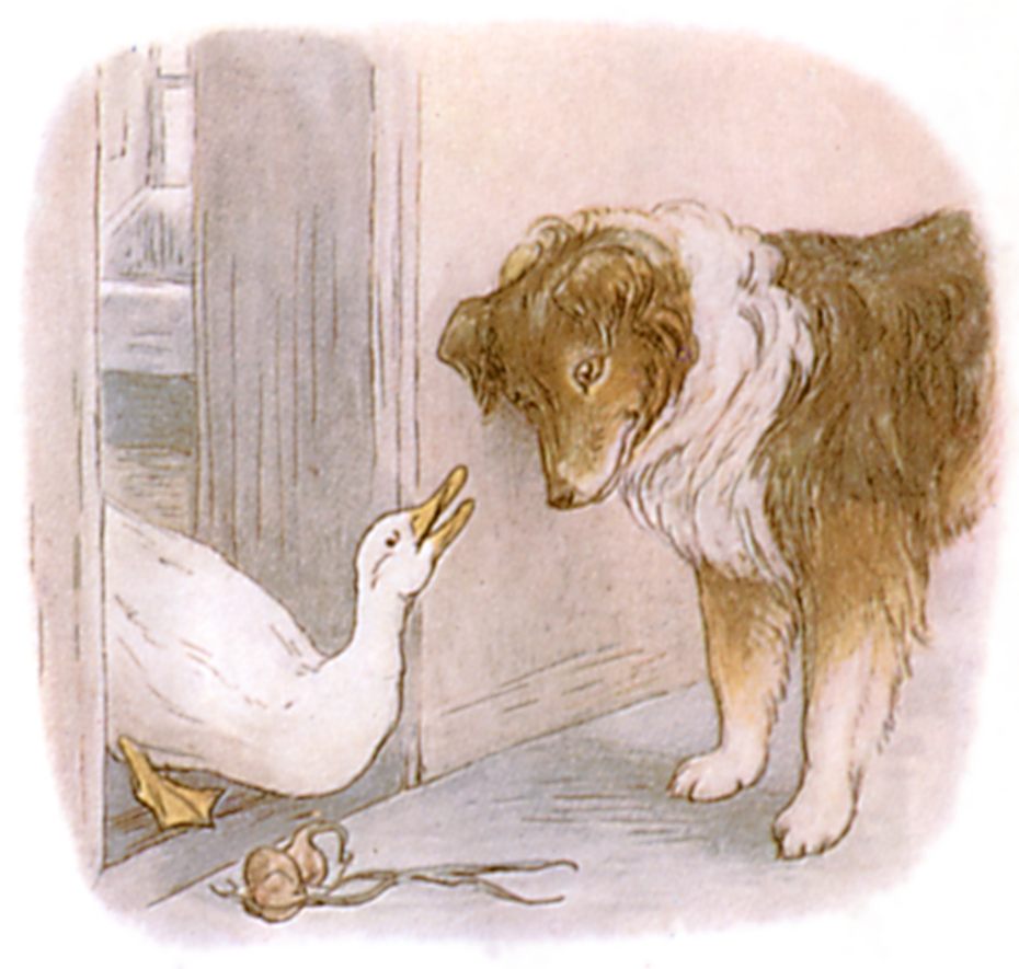 The collie-dog Kep met her coming out, "What are you doing with those onions? Where do you go every afternoon by yourself, Jemima Puddle-duck?"