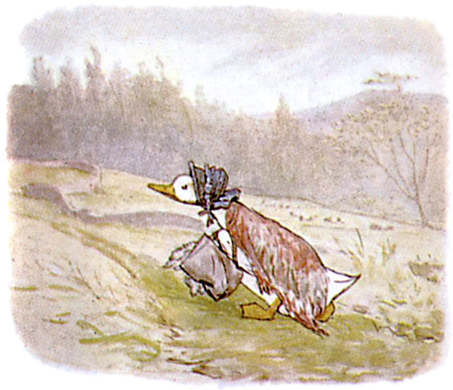 Jemima Puddle-duck became quite desperate. She determined to make a nest right away from the farm.