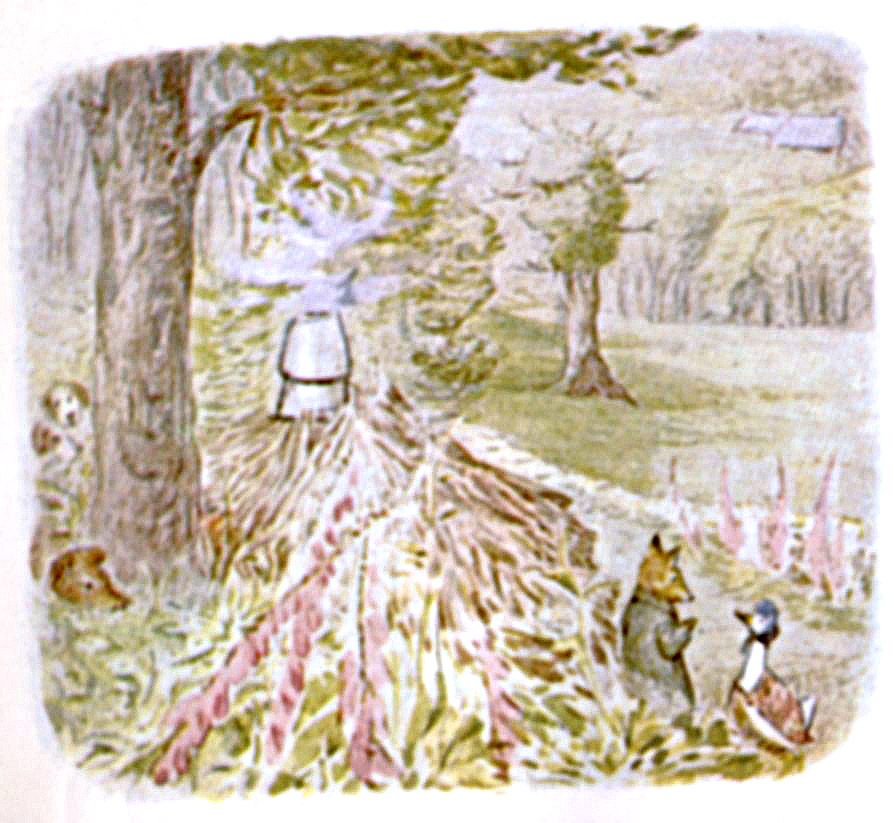 Jemima alighted rather heavily, and began to waddle about in search of a convenient dry nesting-place. She rather fancied a tree-stump amongst some tall fox-gloves.