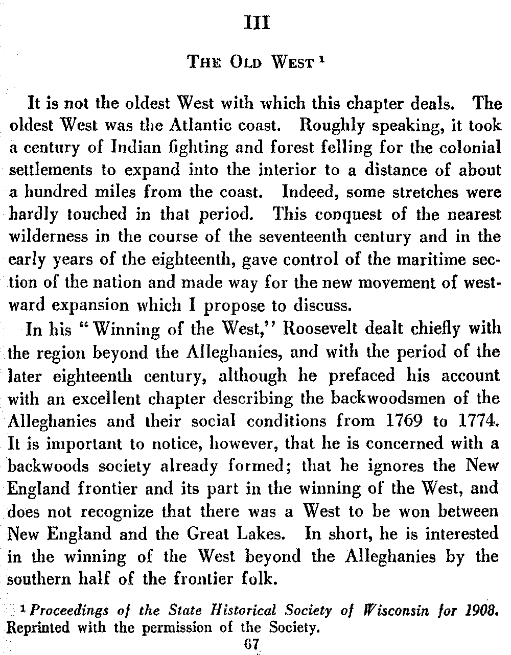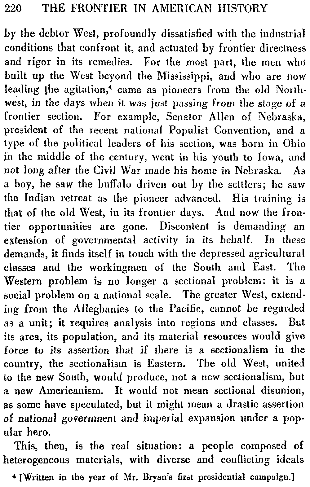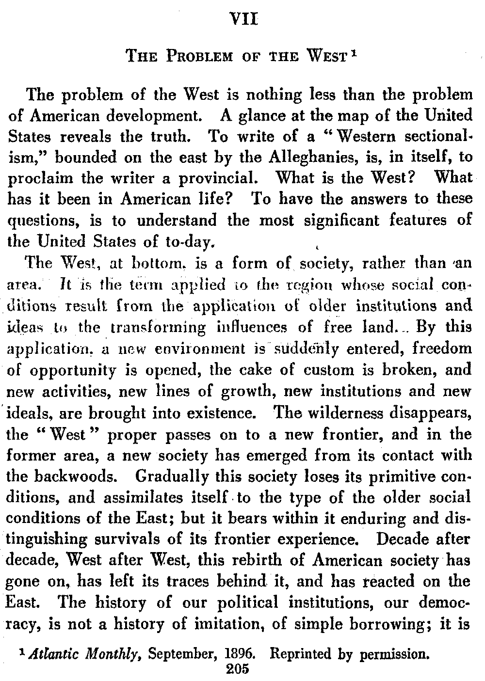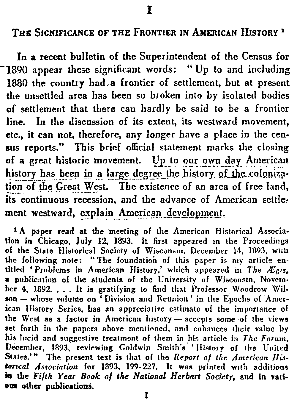 In a recent bulletin of the Superintendent of the Census for 1890 appear these significant words: "Up to and including 1880 the country had a frontier of settlement, but at present the unsettled area has been so broken into by isolated bodies of settlement that there can hardly be said to be a frontier line. In the discussion of its extent, its westward movement, etc., it can not, therefore, any longer have a place in the census reports." This brief official statement marks the closing of a great historic movement. Up to our own day American history has been in a large degree the history of the colonization of the Great West. The existence of an area of free land, its continuous recession, and the advance of American settlement westward, explain American development.
