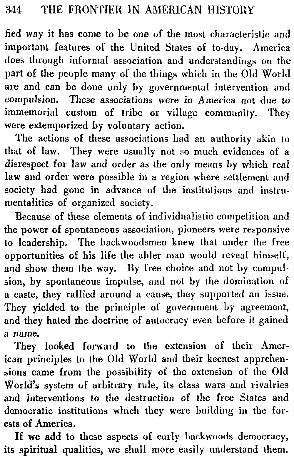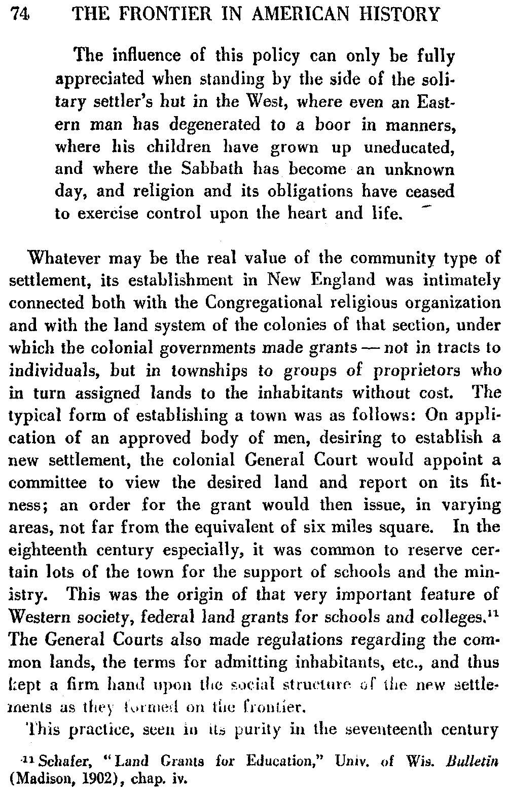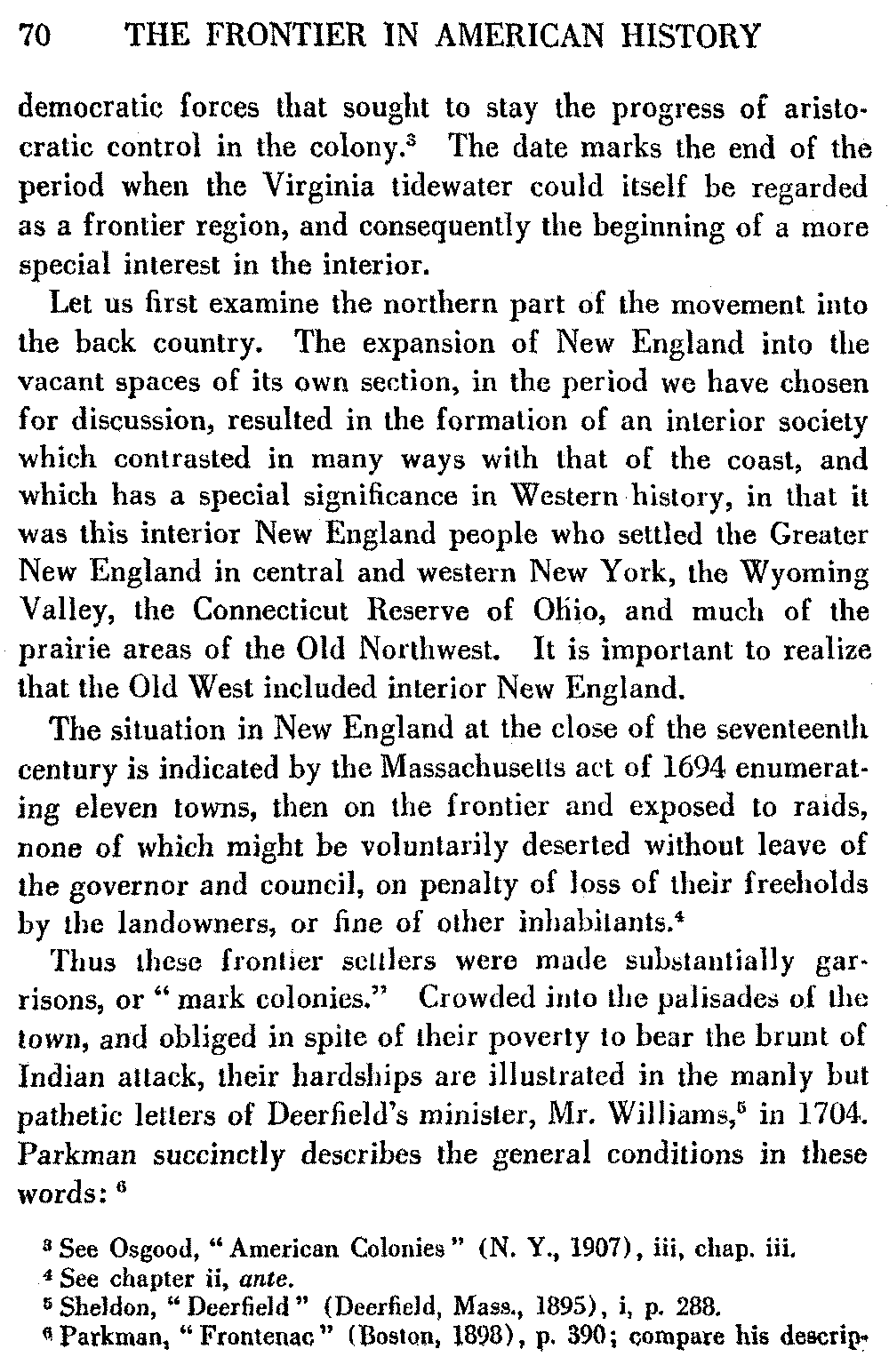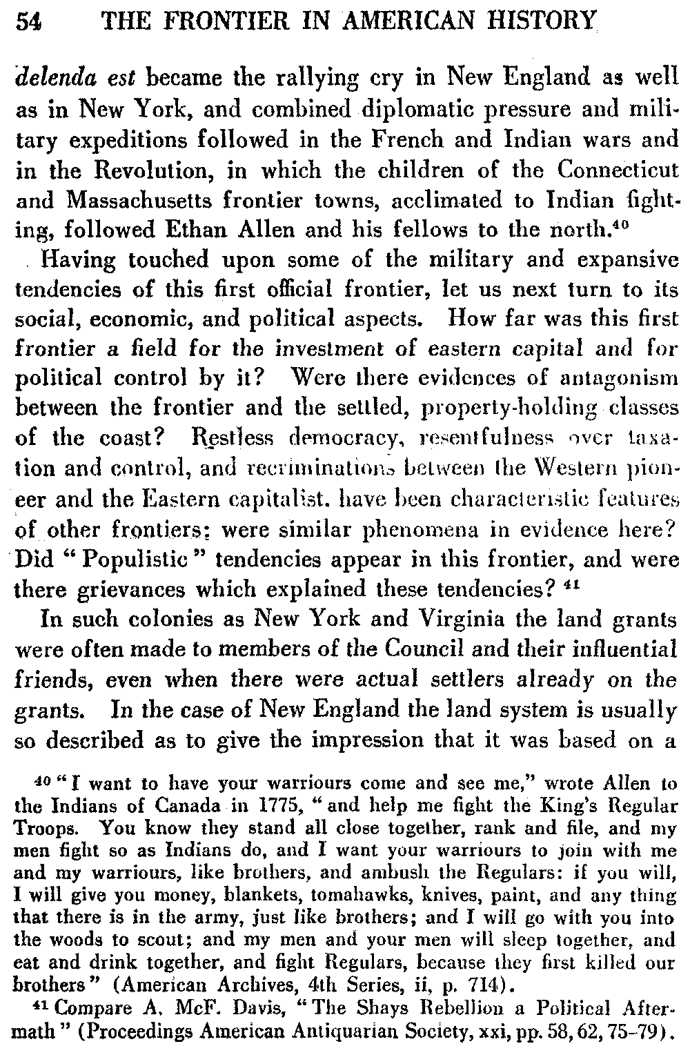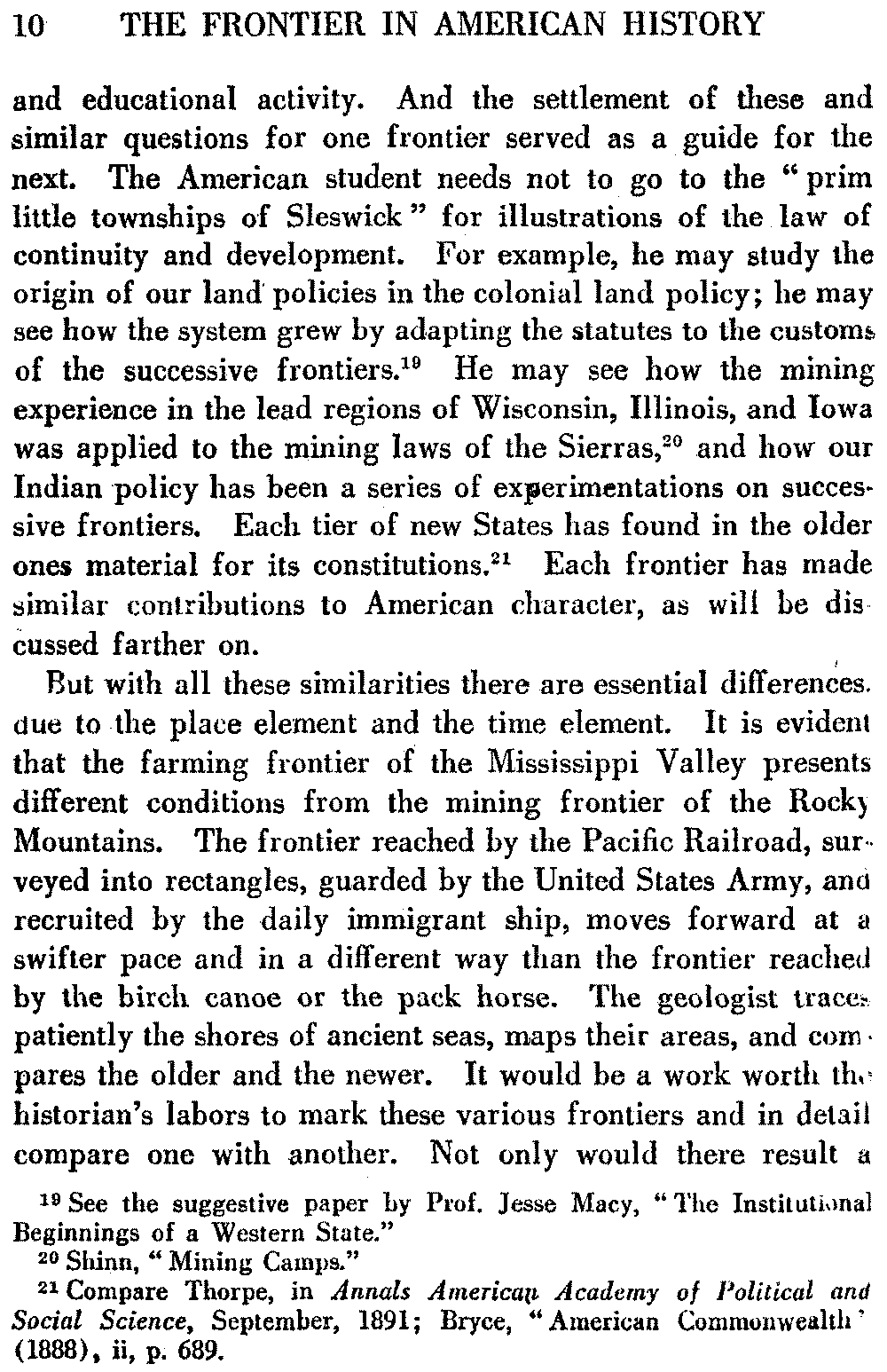 At the Atlantic frontier one can study the germs of processes repeated at each successive frontier. We have the complex European life sharply precipitated by the wilderness into the simplicity of primitive conditions. The first frontier had to meet its Indian question, its question of the disposition of the public domain, of the means of intercourse with older settlements, of the extension of political organization, of religious [10]and educational activity. And the settlement of these and similar questions for one frontier served as a guide for the next. The American student needs not to go to the "prim little townships of Sleswick" for illustrations of the law of continuity and development. For example, he may study the origin of our land policies in the colonial land policy; he may see how the system grew by adapting the statutes to the customs of the successive frontiers.[10:1] He may see how the mining experience in the lead regions of Wisconsin, Illinois, and Iowa was applied to the mining laws of the Sierras,[10:2] and how our Indian policy has been a series of experimentations on successive frontiers. Each tier of new States has found in the older ones material for its constitutions.[10:3] Each frontier has made similar contributions to American character, as will be discussed farther on.