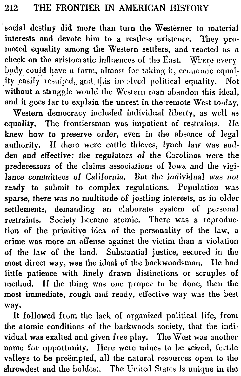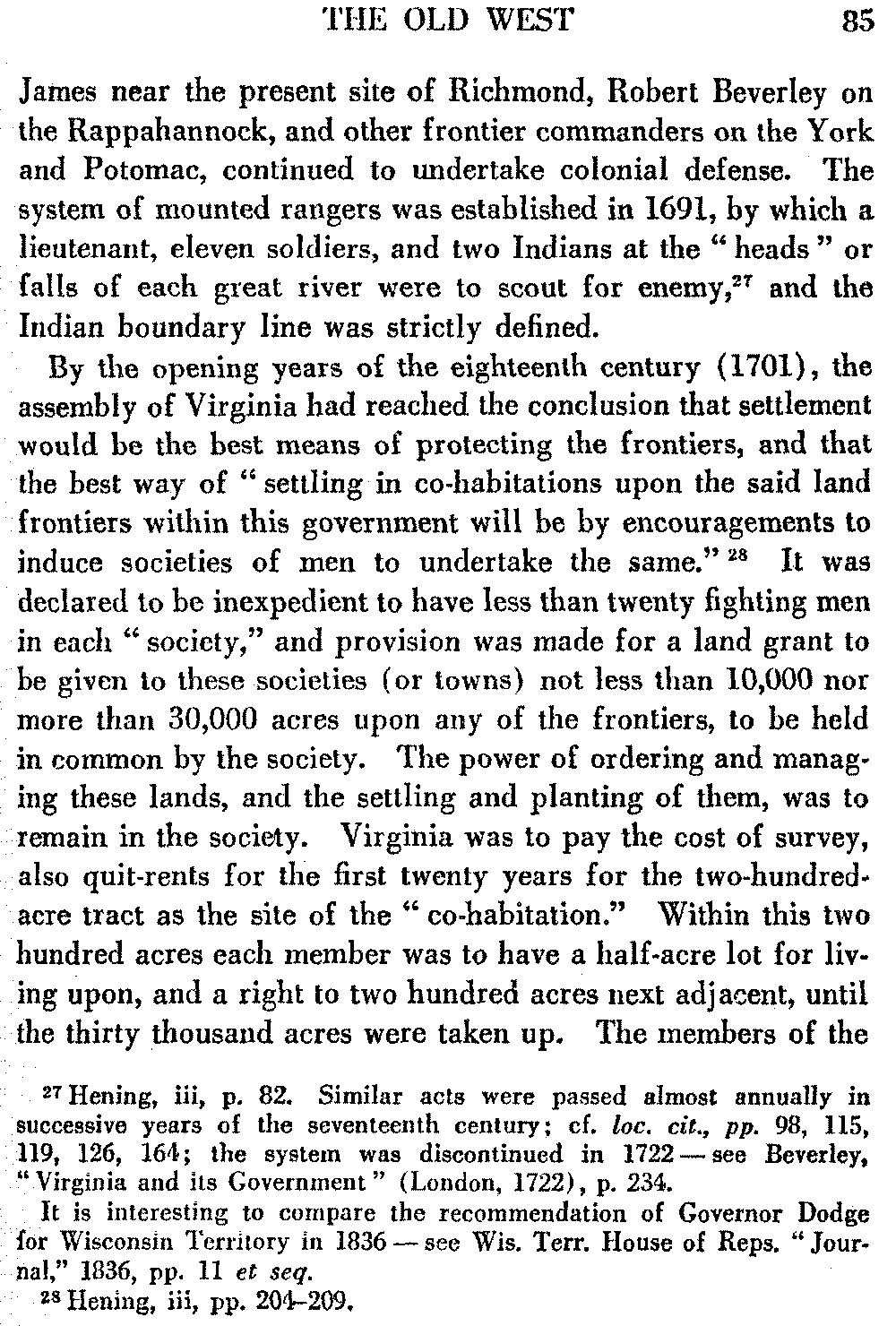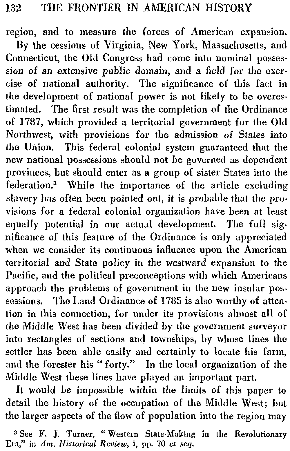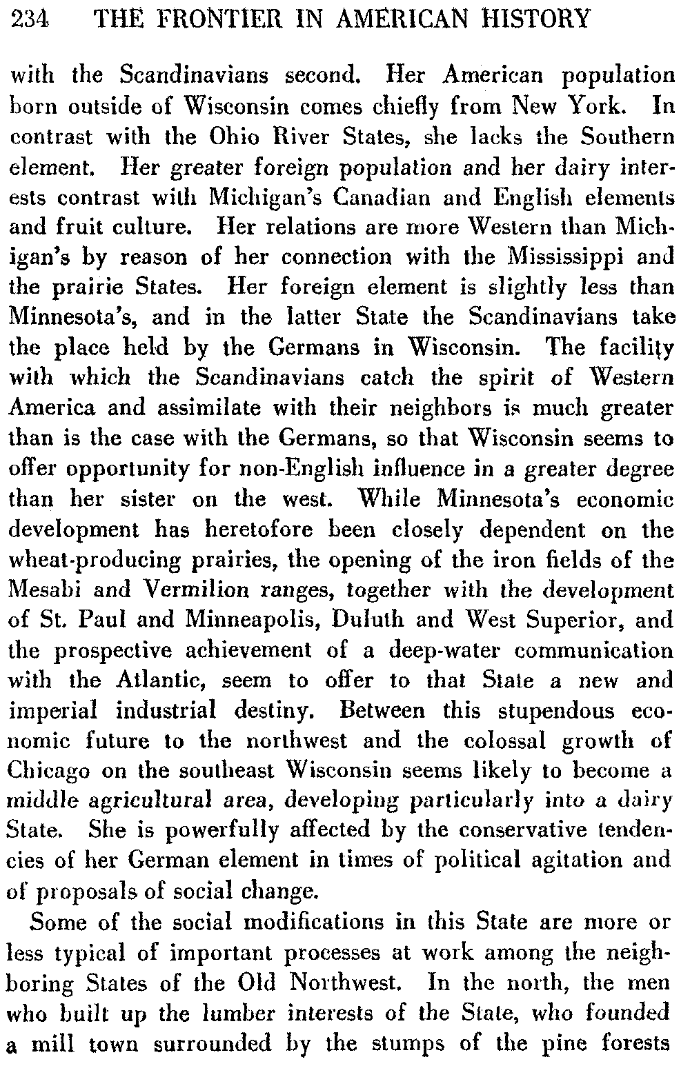 At the Atlantic frontier one can study the germs of processes repeated at each successive frontier. We have the complex European life sharply precipitated by the wilderness into the simplicity of primitive conditions. The first frontier had to meet its Indian question, its question of the disposition of the public domain, of the means of intercourse with older settlements, of the extension of political organization, of religious [10]and educational activity. And the settlement of these and similar questions for one frontier served as a guide for the next. The American student needs not to go to the "prim little townships of Sleswick" for illustrations of the law of continuity and development. For example, he may study the origin of our land policies in the colonial land policy; he may see how the system grew by adapting the statutes to the customs of the successive frontiers.[10:1] He may see how the mining experience in the lead regions of Wisconsin, Illinois, and Iowa was applied to the mining laws of the Sierras,[10:2] and how our Indian policy has been a series of experimentations on successive frontiers. Each tier of new States has found in the older ones material for its constitutions.[10:3] Each frontier has made similar contributions to American character, as will be discussed farther on.
