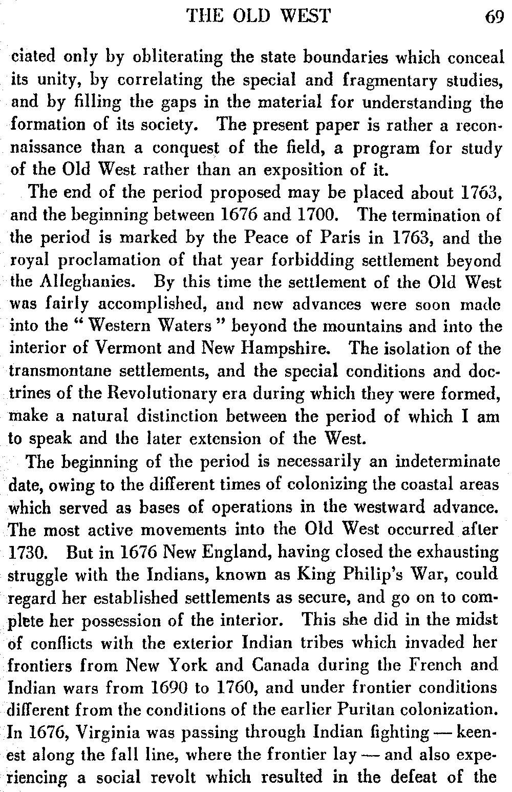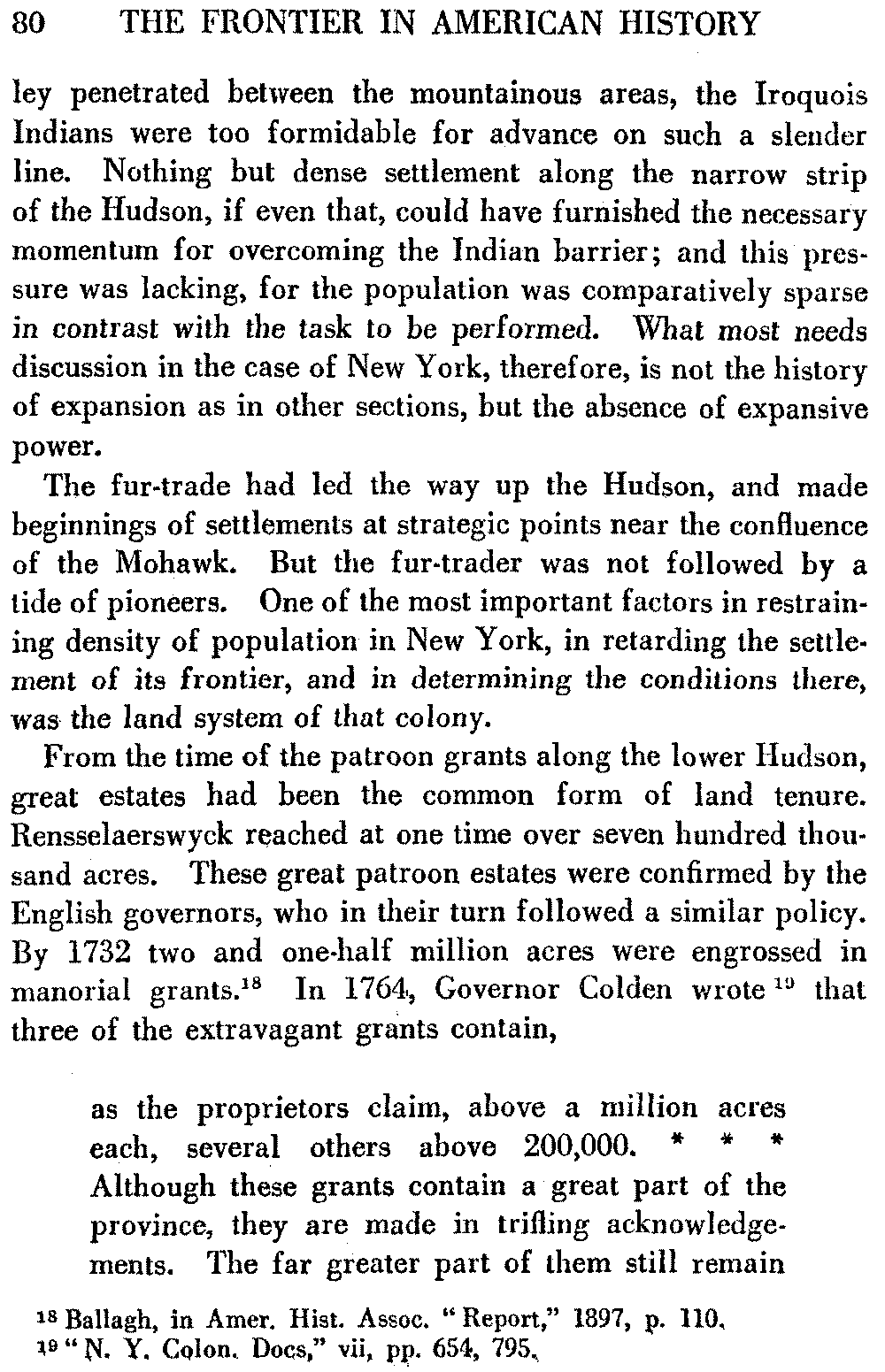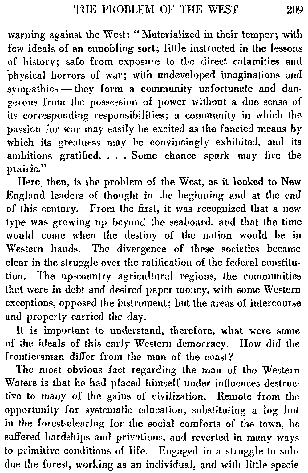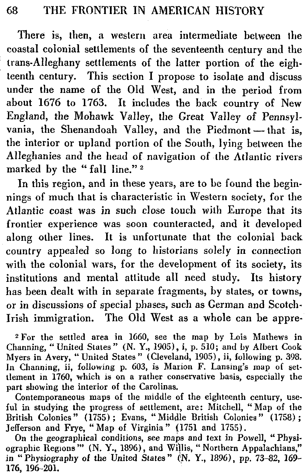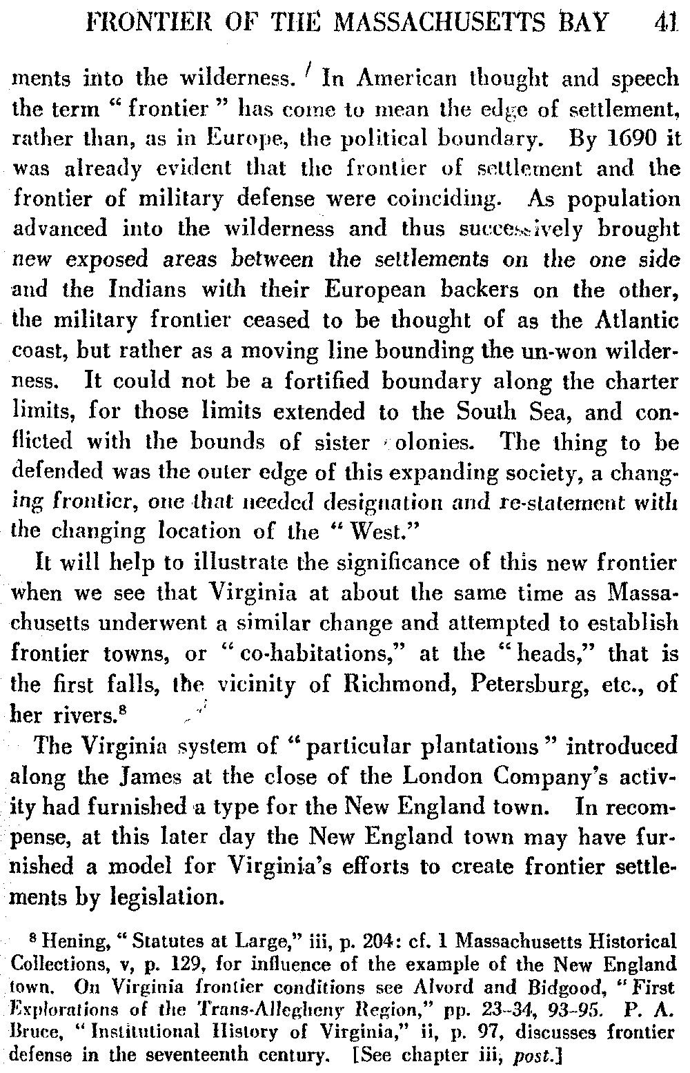 At the Atlantic frontier one can study the germs of processes repeated at each successive frontier. We have the complex European life sharply precipitated by the wilderness into the simplicity of primitive conditions. The first frontier had to meet its Indian question, its question of the disposition of the public domain, of the means of intercourse with older settlements, of the extension of political organization, of religious [10]and educational activity. And the settlement of these and similar questions for one frontier served as a guide for the next. The American student needs not to go to the "prim little townships of Sleswick" for illustrations of the law of continuity and development. For example, he may study the origin of our land policies in the colonial land policy; he may see how the system grew by adapting the statutes to the customs of the successive frontiers.[10:1] He may see how the mining experience in the lead regions of Wisconsin, Illinois, and Iowa was applied to the mining laws of the Sierras,[10:2] and how our Indian policy has been a series of experimentations on successive frontiers. Each tier of new States has found in the older ones material for its constitutions.[10:3] Each frontier has made similar contributions to American character, as will be discussed farther on.