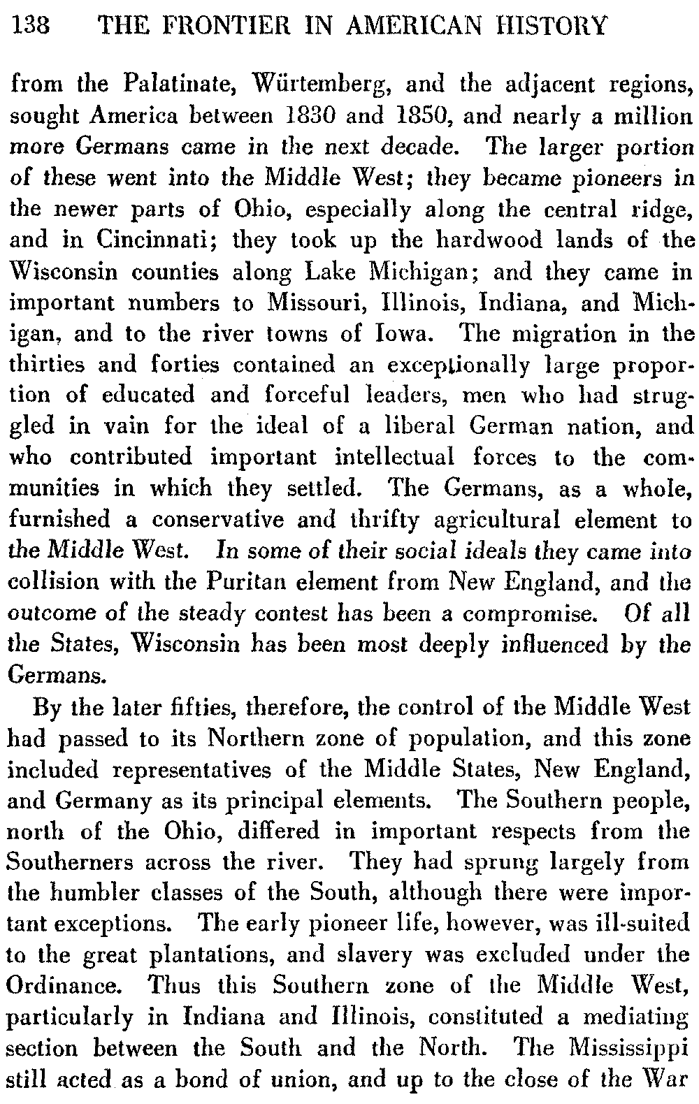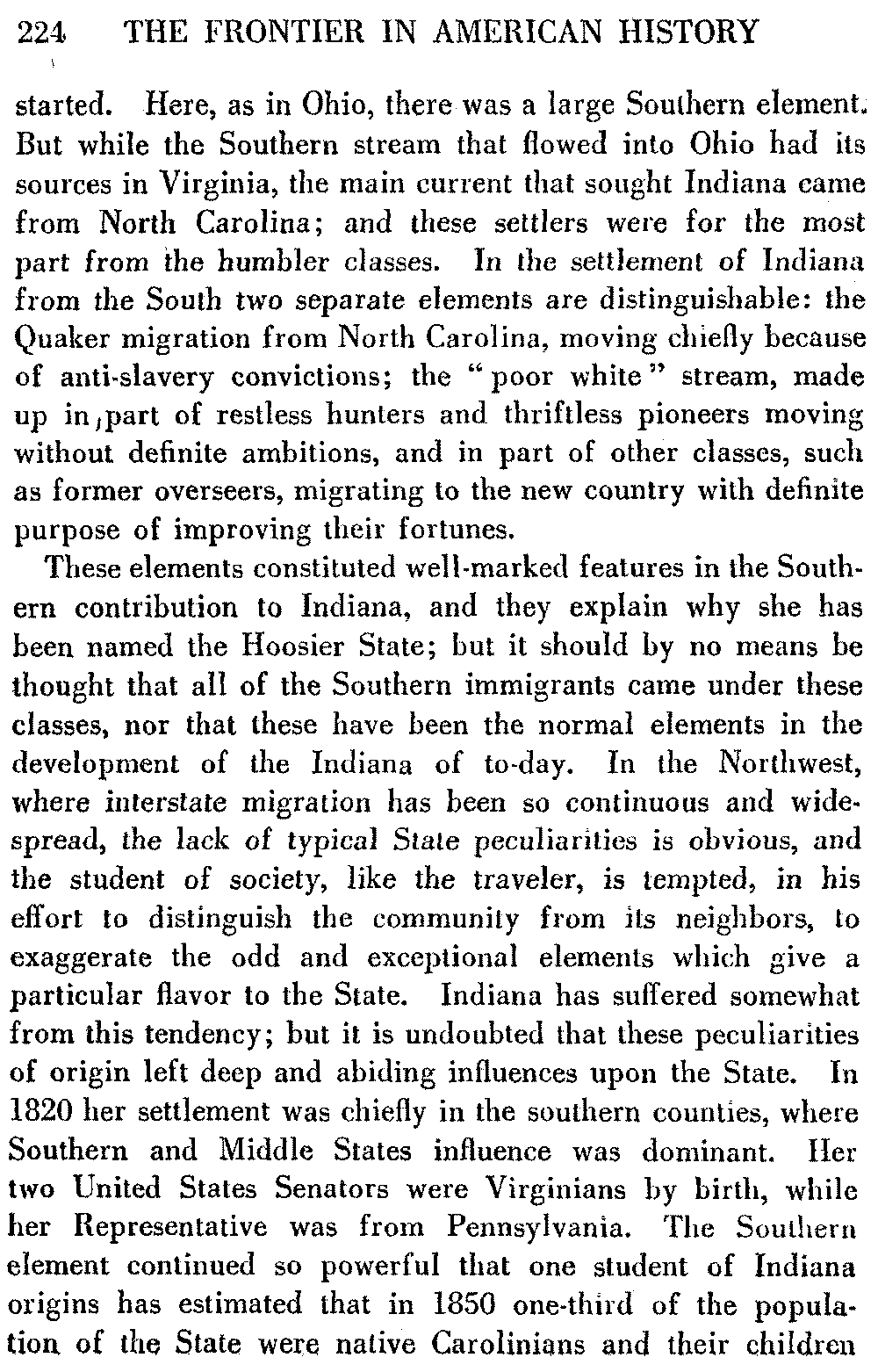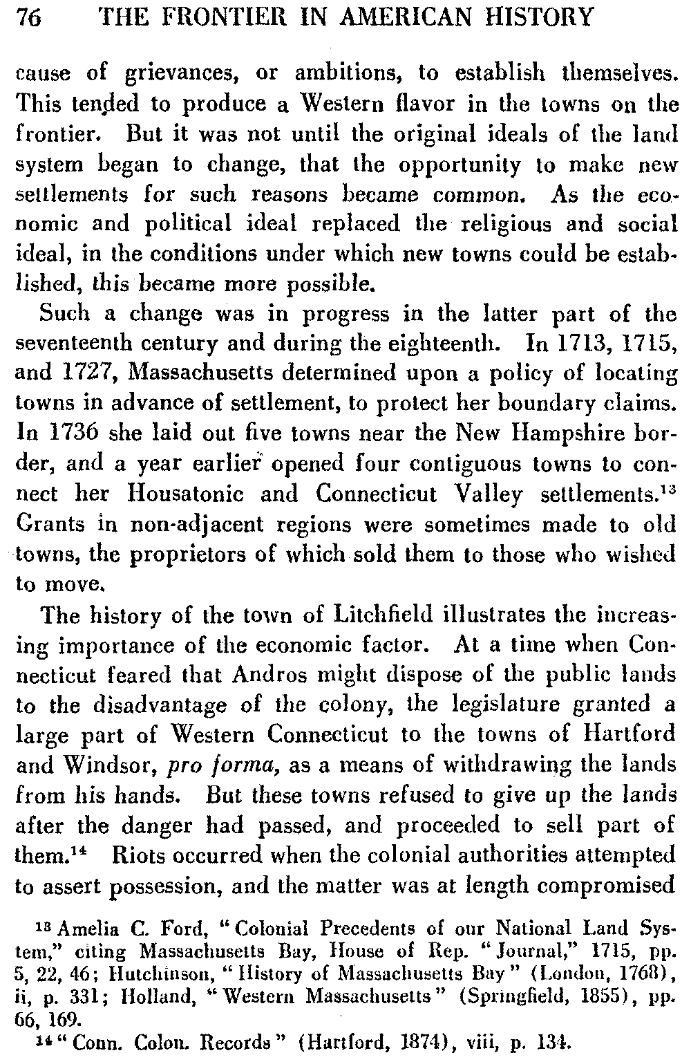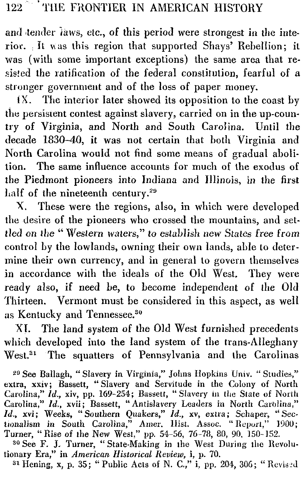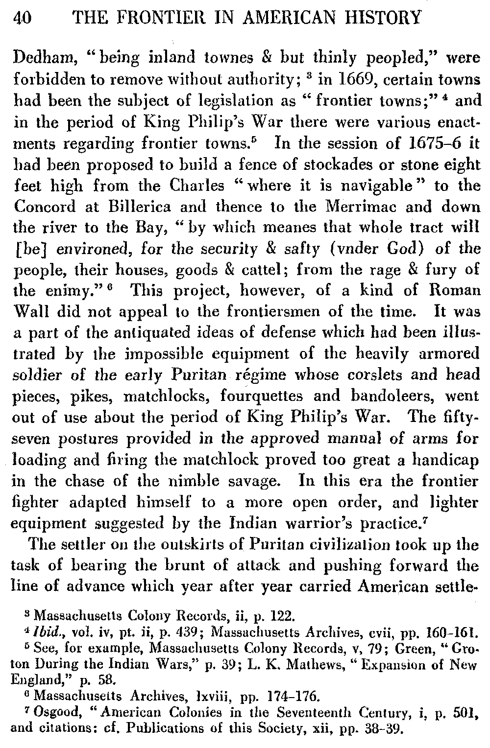 At the Atlantic frontier one can study the germs of processes repeated at each successive frontier. We have the complex European life sharply precipitated by the wilderness into the simplicity of primitive conditions. The first frontier had to meet its Indian question, its question of the disposition of the public domain, of the means of intercourse with older settlements, of the extension of political organization, of religious [10]and educational activity. And the settlement of these and similar questions for one frontier served as a guide for the next. The American student needs not to go to the "prim little townships of Sleswick" for illustrations of the law of continuity and development. For example, he may study the origin of our land policies in the colonial land policy; he may see how the system grew by adapting the statutes to the customs of the successive frontiers.[10:1] He may see how the mining experience in the lead regions of Wisconsin, Illinois, and Iowa was applied to the mining laws of the Sierras,[10:2] and how our Indian policy has been a series of experimentations on successive frontiers. Each tier of new States has found in the older ones material for its constitutions.[10:3] Each frontier has made similar contributions to American character, as will be discussed farther on.