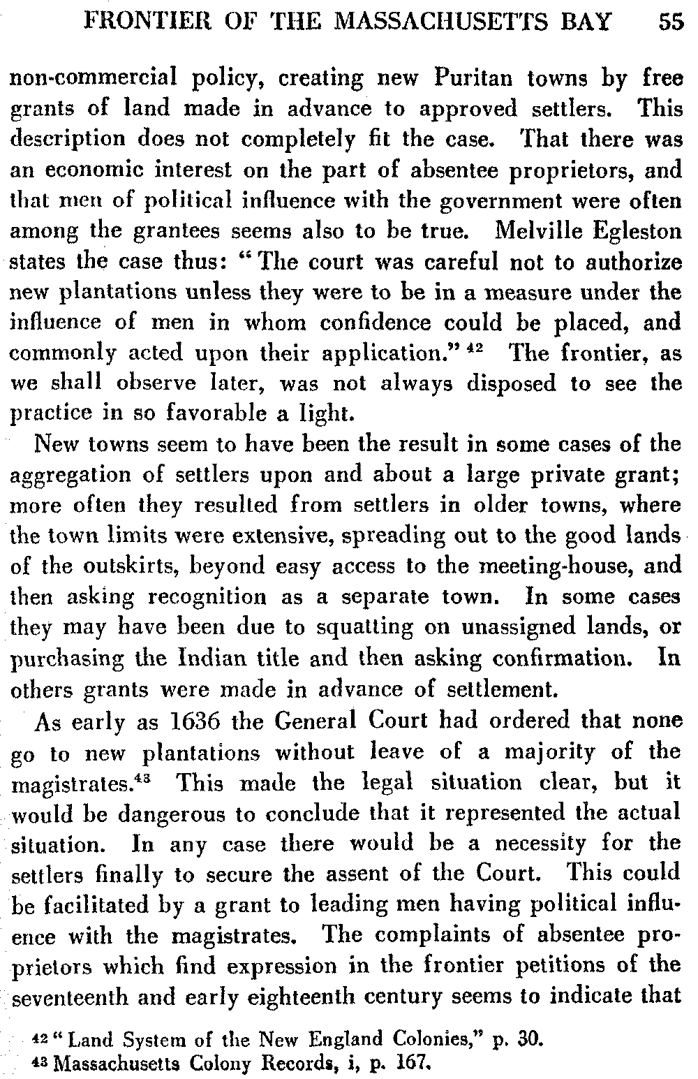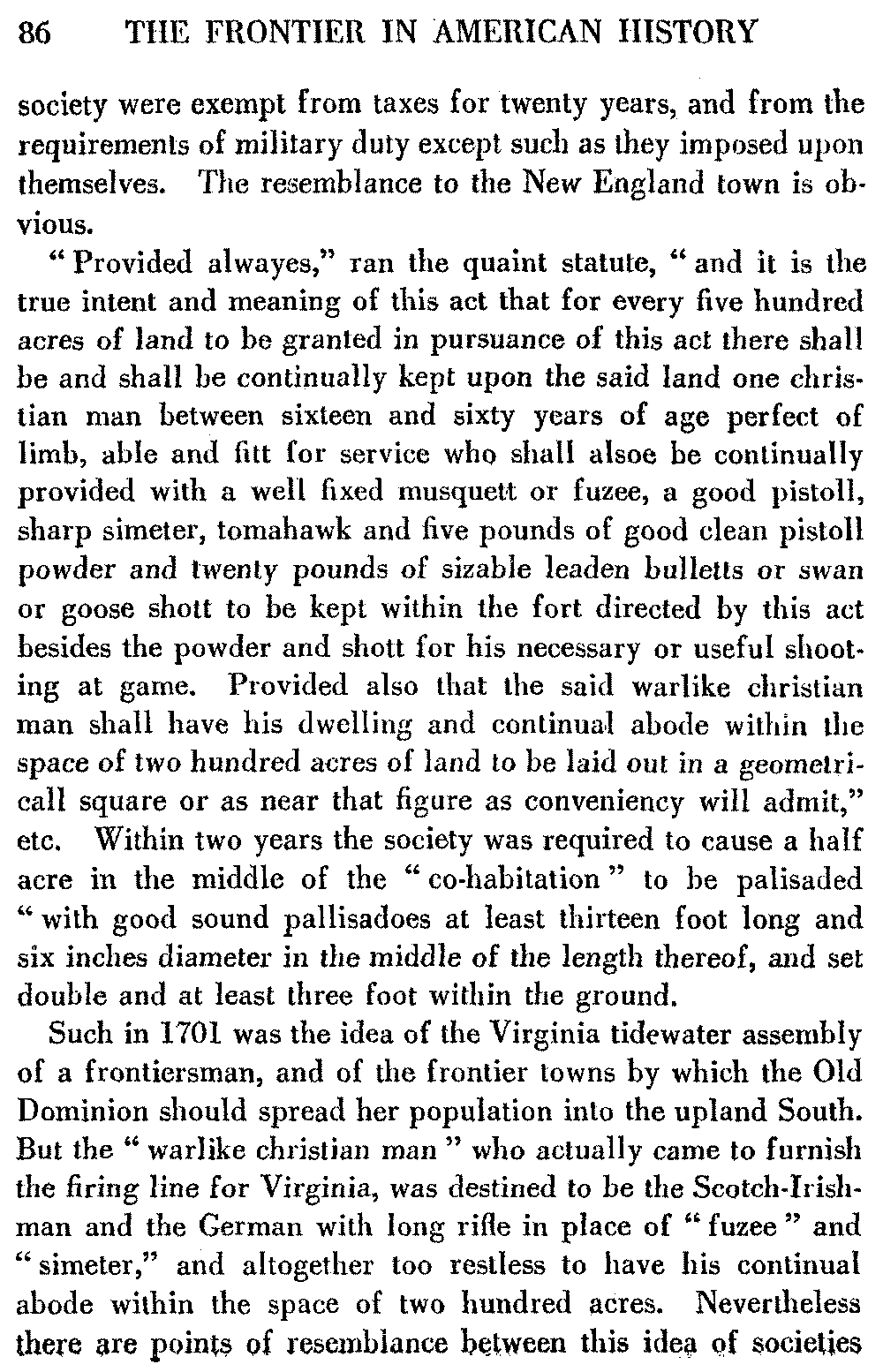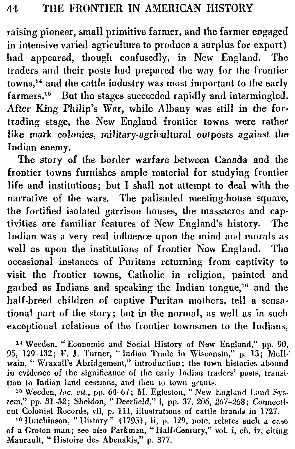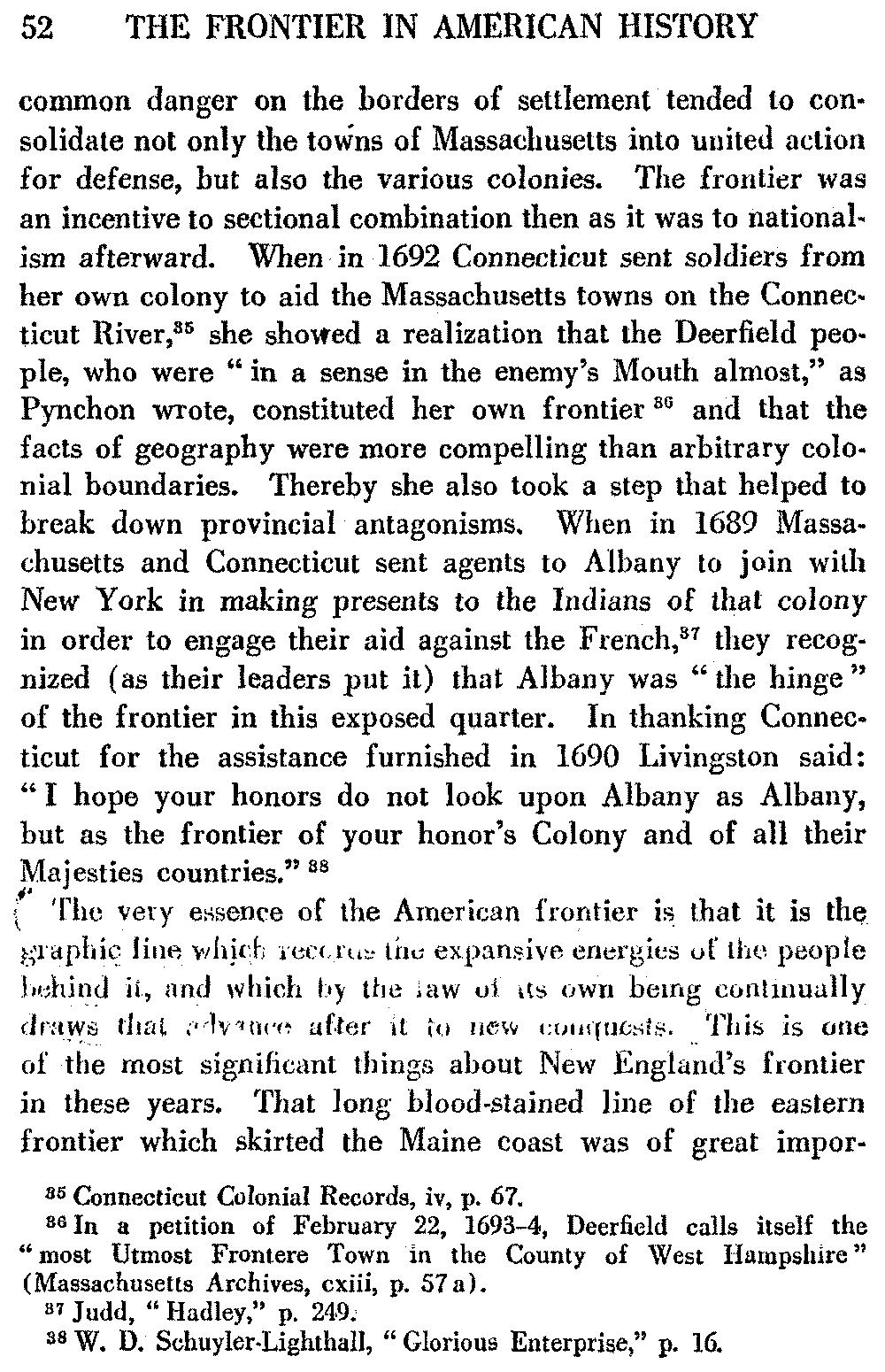 At the Atlantic frontier one can study the germs of processes repeated at each successive frontier. We have the complex European life sharply precipitated by the wilderness into the simplicity of primitive conditions. The first frontier had to meet its Indian question, its question of the disposition of the public domain, of the means of intercourse with older settlements, of the extension of political organization, of religious [10]and educational activity. And the settlement of these and similar questions for one frontier served as a guide for the next. The American student needs not to go to the "prim little townships of Sleswick" for illustrations of the law of continuity and development. For example, he may study the origin of our land policies in the colonial land policy; he may see how the system grew by adapting the statutes to the customs of the successive frontiers.[10:1] He may see how the mining experience in the lead regions of Wisconsin, Illinois, and Iowa was applied to the mining laws of the Sierras,[10:2] and how our Indian policy has been a series of experimentations on successive frontiers. Each tier of new States has found in the older ones material for its constitutions.[10:3] Each frontier has made similar contributions to American character, as will be discussed farther on.