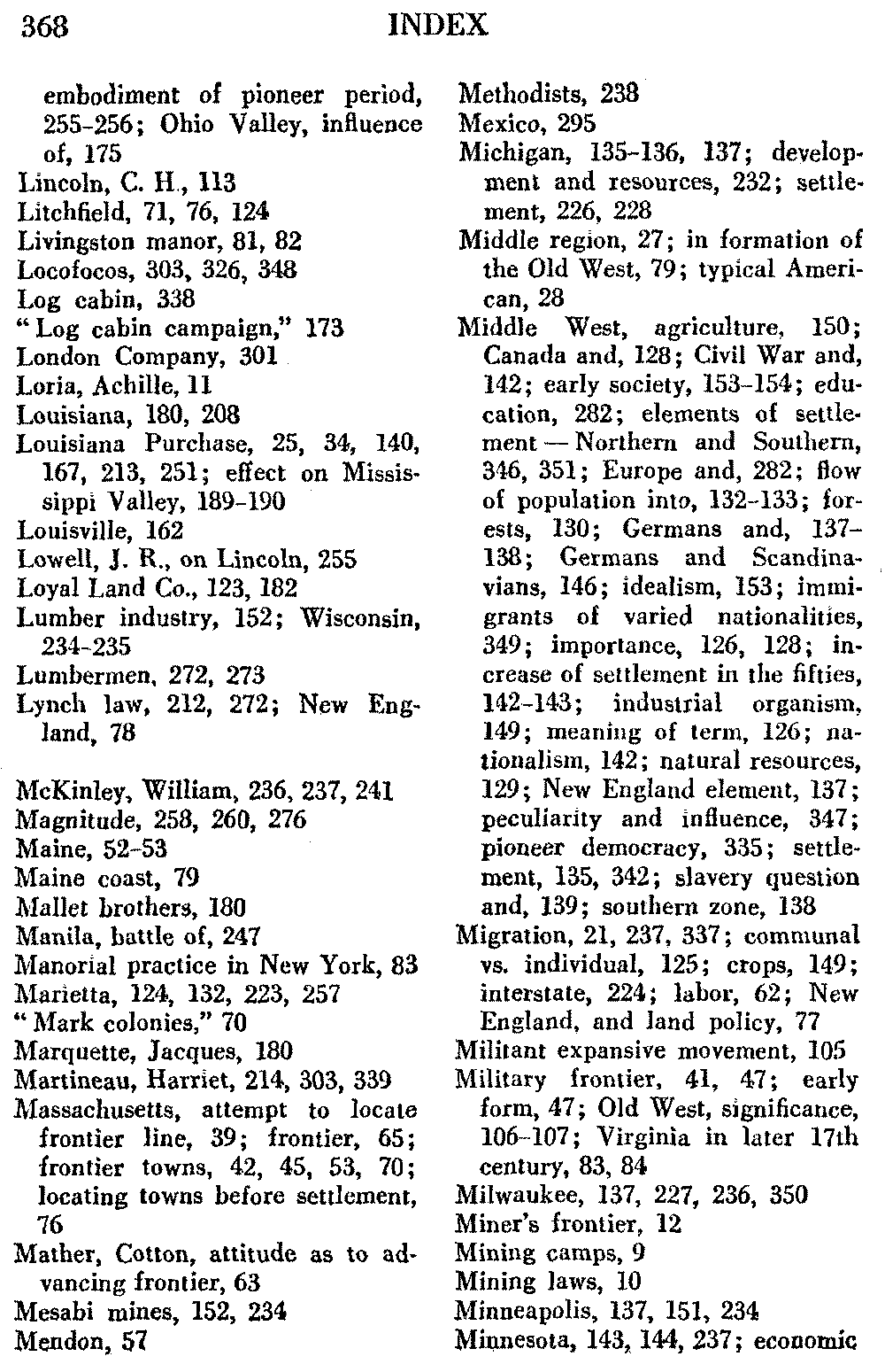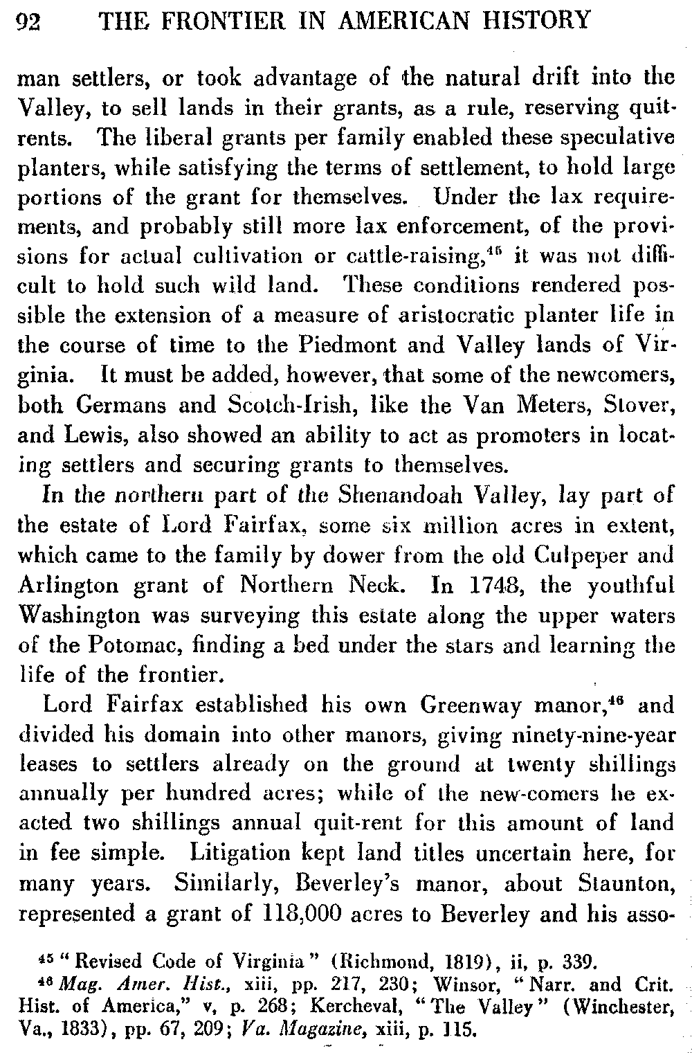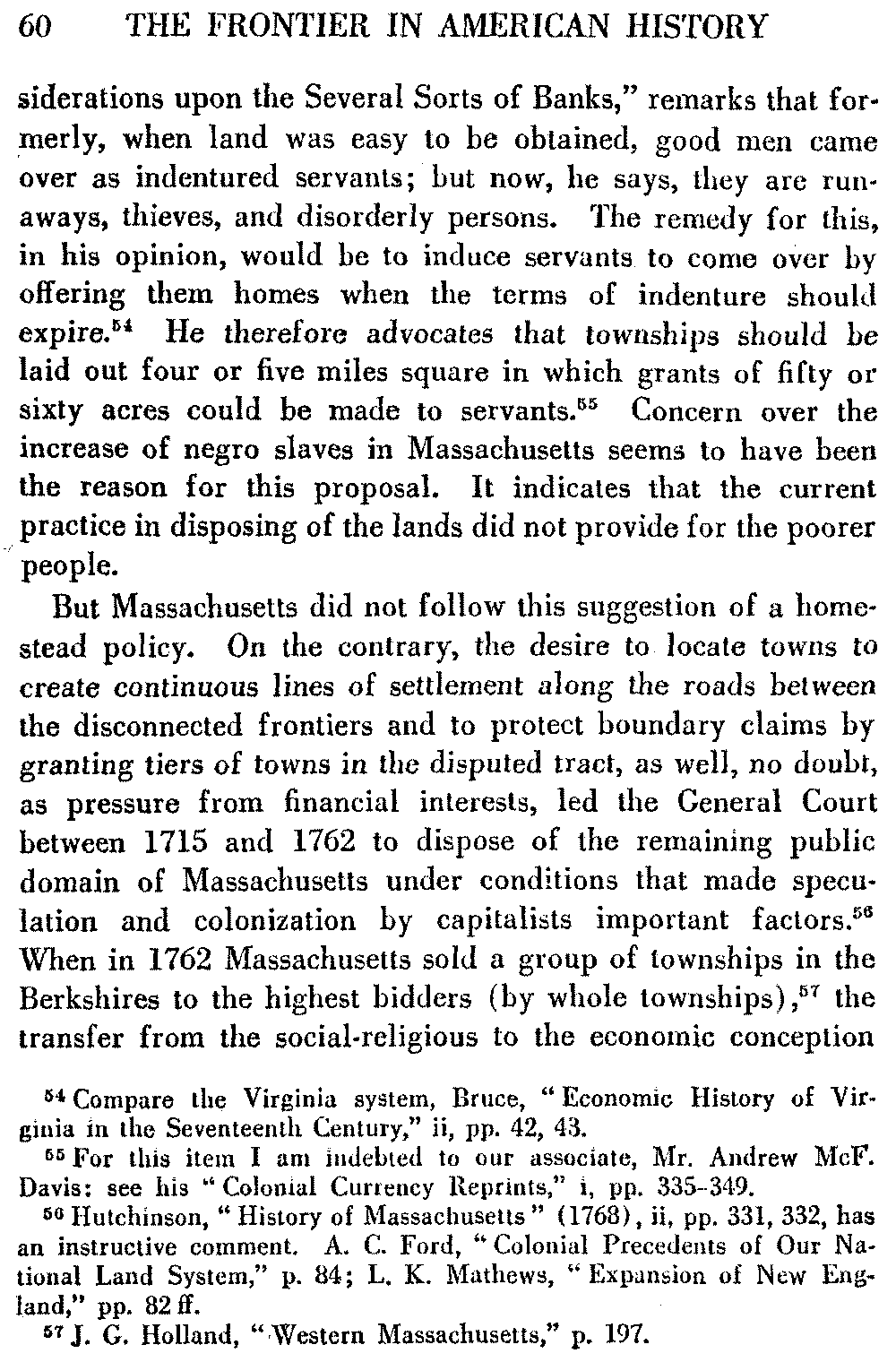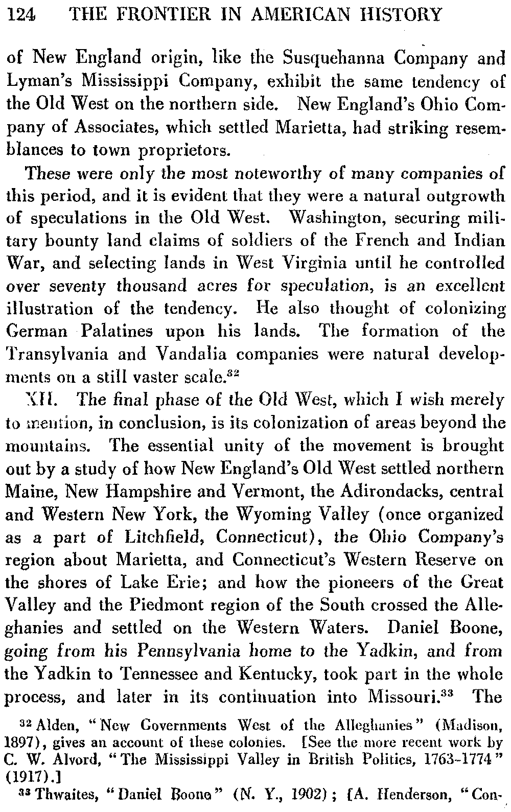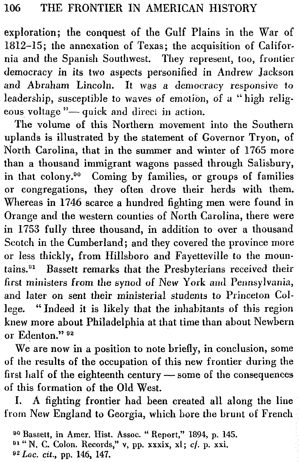 At the Atlantic frontier one can study the germs of processes repeated at each successive frontier. We have the complex European life sharply precipitated by the wilderness into the simplicity of primitive conditions. The first frontier had to meet its Indian question, its question of the disposition of the public domain, of the means of intercourse with older settlements, of the extension of political organization, of religious [10]and educational activity. And the settlement of these and similar questions for one frontier served as a guide for the next. The American student needs not to go to the "prim little townships of Sleswick" for illustrations of the law of continuity and development. For example, he may study the origin of our land policies in the colonial land policy; he may see how the system grew by adapting the statutes to the customs of the successive frontiers.[10:1] He may see how the mining experience in the lead regions of Wisconsin, Illinois, and Iowa was applied to the mining laws of the Sierras,[10:2] and how our Indian policy has been a series of experimentations on successive frontiers. Each tier of new States has found in the older ones material for its constitutions.[10:3] Each frontier has made similar contributions to American character, as will be discussed farther on.