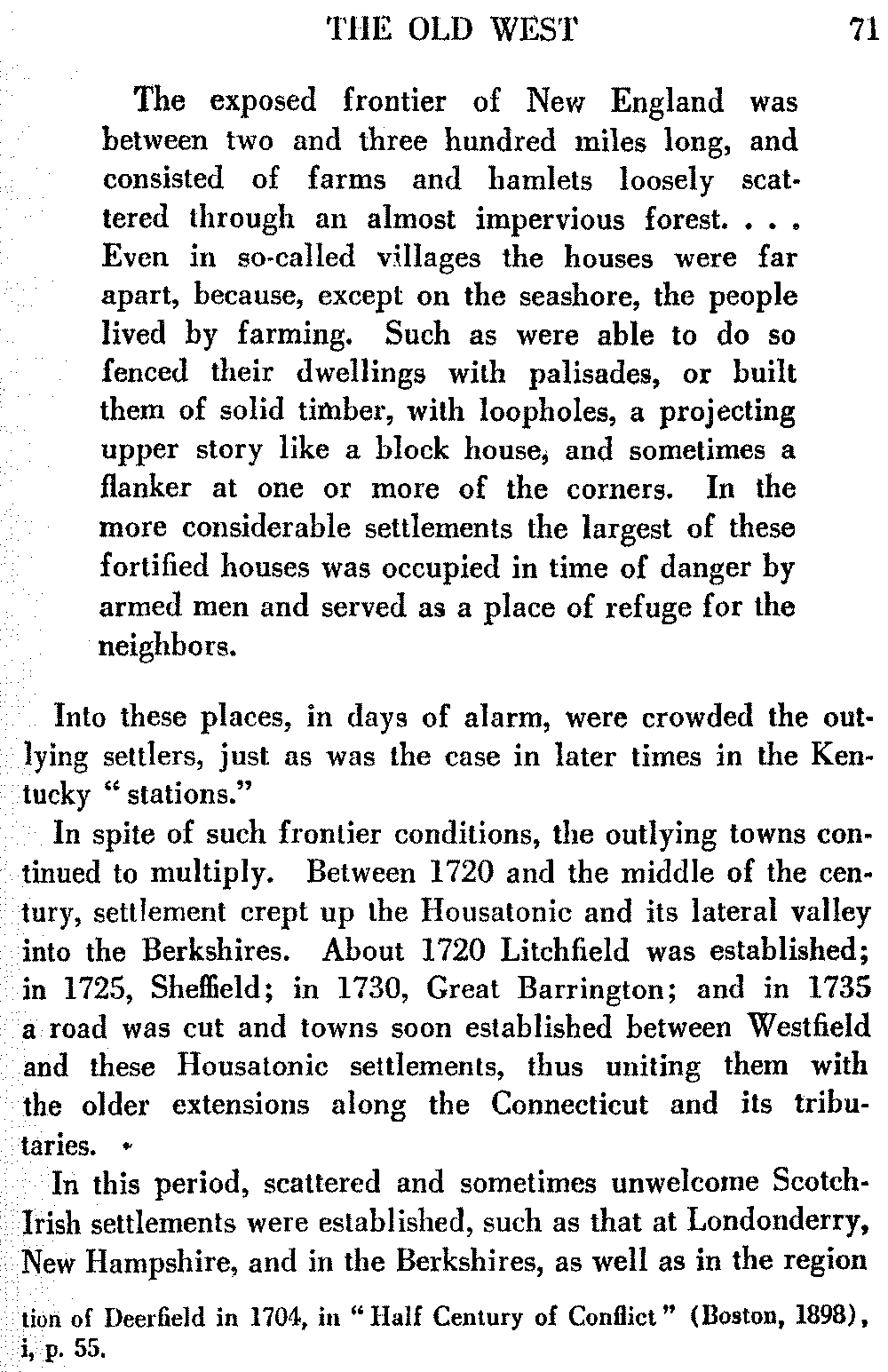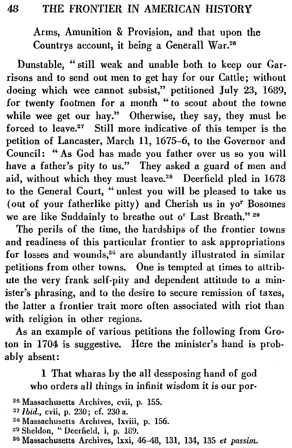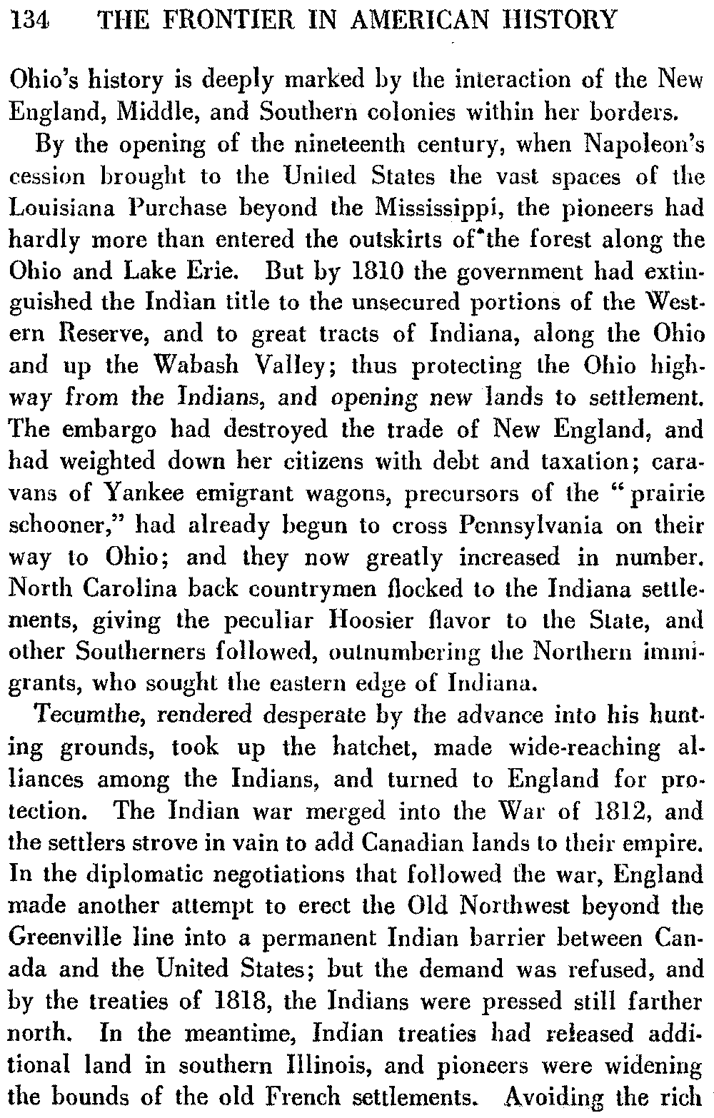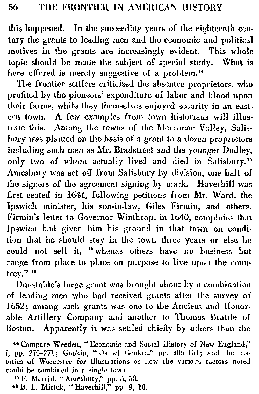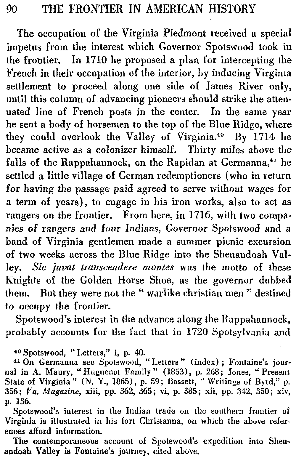 At the Atlantic frontier one can study the germs of processes repeated at each successive frontier. We have the complex European life sharply precipitated by the wilderness into the simplicity of primitive conditions. The first frontier had to meet its Indian question, its question of the disposition of the public domain, of the means of intercourse with older settlements, of the extension of political organization, of religious [10]and educational activity. And the settlement of these and similar questions for one frontier served as a guide for the next. The American student needs not to go to the "prim little townships of Sleswick" for illustrations of the law of continuity and development. For example, he may study the origin of our land policies in the colonial land policy; he may see how the system grew by adapting the statutes to the customs of the successive frontiers.[10:1] He may see how the mining experience in the lead regions of Wisconsin, Illinois, and Iowa was applied to the mining laws of the Sierras,[10:2] and how our Indian policy has been a series of experimentations on successive frontiers. Each tier of new States has found in the older ones material for its constitutions.[10:3] Each frontier has made similar contributions to American character, as will be discussed farther on.