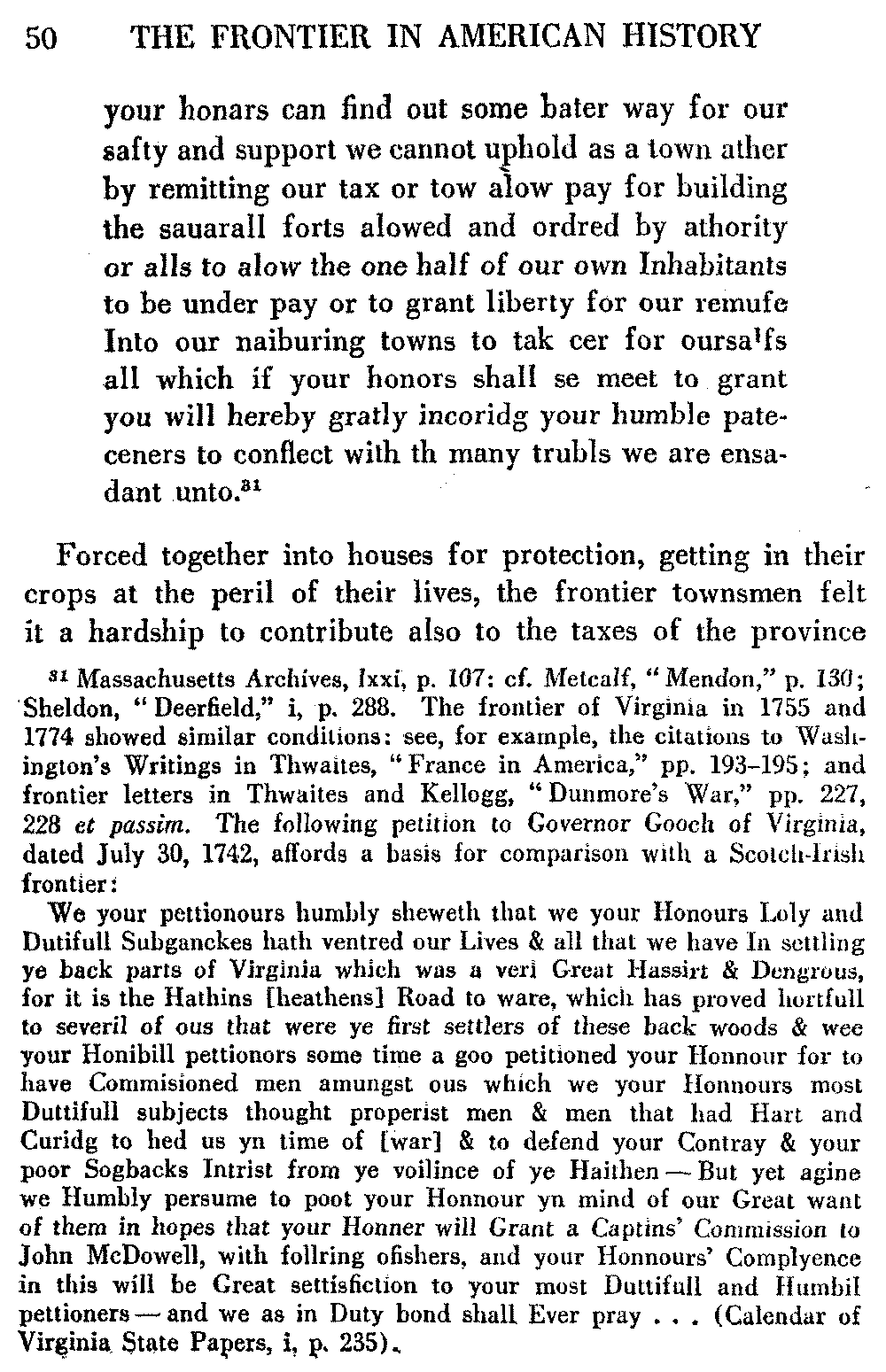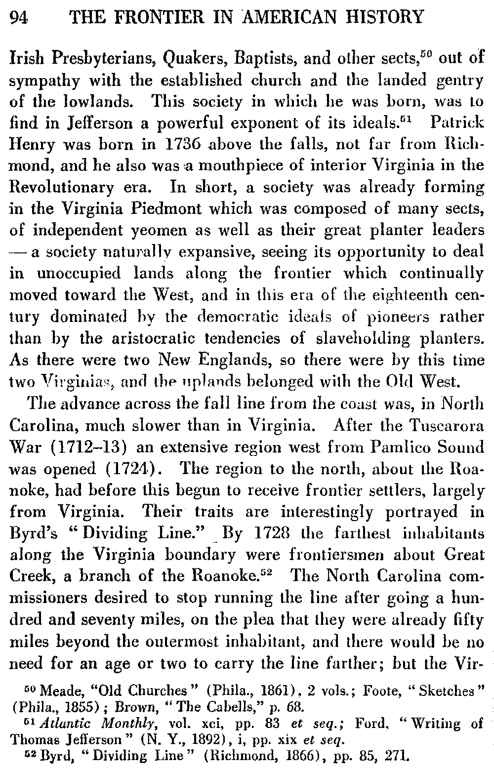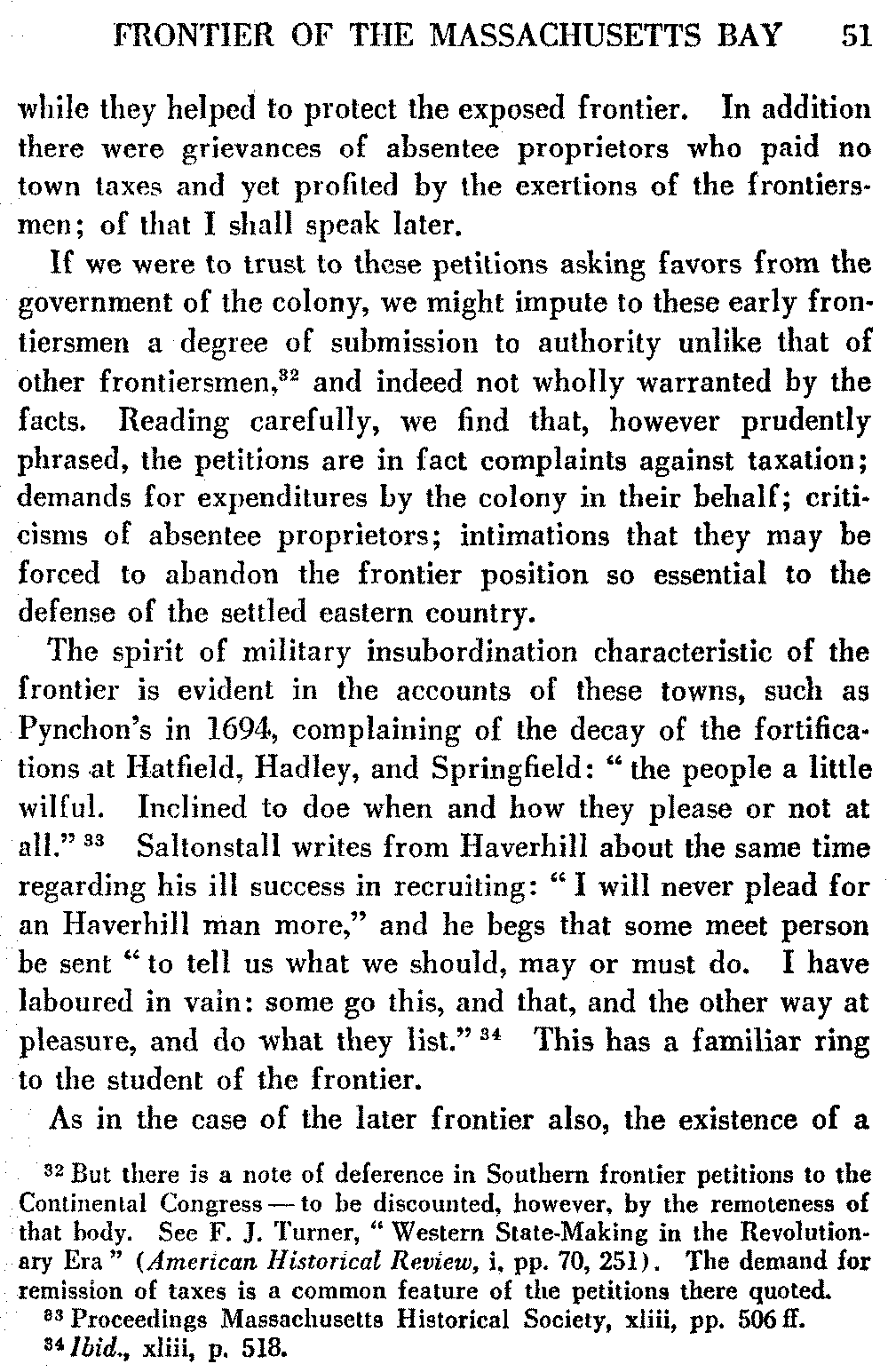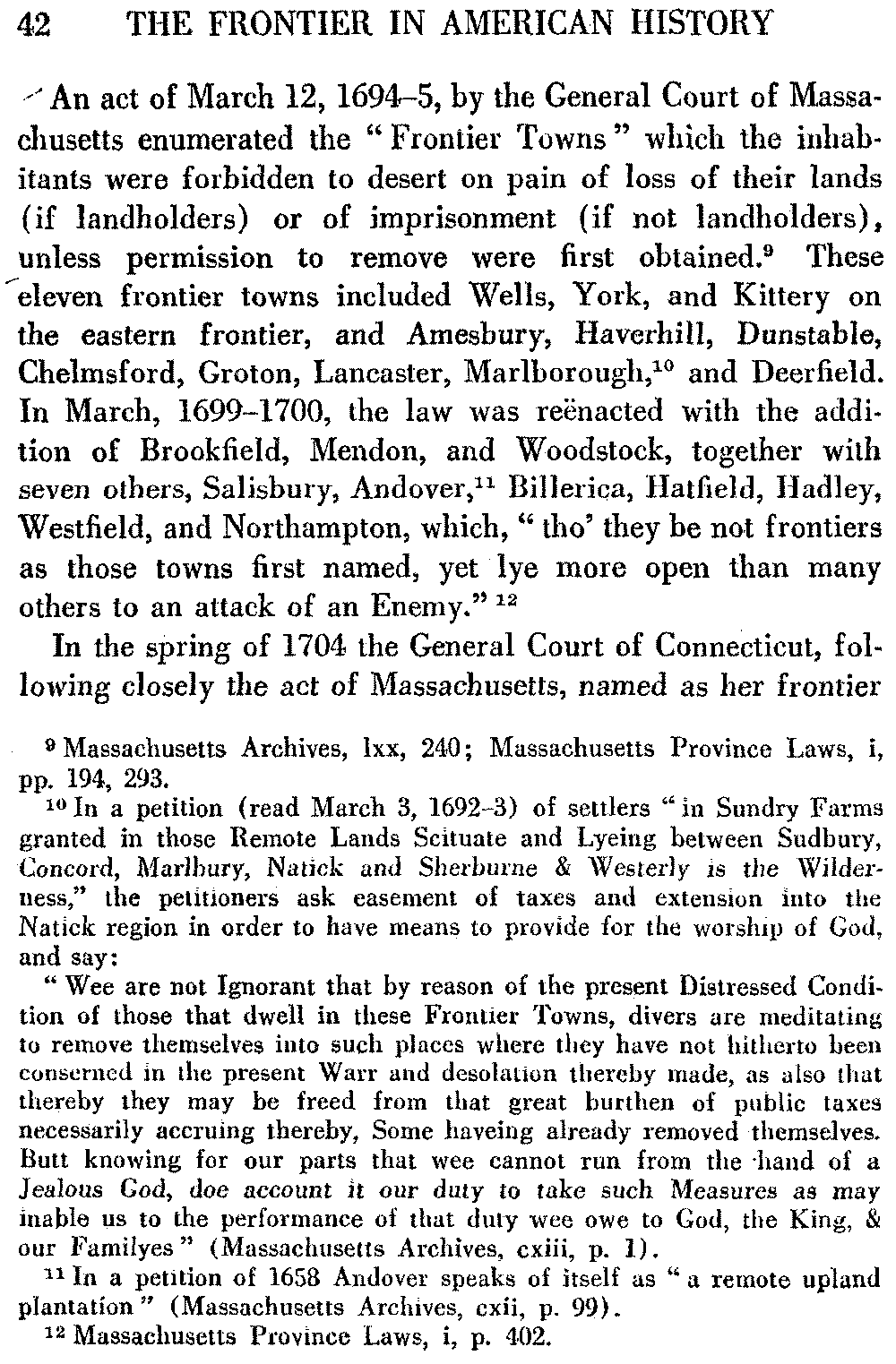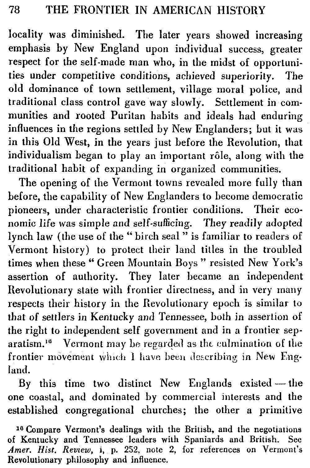 At the Atlantic frontier one can study the germs of processes repeated at each successive frontier. We have the complex European life sharply precipitated by the wilderness into the simplicity of primitive conditions. The first frontier had to meet its Indian question, its question of the disposition of the public domain, of the means of intercourse with older settlements, of the extension of political organization, of religious [10]and educational activity. And the settlement of these and similar questions for one frontier served as a guide for the next. The American student needs not to go to the "prim little townships of Sleswick" for illustrations of the law of continuity and development. For example, he may study the origin of our land policies in the colonial land policy; he may see how the system grew by adapting the statutes to the customs of the successive frontiers.[10:1] He may see how the mining experience in the lead regions of Wisconsin, Illinois, and Iowa was applied to the mining laws of the Sierras,[10:2] and how our Indian policy has been a series of experimentations on successive frontiers. Each tier of new States has found in the older ones material for its constitutions.[10:3] Each frontier has made similar contributions to American character, as will be discussed farther on.