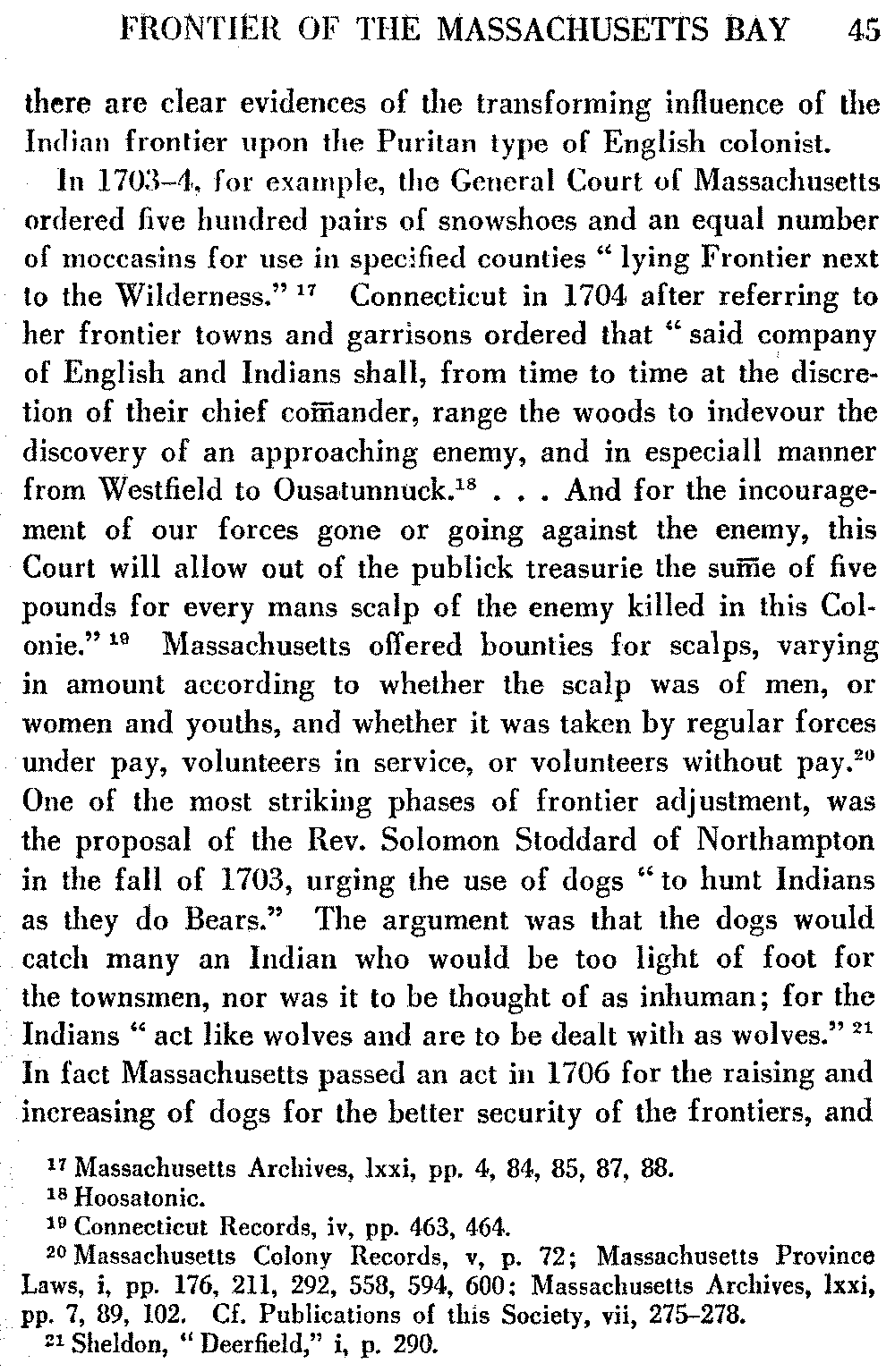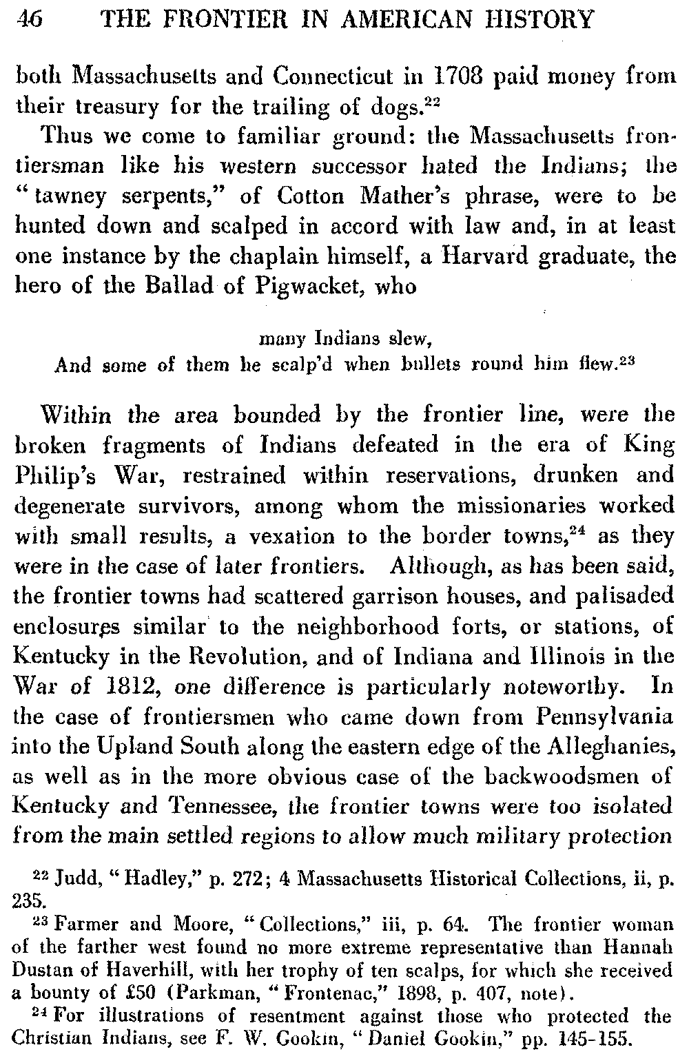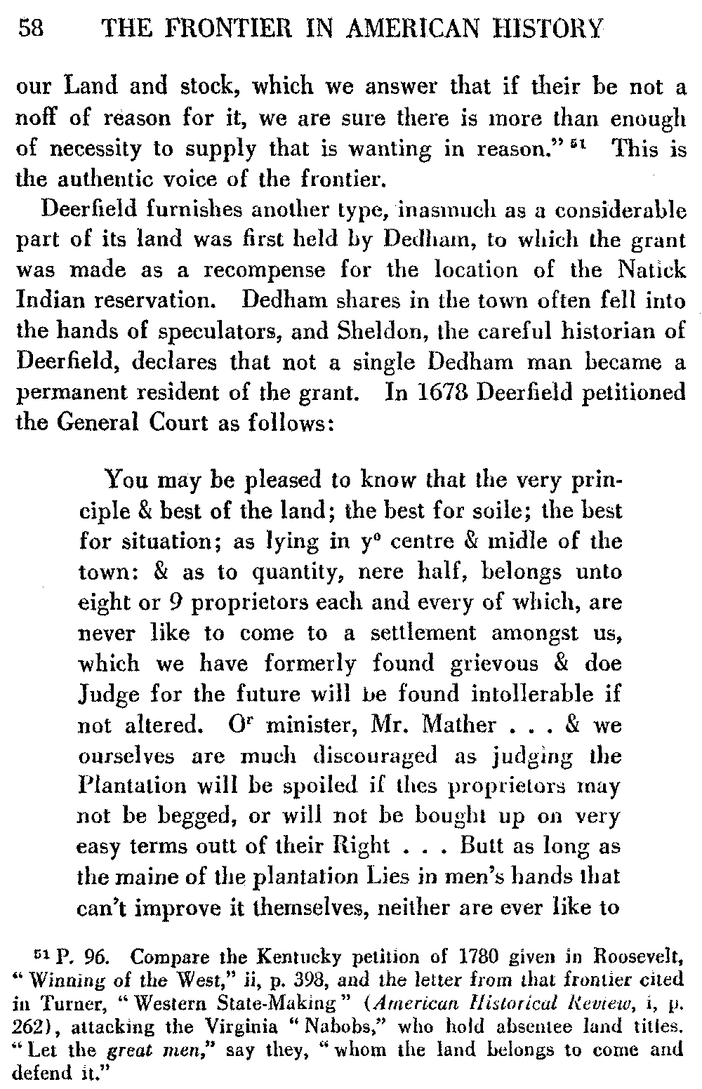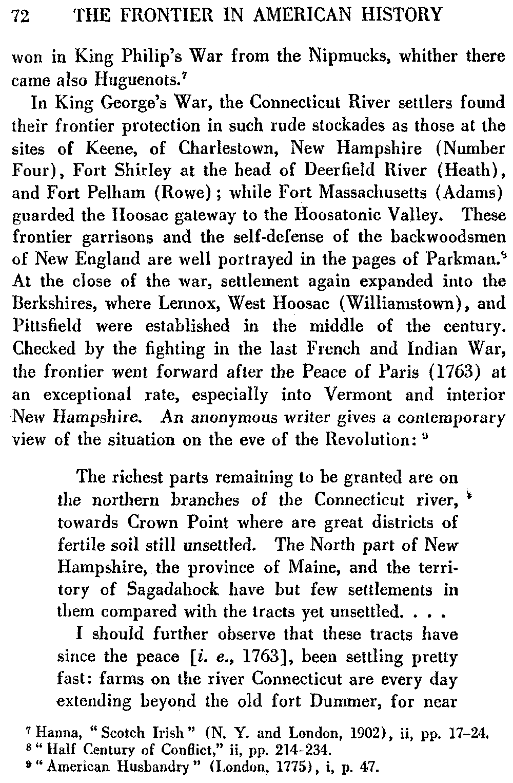 At the Atlantic frontier one can study the germs of processes repeated at each successive frontier. We have the complex European life sharply precipitated by the wilderness into the simplicity of primitive conditions. The first frontier had to meet its Indian question, its question of the disposition of the public domain, of the means of intercourse with older settlements, of the extension of political organization, of religious [10]and educational activity. And the settlement of these and similar questions for one frontier served as a guide for the next. The American student needs not to go to the "prim little townships of Sleswick" for illustrations of the law of continuity and development. For example, he may study the origin of our land policies in the colonial land policy; he may see how the system grew by adapting the statutes to the customs of the successive frontiers.[10:1] He may see how the mining experience in the lead regions of Wisconsin, Illinois, and Iowa was applied to the mining laws of the Sierras,[10:2] and how our Indian policy has been a series of experimentations on successive frontiers. Each tier of new States has found in the older ones material for its constitutions.[10:3] Each frontier has made similar contributions to American character, as will be discussed farther on.