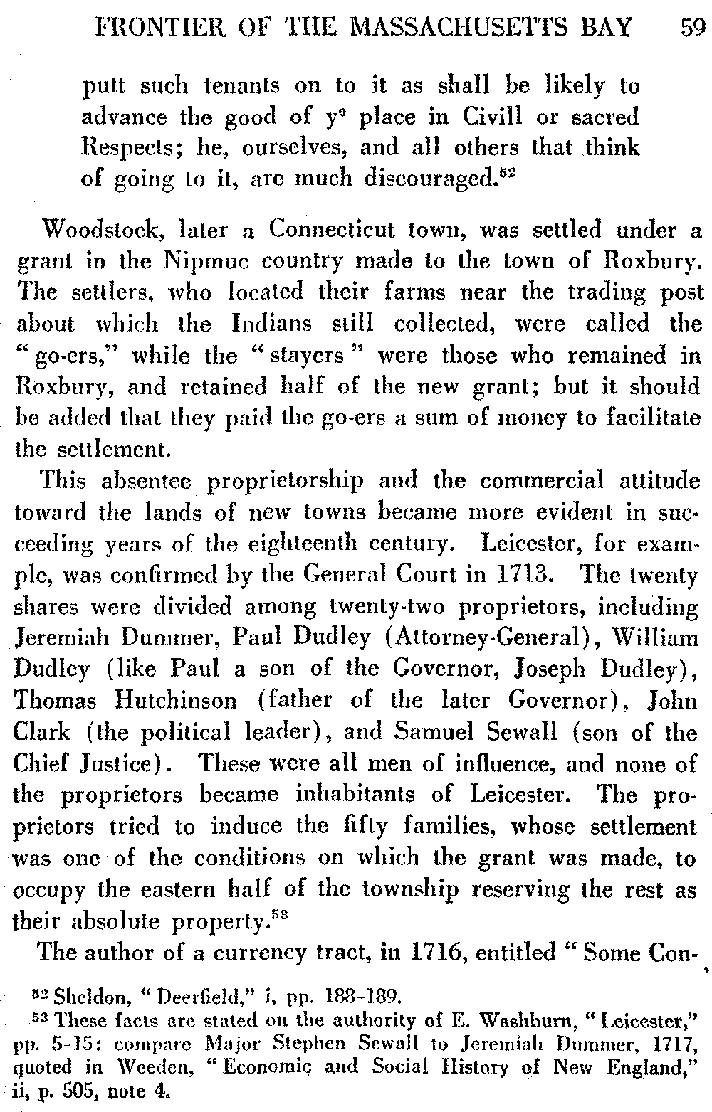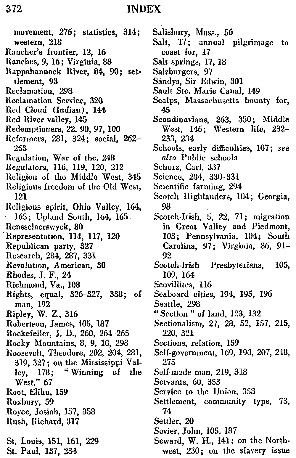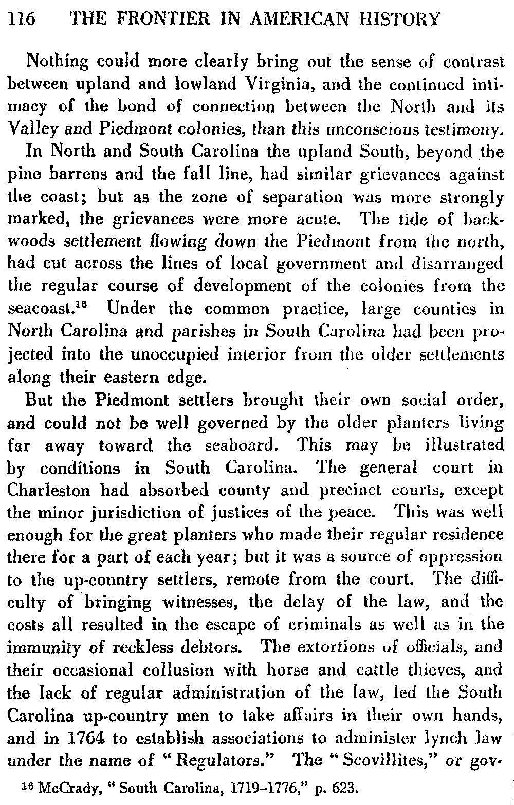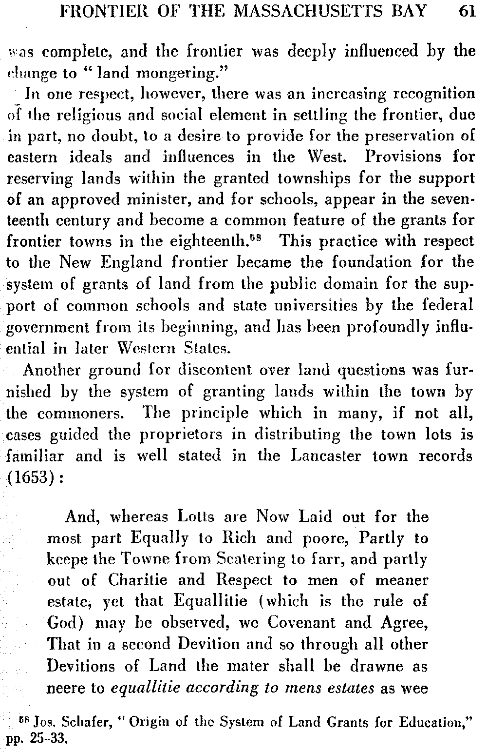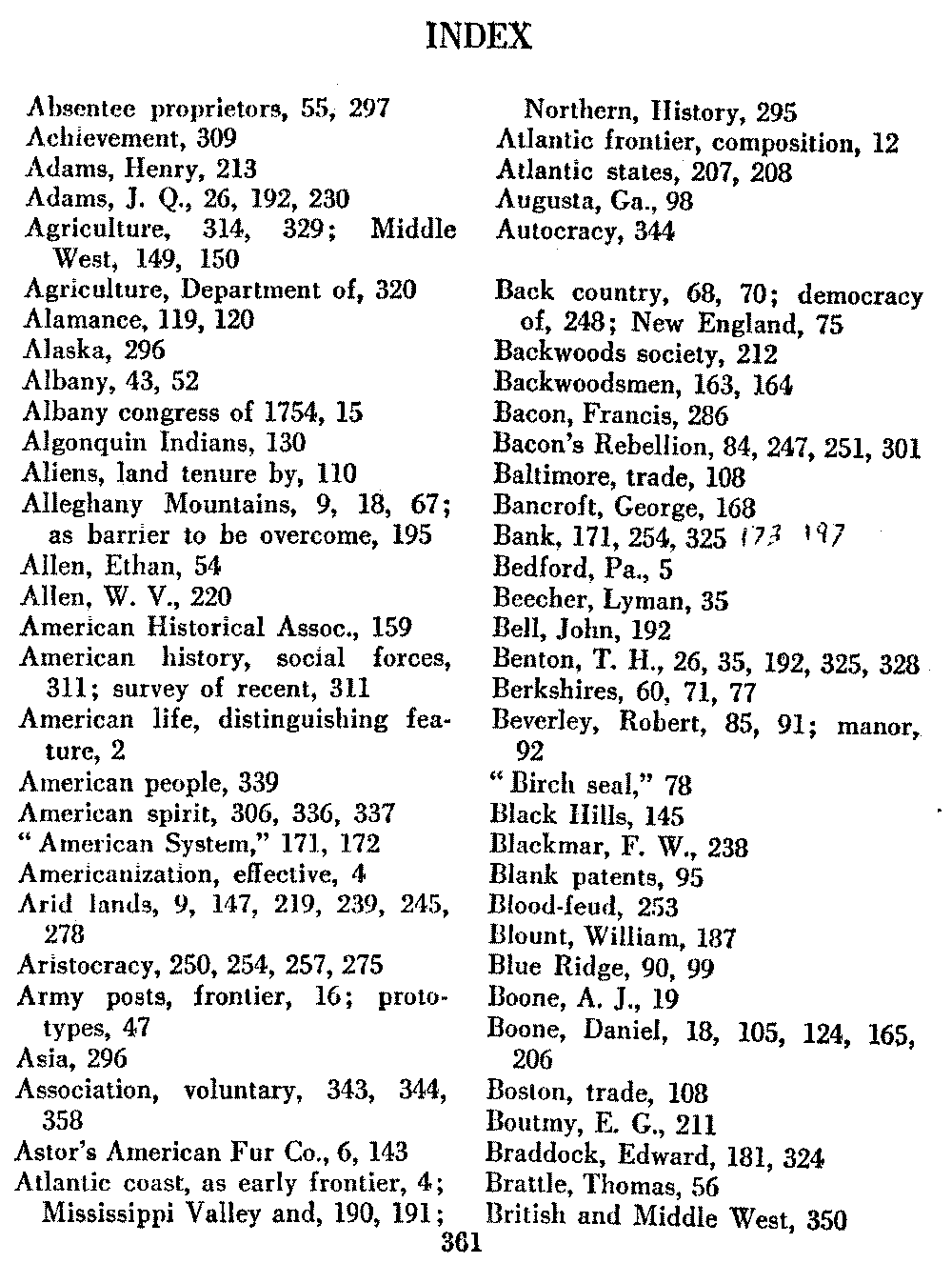 At the Atlantic frontier one can study the germs of processes repeated at each successive frontier. We have the complex European life sharply precipitated by the wilderness into the simplicity of primitive conditions. The first frontier had to meet its Indian question, its question of the disposition of the public domain, of the means of intercourse with older settlements, of the extension of political organization, of religious [10]and educational activity. And the settlement of these and similar questions for one frontier served as a guide for the next. The American student needs not to go to the "prim little townships of Sleswick" for illustrations of the law of continuity and development. For example, he may study the origin of our land policies in the colonial land policy; he may see how the system grew by adapting the statutes to the customs of the successive frontiers.[10:1] He may see how the mining experience in the lead regions of Wisconsin, Illinois, and Iowa was applied to the mining laws of the Sierras,[10:2] and how our Indian policy has been a series of experimentations on successive frontiers. Each tier of new States has found in the older ones material for its constitutions.[10:3] Each frontier has made similar contributions to American character, as will be discussed farther on.