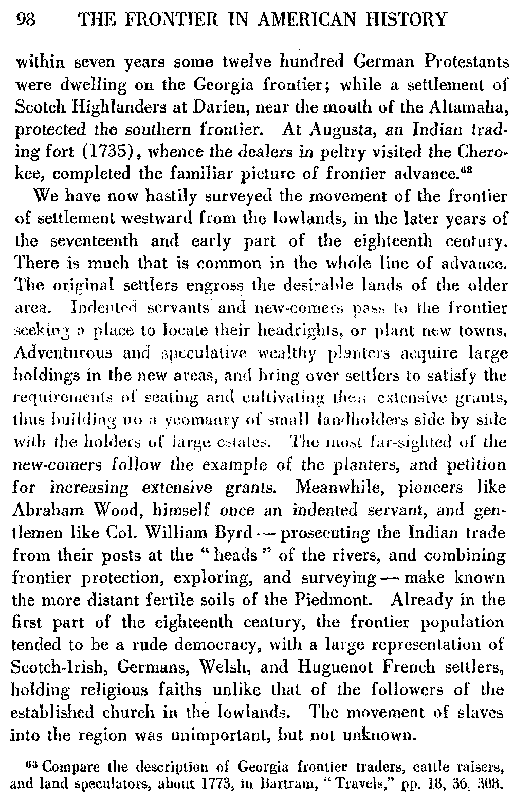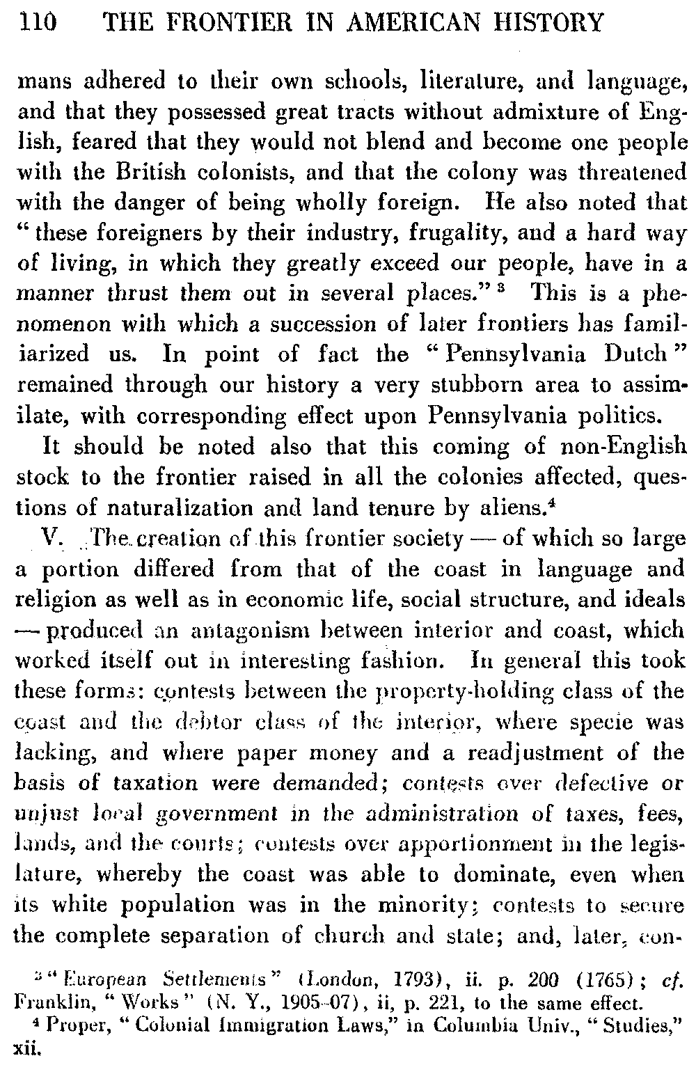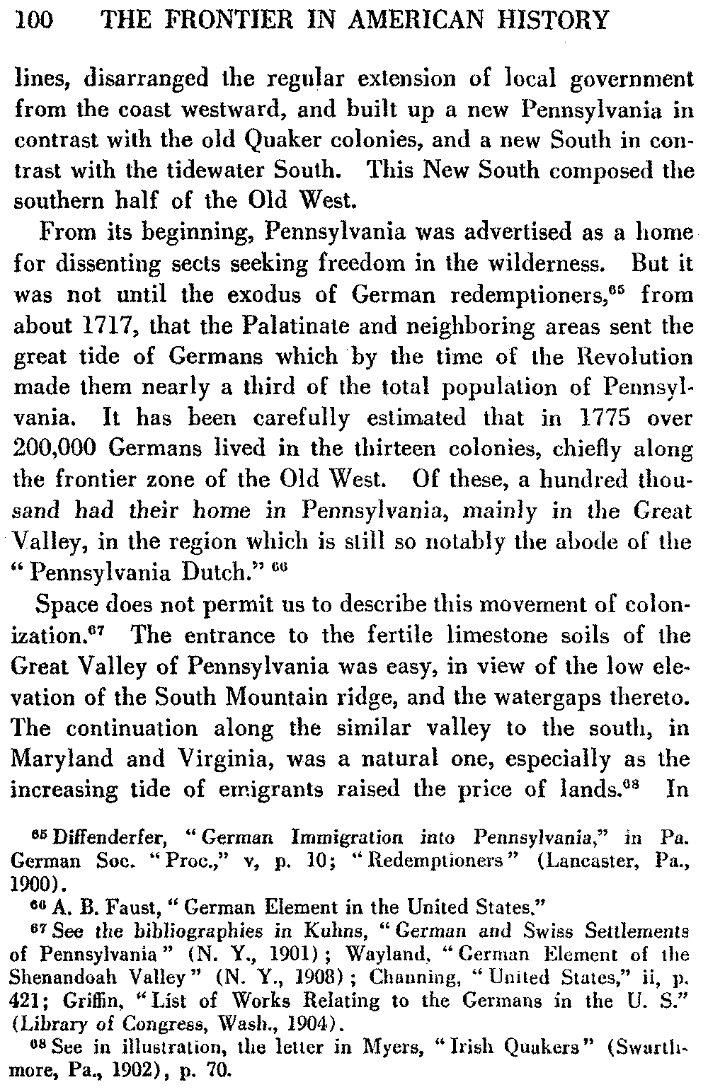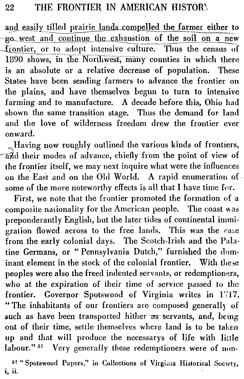 First, we note that the frontier promoted the formation of a composite nationality for the American people. The coast was preponderantly English, but the later tides of continental immigration flowed across to the free lands. This was the case from the early colonial days. The Scotch-Irish and the Palatine Germans, or "Pennsylvania Dutch," furnished the dominant element in the stock of the colonial frontier. With these peoples were also the freed indented servants, or redemptioners, who at the expiration of their time of service passed to the frontier. Governor Spotswood of Virginia writes in 1717, "The inhabitants of our frontiers are composed generally of such as have been transported hither as servants, and, being out of their time, settle themselves where land is to be taken up and that will produce the necessarys of life with little labour."[22:1] Very generally these redemptioners were of [23]non-English stock. In the crucible of the frontier the immigrants were Americanized, liberated, and fused into a mixed race, English in neither nationality nor characteristics. The process has gone on from the early days to our own. Burke and other writers in the middle of the eighteenth century believed that Pennsylvania[23:1] was "threatened with the danger of being wholly foreign in language, manners, and perhaps even inclinations." The German and Scotch-Irish elements in the frontier of the South were only less great. In the middle of the present century the German element in Wisconsin was already so considerable that leading publicists looked to the creation of a German state out of the commonwealth by concentrating their colonization.[23:2] Such examples teach us to beware of misinterpreting the fact that there is a common English speech in America into a belief that the stock is also English.
