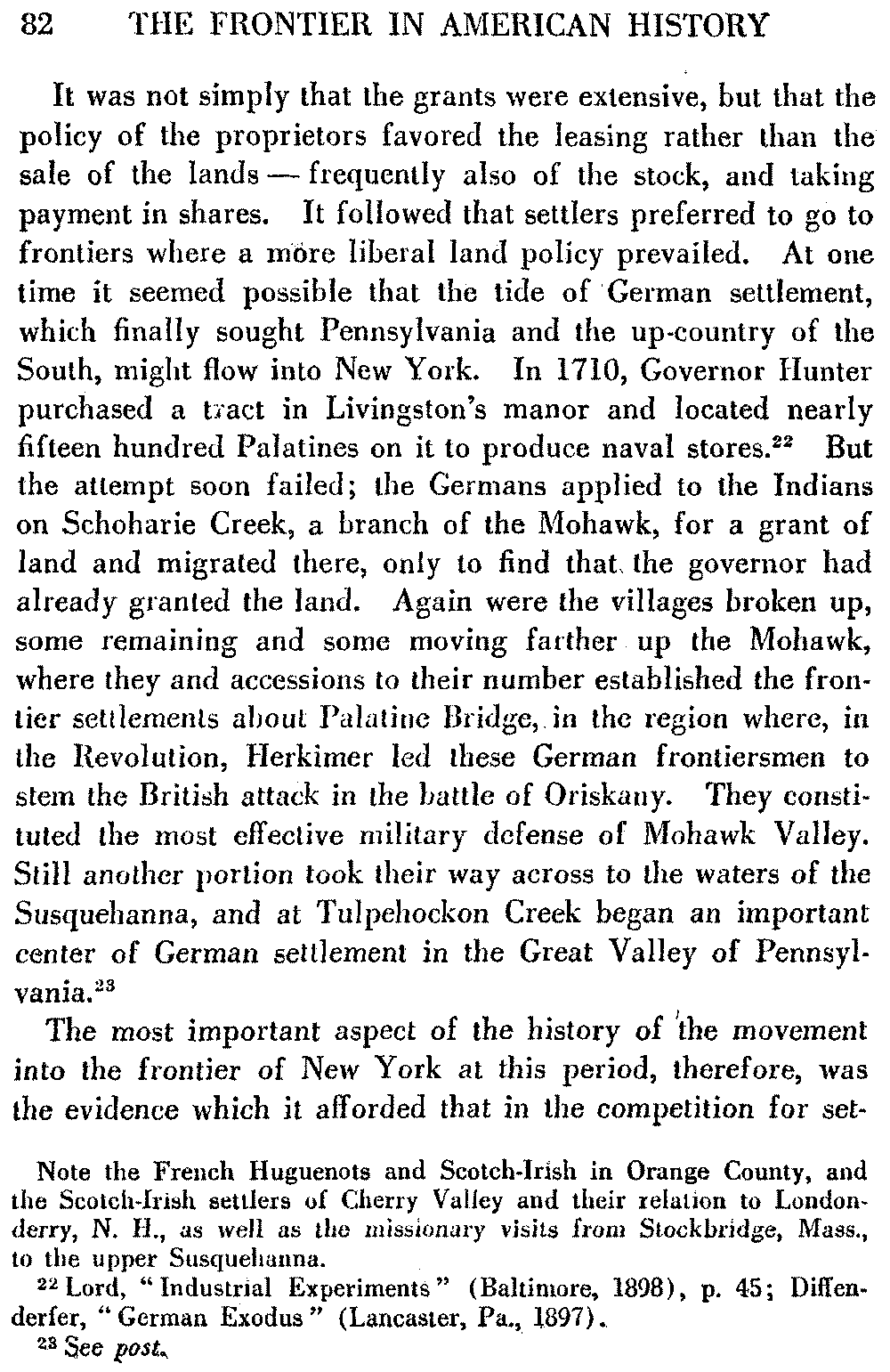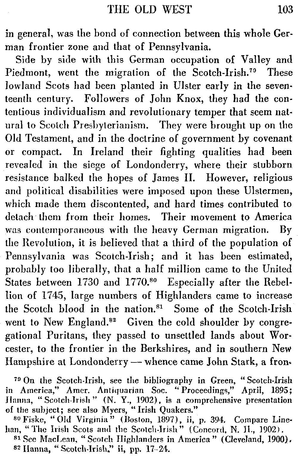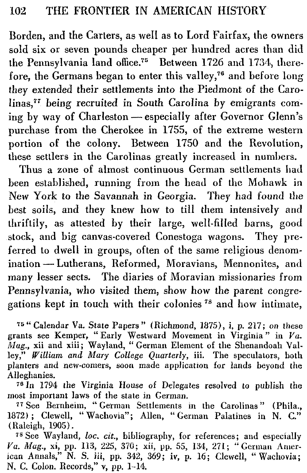 First, we note that the frontier promoted the formation of a composite nationality for the American people. The coast was preponderantly English, but the later tides of continental immigration flowed across to the free lands. This was the case from the early colonial days. The Scotch-Irish and the Palatine Germans, or "Pennsylvania Dutch," furnished the dominant element in the stock of the colonial frontier. With these peoples were also the freed indented servants, or redemptioners, who at the expiration of their time of service passed to the frontier. Governor Spotswood of Virginia writes in 1717, "The inhabitants of our frontiers are composed generally of such as have been transported hither as servants, and, being out of their time, settle themselves where land is to be taken up and that will produce the necessarys of life with little labour."[22:1] Very generally these redemptioners were of [23]non-English stock. In the crucible of the frontier the immigrants were Americanized, liberated, and fused into a mixed race, English in neither nationality nor characteristics. The process has gone on from the early days to our own. Burke and other writers in the middle of the eighteenth century believed that Pennsylvania[23:1] was "threatened with the danger of being wholly foreign in language, manners, and perhaps even inclinations." The German and Scotch-Irish elements in the frontier of the South were only less great. In the middle of the present century the German element in Wisconsin was already so considerable that leading publicists looked to the creation of a German state out of the commonwealth by concentrating their colonization.[23:2] Such examples teach us to beware of misinterpreting the fact that there is a common English speech in America into a belief that the stock is also English.