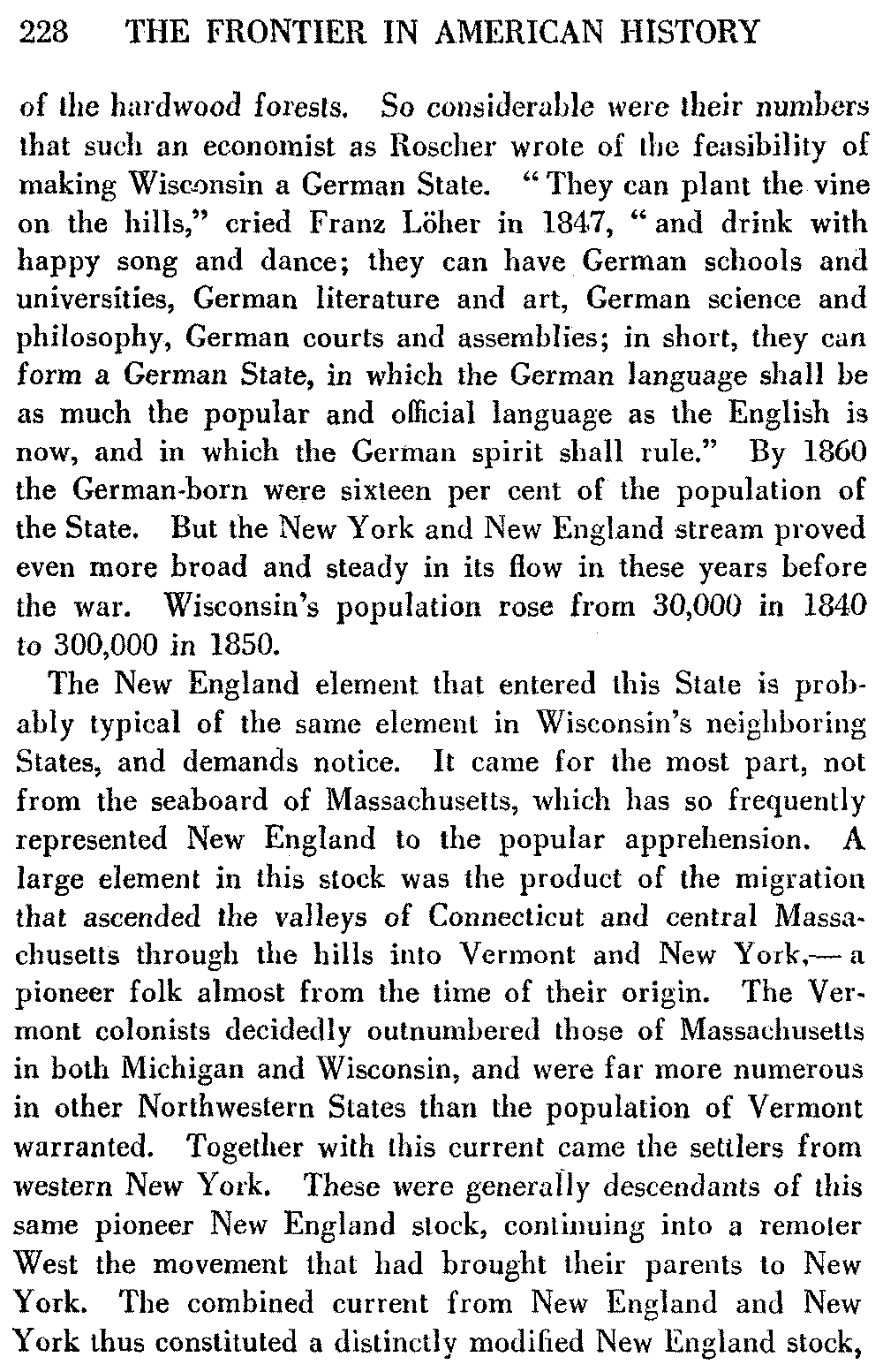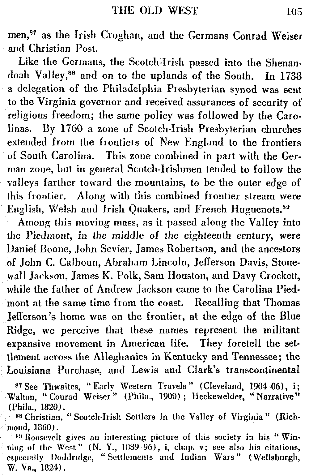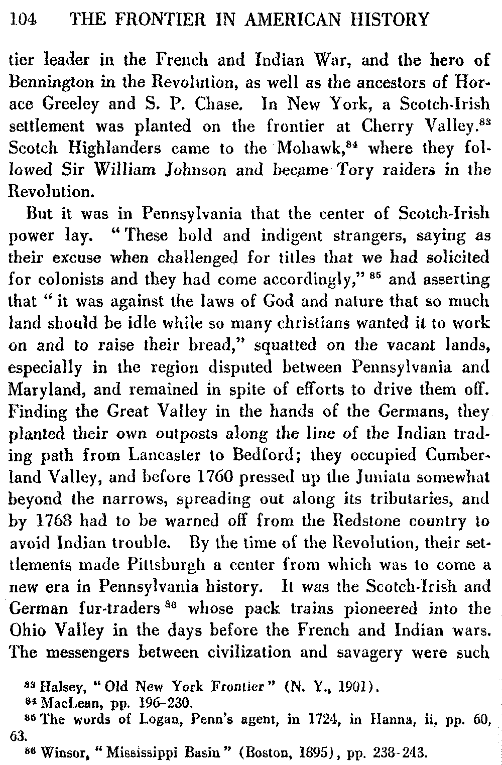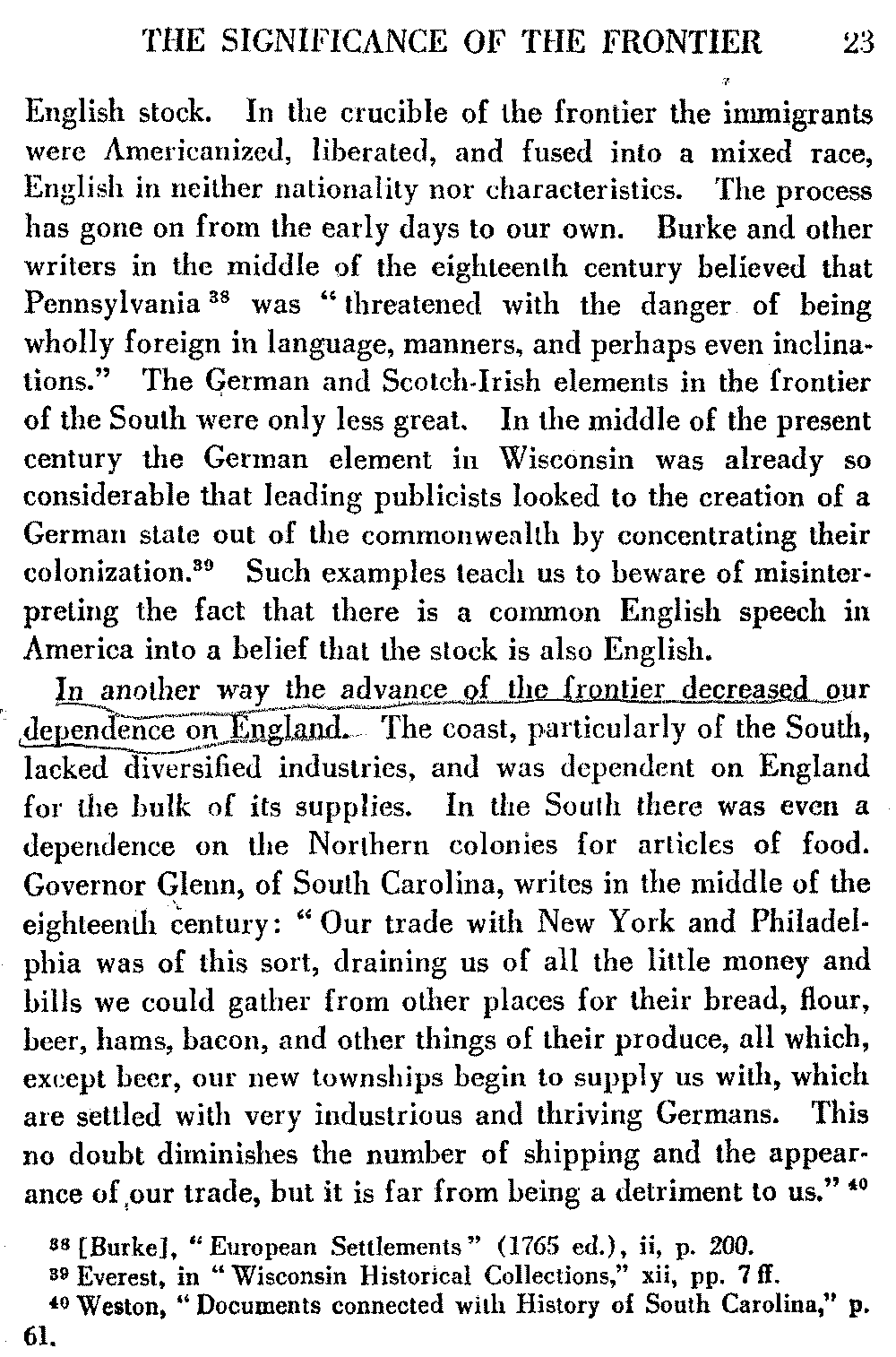 First, we note that the frontier promoted the formation of a composite nationality for the American people. The coast was preponderantly English, but the later tides of continental immigration flowed across to the free lands. This was the case from the early colonial days. The Scotch-Irish and the Palatine Germans, or "Pennsylvania Dutch," furnished the dominant element in the stock of the colonial frontier. With these peoples were also the freed indented servants, or redemptioners, who at the expiration of their time of service passed to the frontier. Governor Spotswood of Virginia writes in 1717, "The inhabitants of our frontiers are composed generally of such as have been transported hither as servants, and, being out of their time, settle themselves where land is to be taken up and that will produce the necessarys of life with little labour."[22:1] Very generally these redemptioners were of [23]non-English stock. In the crucible of the frontier the immigrants were Americanized, liberated, and fused into a mixed race, English in neither nationality nor characteristics. The process has gone on from the early days to our own. Burke and other writers in the middle of the eighteenth century believed that Pennsylvania[23:1] was "threatened with the danger of being wholly foreign in language, manners, and perhaps even inclinations." The German and Scotch-Irish elements in the frontier of the South were only less great. In the middle of the present century the German element in Wisconsin was already so considerable that leading publicists looked to the creation of a German state out of the commonwealth by concentrating their colonization.[23:2] Such examples teach us to beware of misinterpreting the fact that there is a common English speech in America into a belief that the stock is also English.