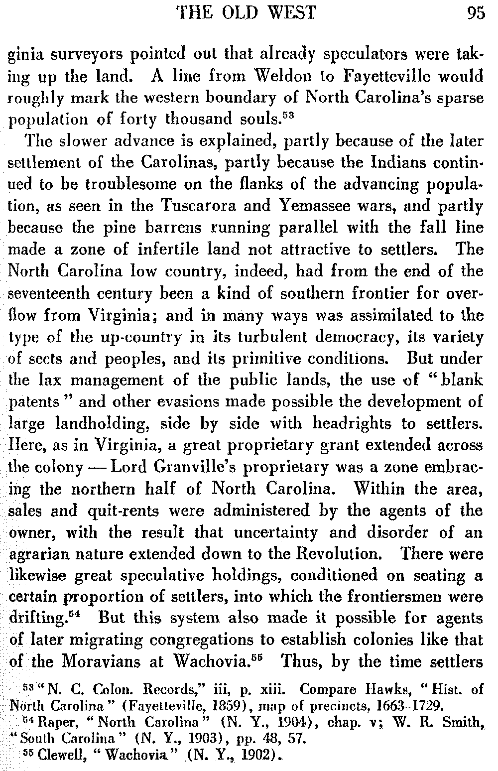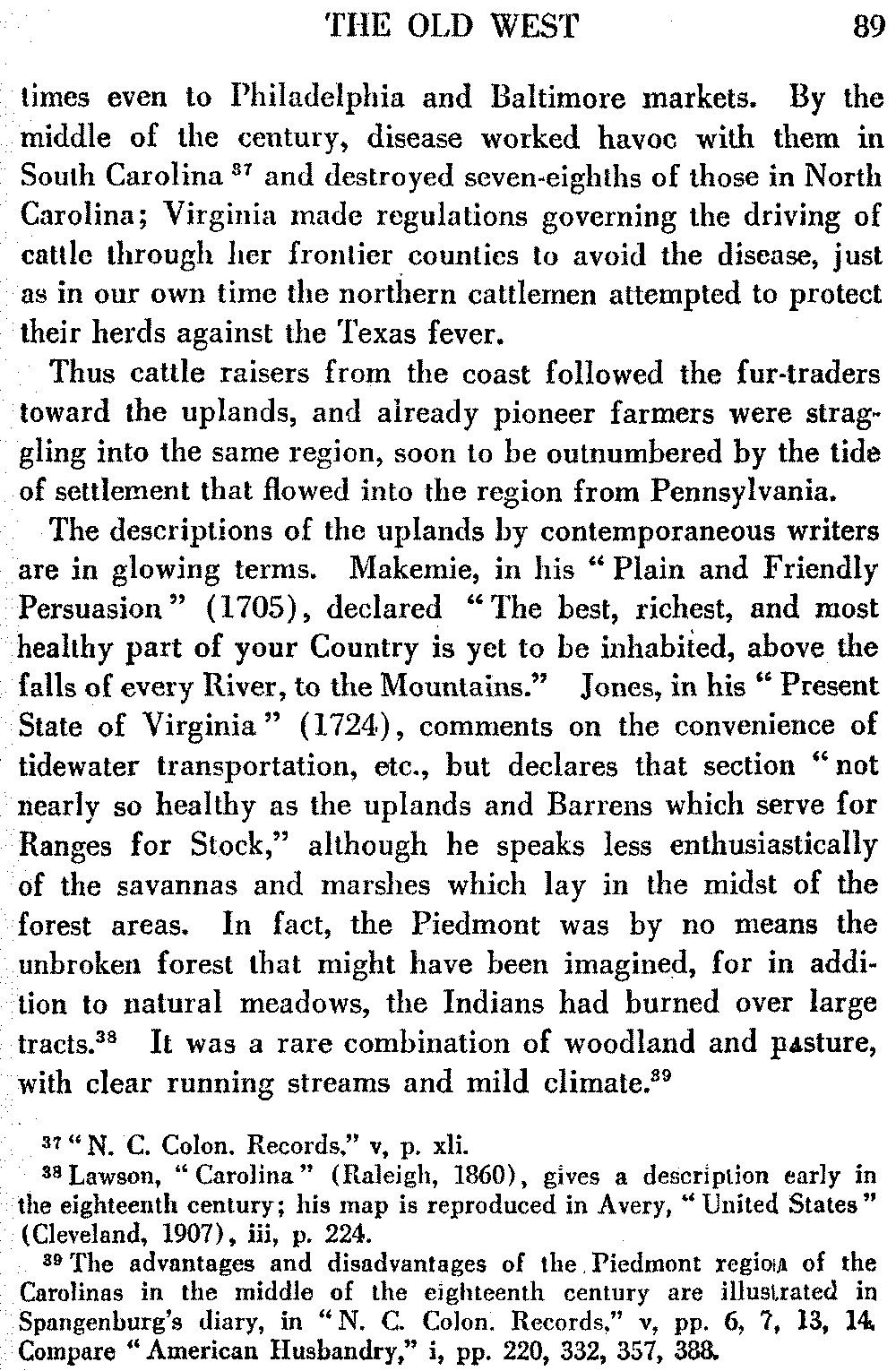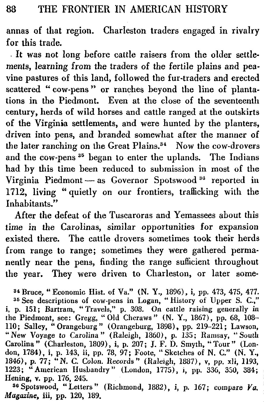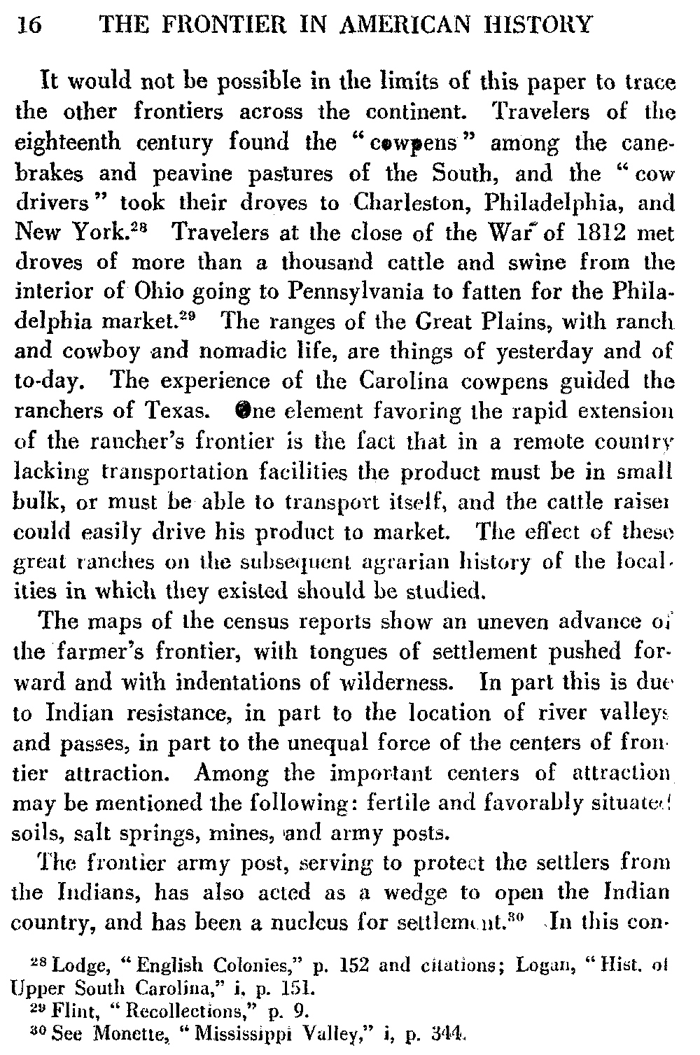It would not be possible in the limits of this paper to trace the other frontiers across the continent. Travelers of the eighteenth century found the "cowpens" among the canebrakes and peavine pastures of the South, and the "cow drivers" took their droves to Charleston, Philadelphia, and New York.[16:1] Travelers at the close of the War of 1812 met droves of more than a thousand cattle and swine from the interior of Ohio going to Pennsylvania to fatten for the Philadelphia market.[16:2] The ranges of the Great Plains, with ranch and cowboy and nomadic life, are things of yesterday and of to-day. The experience of the Carolina cowpens guided the ranchers of Texas. One element favoring the rapid extension of the rancher's frontier is the fact that in a remote country lacking transportation facilities the product must be in small bulk, or must be able to transport itself, and the cattle raiser could easily drive his product to market. The effect of these great ranches on the subsequent agrarian history of the localities in which they existed should be studied.