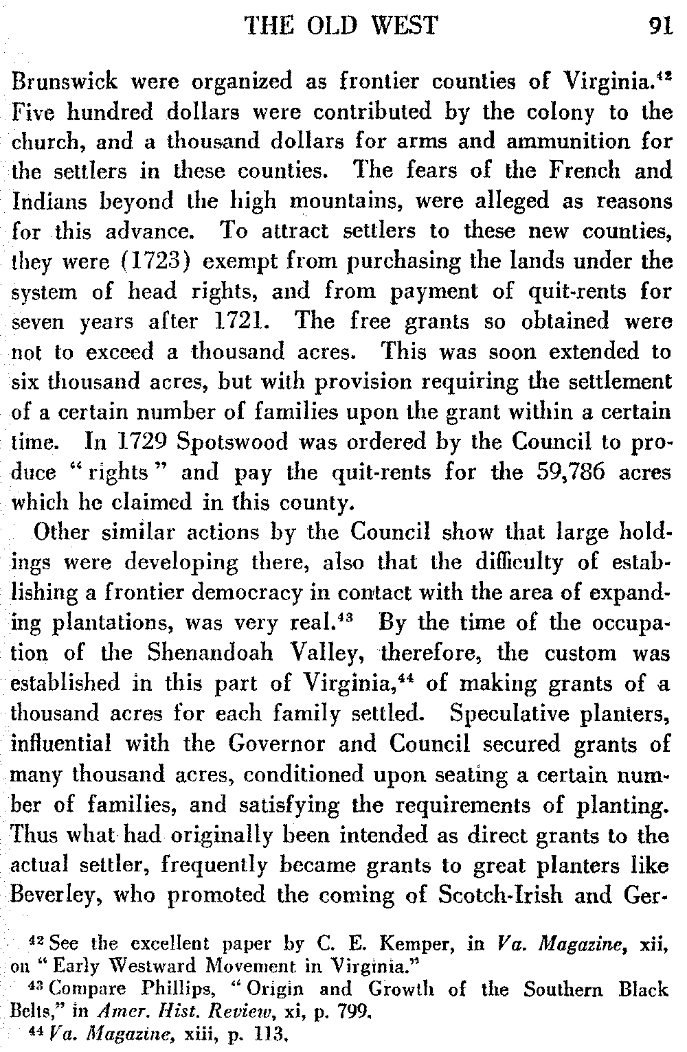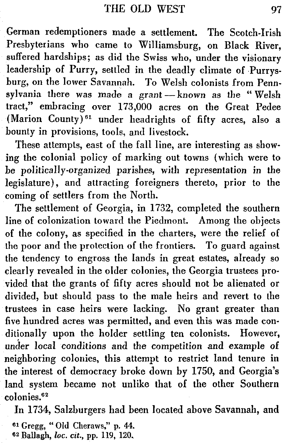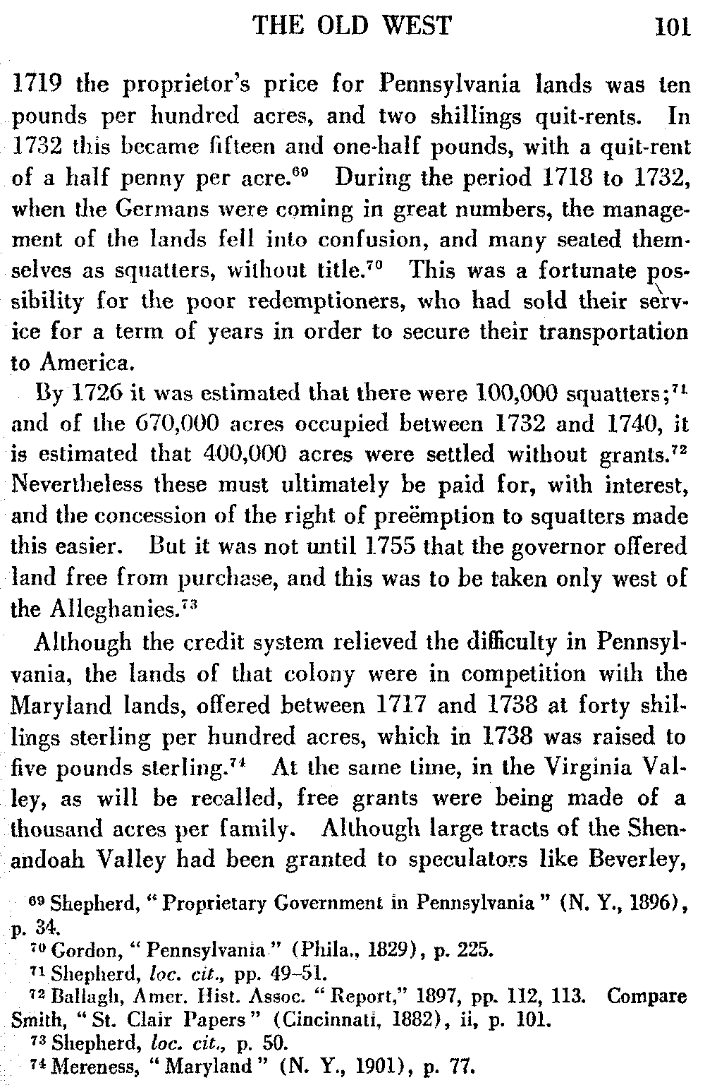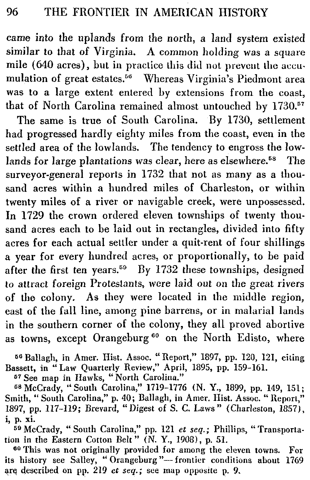 It would not be possible in the limits of this paper to trace the other frontiers across the continent. Travelers of the eighteenth century found the "cowpens" among the canebrakes and peavine pastures of the South, and the "cow drivers" took their droves to Charleston, Philadelphia, and New York.[16:1] Travelers at the close of the War of 1812 met droves of more than a thousand cattle and swine from the interior of Ohio going to Pennsylvania to fatten for the Philadelphia market.[16:2] The ranges of the Great Plains, with ranch and cowboy and nomadic life, are things of yesterday and of to-day. The experience of the Carolina cowpens guided the ranchers of Texas. One element favoring the rapid extension of the rancher's frontier is the fact that in a remote country lacking transportation facilities the product must be in small bulk, or must be able to transport itself, and the cattle raiser could easily drive his product to market. The effect of these great ranches on the subsequent agrarian history of the localities in which they existed should be studied.