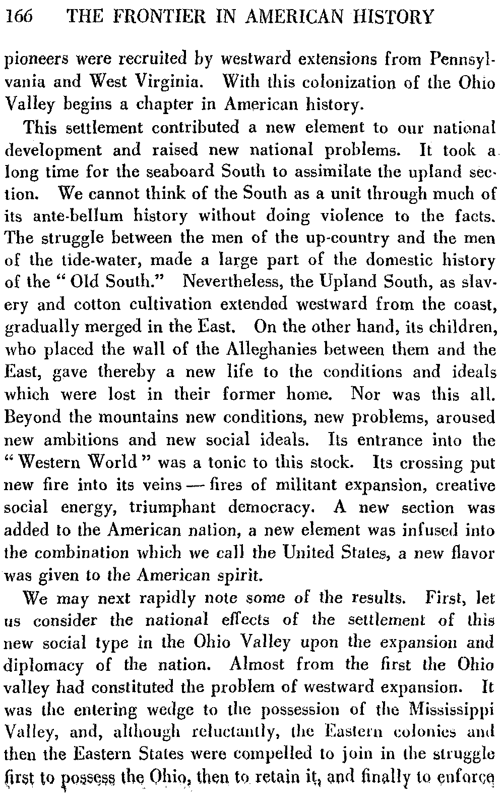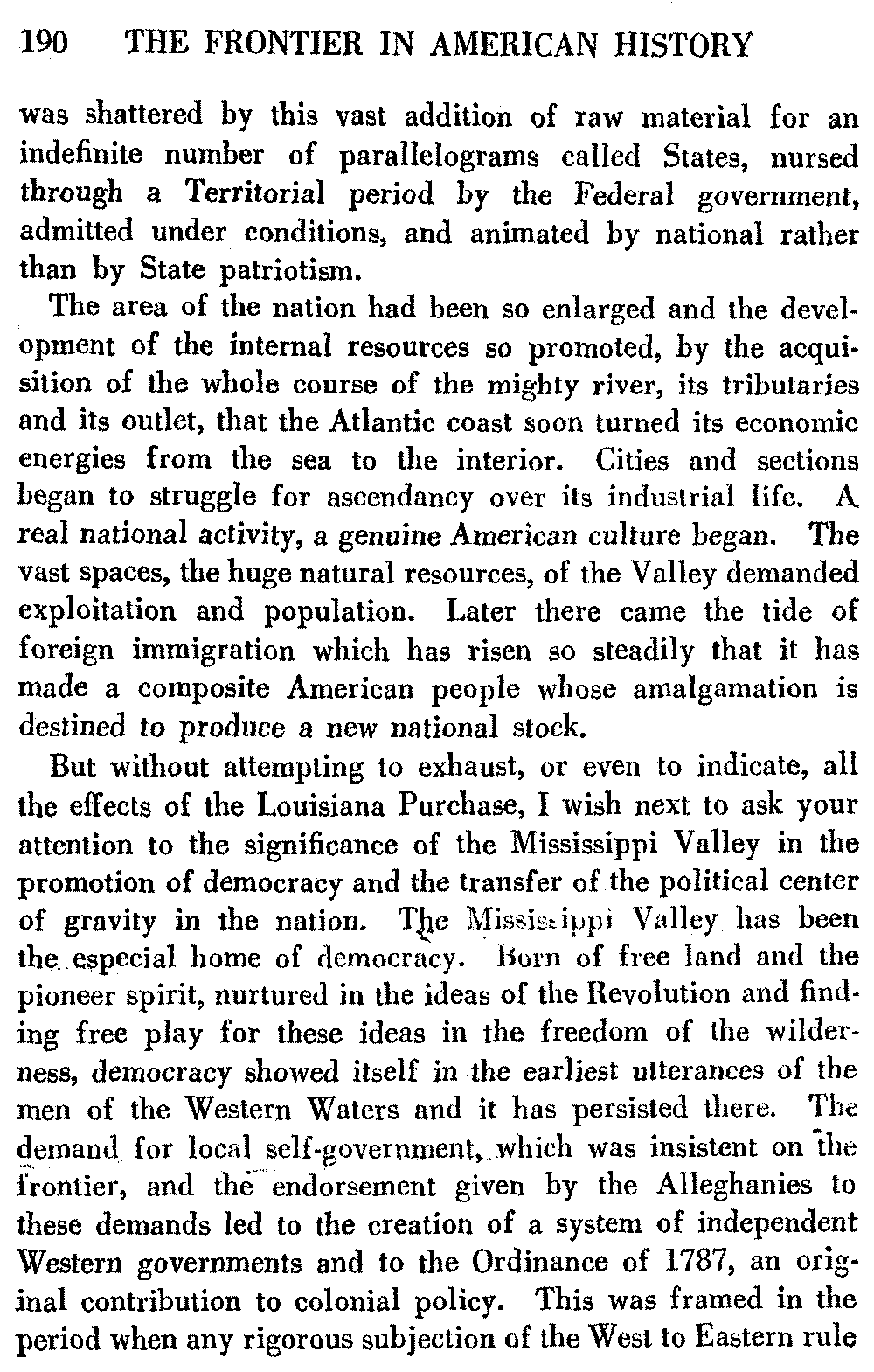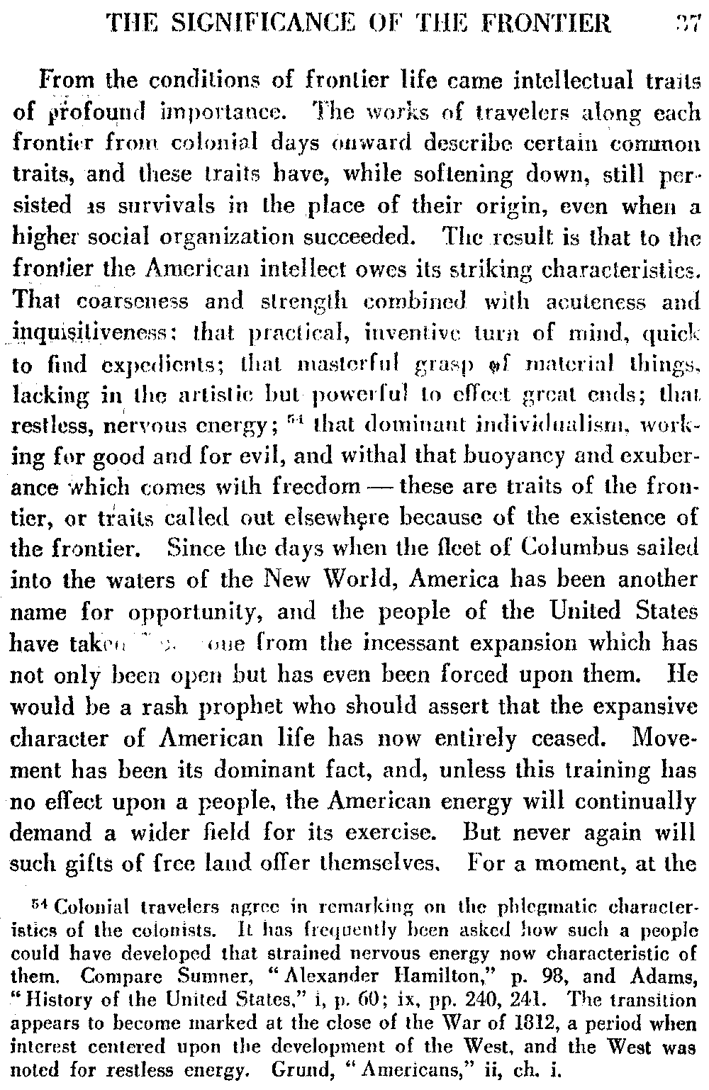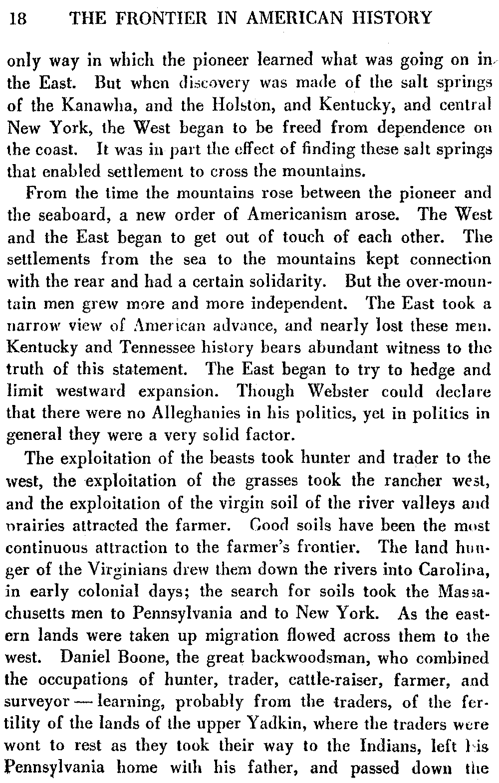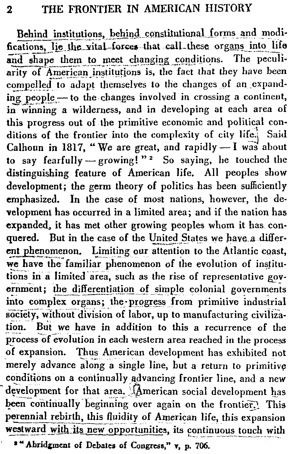 Behind institutions, behind constitutional forms and modifications, lie the vital forces that call these organs into life and shape them to meet changing conditions. The peculiarity of American institutions is, the fact that they have been compelled to adapt themselves to the changes of an expanding people—to the changes involved in crossing a continent, in winning a wilderness, and in developing at each area of this progress out of the primitive economic and political conditions of the frontier into the complexity of city life. Said Calhoun in 1817, "We are great, and rapidly—I was about to say fearfully—growing!"[2:1] So saying, he touched the distinguishing feature of American life. All peoples show development; the germ theory of politics has been sufficiently emphasized. In the case of most nations, however, the development has occurred in a limited area; and if the nation has expanded, it has met other growing peoples whom it has conquered. But in the case of the United States we have a different phenomenon. Limiting our attention to the Atlantic coast, we have the familiar phenomenon of the evolution of institutions in a limited area, such as the rise of representative government; the differentiation of simple colonial governments into complex organs; the progress from primitive industrial society, without division of labor, up to manufacturing civilization. But we have in addition to this a recurrence of the process of evolution in each western area reached in the process of expansion. Thus American development has exhibited not merely advance along a single line, but a return to primitive conditions on a continually advancing frontier line, and a new development for that area. American social development has been continually beginning over again on the frontier. This perennial rebirth, this fluidity of American life, this expansion westward with its new opportunities, its continuous touch with [3]the simplicity of primitive society, furnish the forces dominating American character. The true point of view in the history of this nation is not the Atlantic coast, it is the Great West. Even the slavery struggle, which is made so exclusive an object of attention by writers like Professor von Holst, occupies its important place in American history because of its relation to westward expansion.
