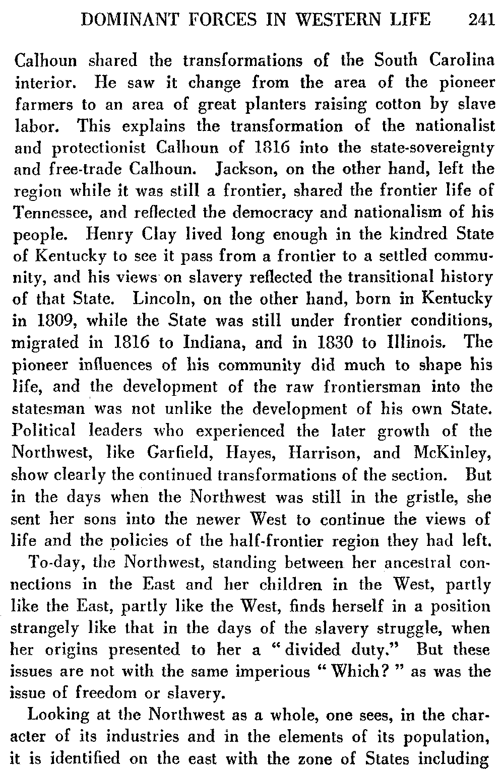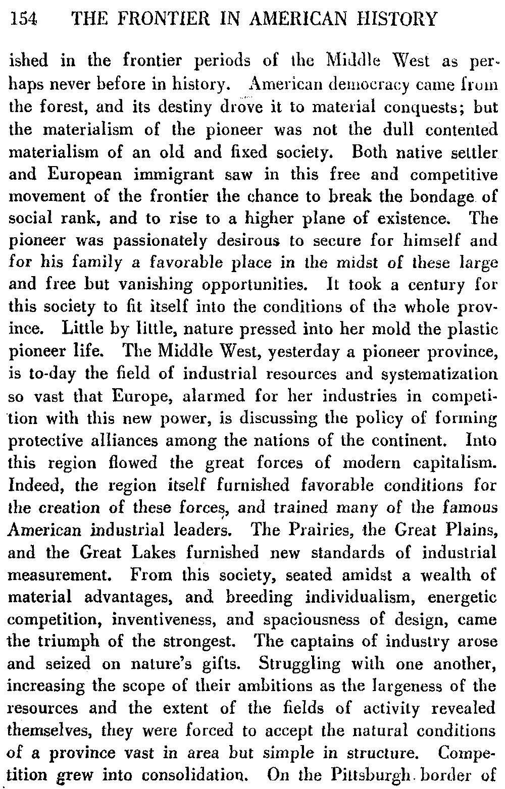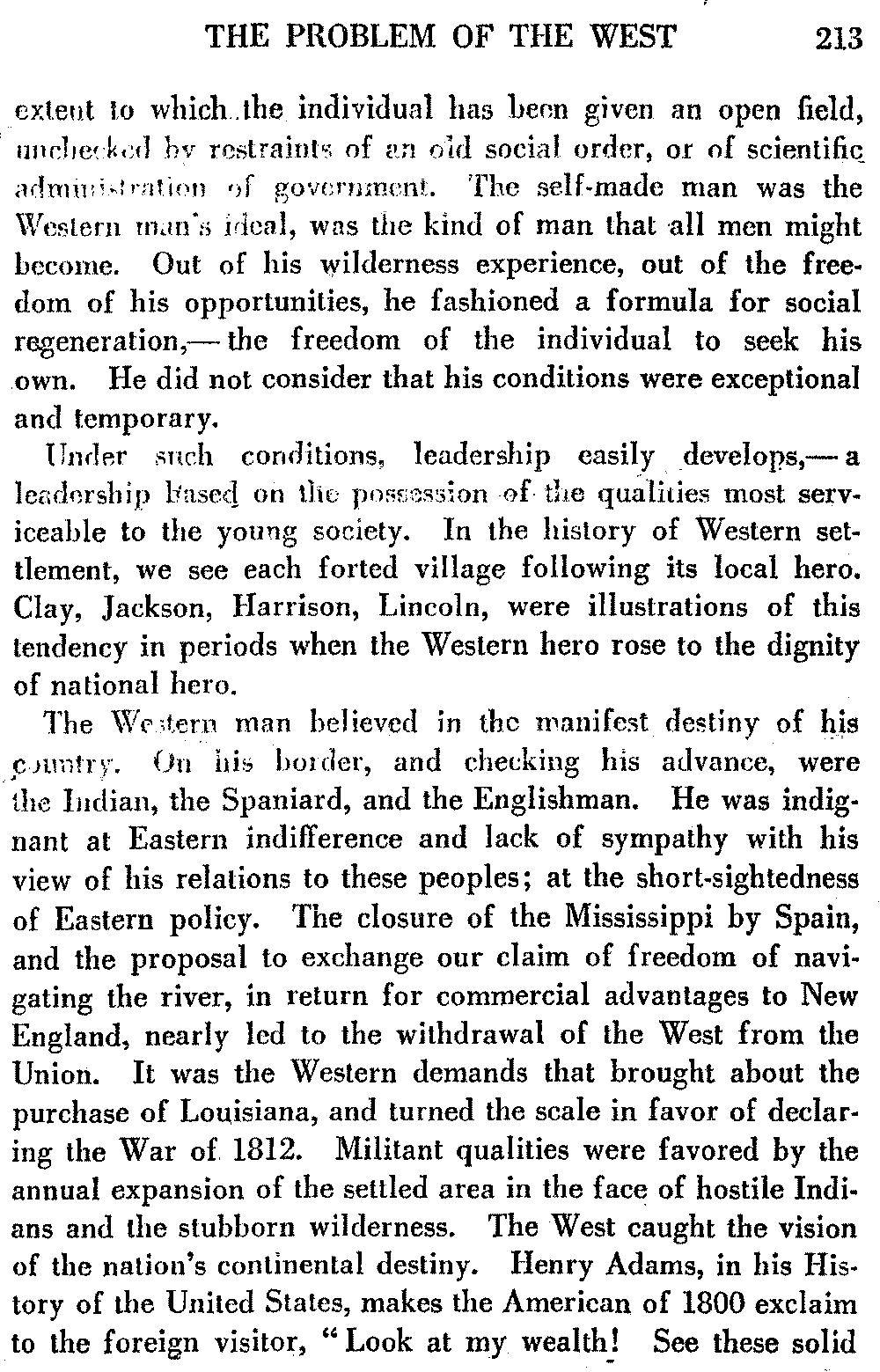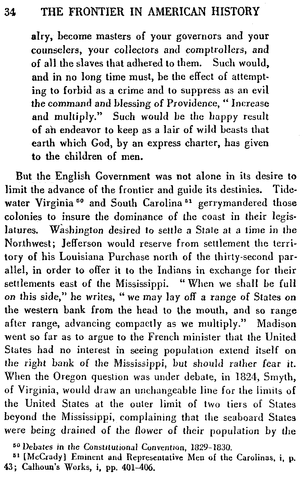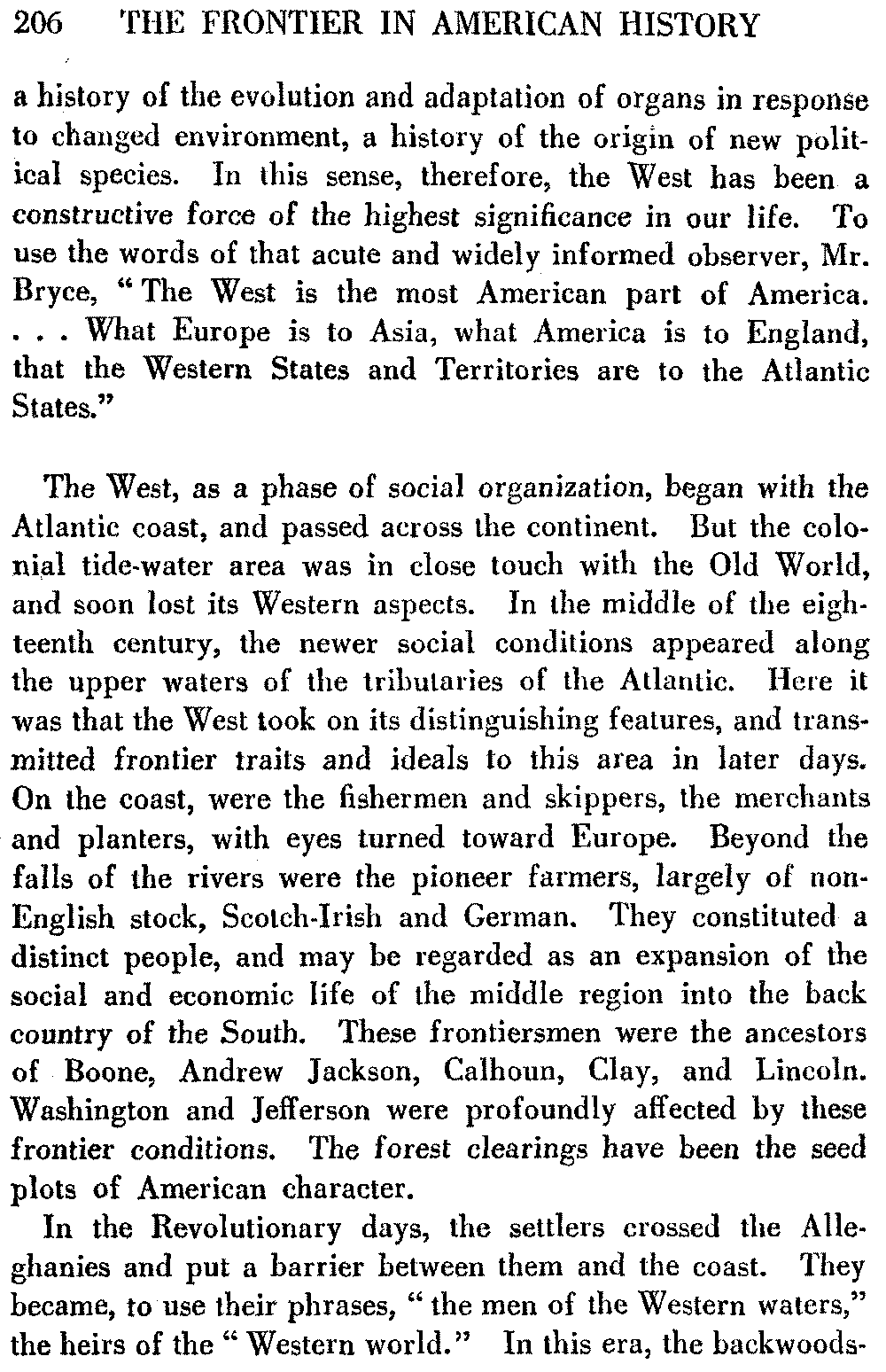 Behind institutions, behind constitutional forms and modifications, lie the vital forces that call these organs into life and shape them to meet changing conditions. The peculiarity of American institutions is, the fact that they have been compelled to adapt themselves to the changes of an expanding people—to the changes involved in crossing a continent, in winning a wilderness, and in developing at each area of this progress out of the primitive economic and political conditions of the frontier into the complexity of city life. Said Calhoun in 1817, "We are great, and rapidly—I was about to say fearfully—growing!"[2:1] So saying, he touched the distinguishing feature of American life. All peoples show development; the germ theory of politics has been sufficiently emphasized. In the case of most nations, however, the development has occurred in a limited area; and if the nation has expanded, it has met other growing peoples whom it has conquered. But in the case of the United States we have a different phenomenon. Limiting our attention to the Atlantic coast, we have the familiar phenomenon of the evolution of institutions in a limited area, such as the rise of representative government; the differentiation of simple colonial governments into complex organs; the progress from primitive industrial society, without division of labor, up to manufacturing civilization. But we have in addition to this a recurrence of the process of evolution in each western area reached in the process of expansion. Thus American development has exhibited not merely advance along a single line, but a return to primitive conditions on a continually advancing frontier line, and a new development for that area. American social development has been continually beginning over again on the frontier. This perennial rebirth, this fluidity of American life, this expansion westward with its new opportunities, its continuous touch with [3]the simplicity of primitive society, furnish the forces dominating American character. The true point of view in the history of this nation is not the Atlantic coast, it is the Great West. Even the slavery struggle, which is made so exclusive an object of attention by writers like Professor von Holst, occupies its important place in American history because of its relation to westward expansion.