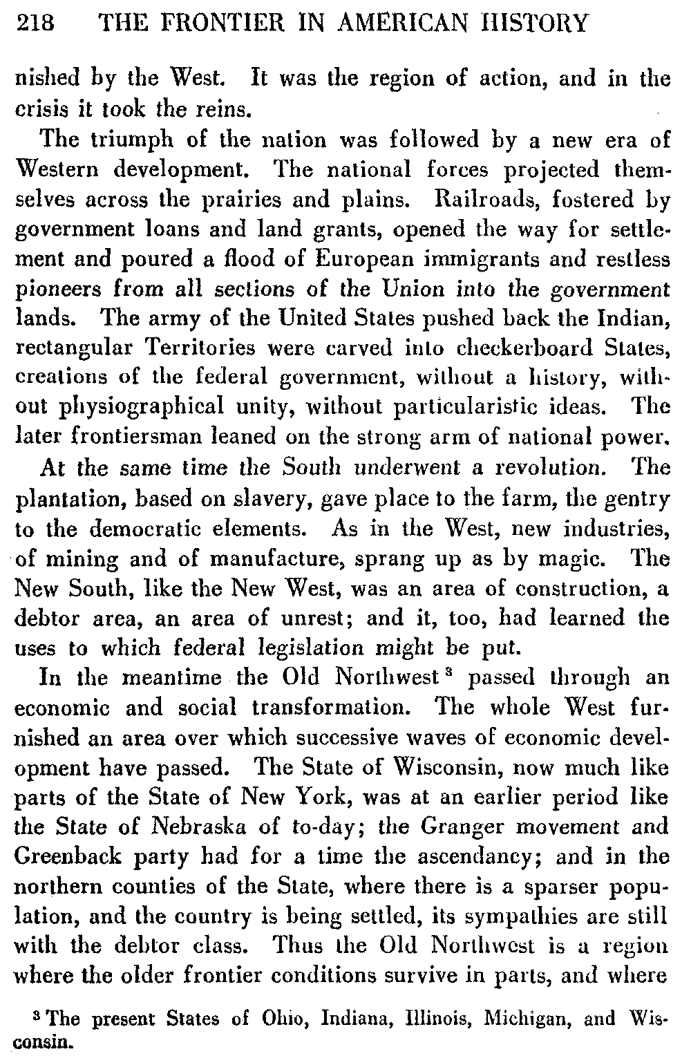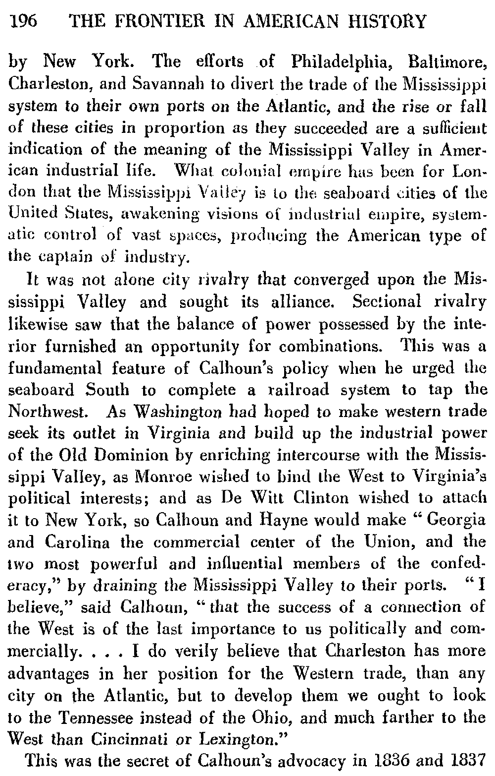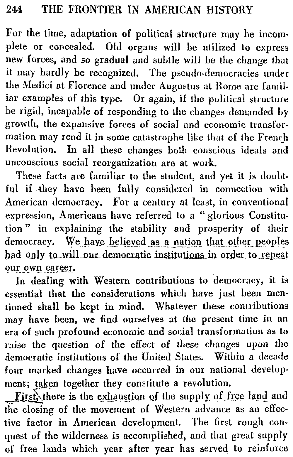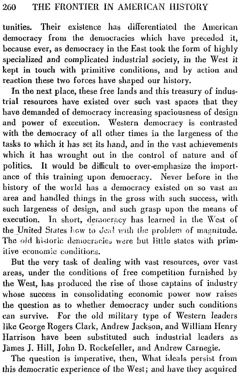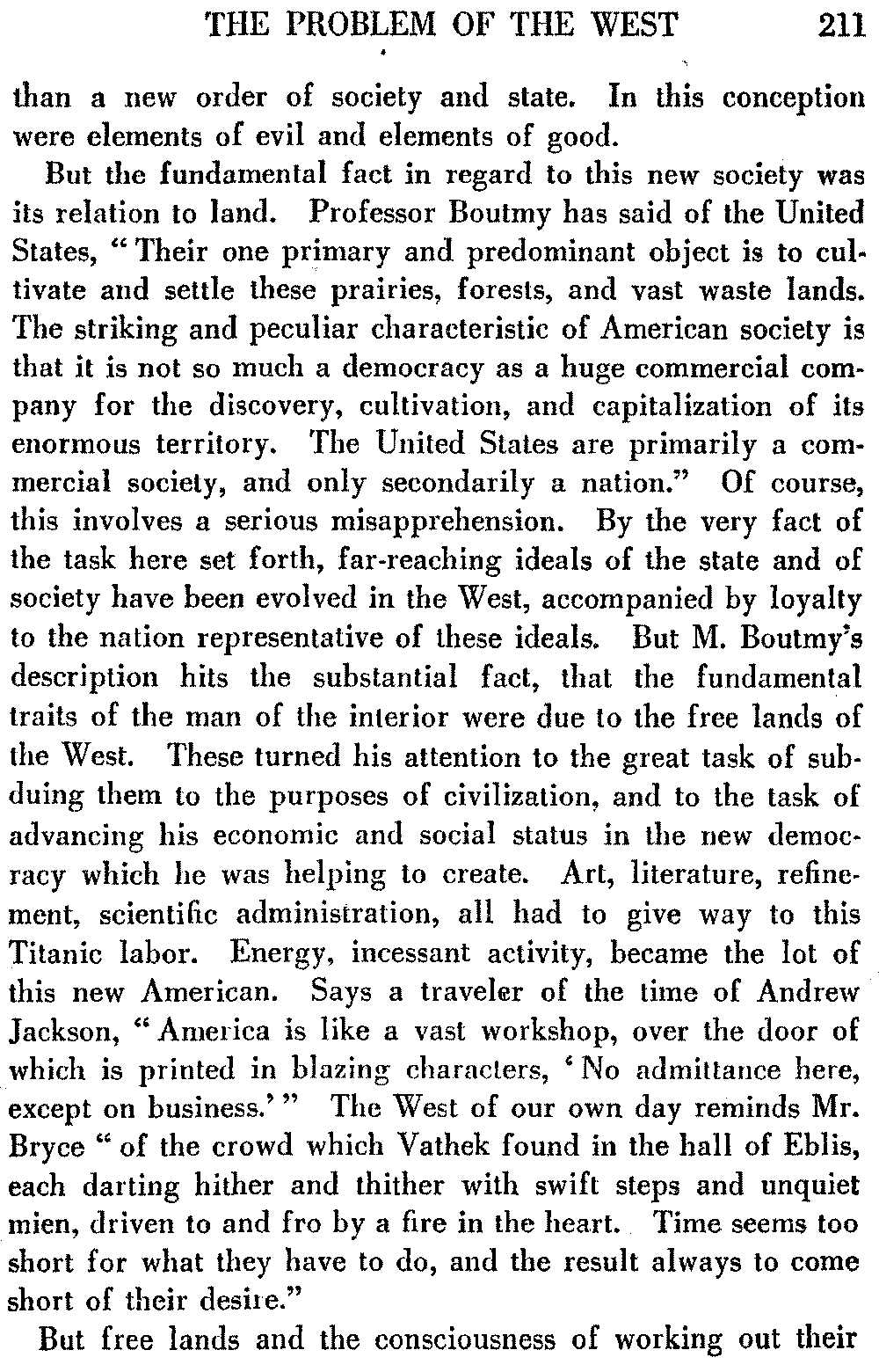 Behind institutions, behind constitutional forms and modifications, lie the vital forces that call these organs into life and shape them to meet changing conditions. The peculiarity of American institutions is, the fact that they have been compelled to adapt themselves to the changes of an expanding people—to the changes involved in crossing a continent, in winning a wilderness, and in developing at each area of this progress out of the primitive economic and political conditions of the frontier into the complexity of city life. Said Calhoun in 1817, "We are great, and rapidly—I was about to say fearfully—growing!"[2:1] So saying, he touched the distinguishing feature of American life. All peoples show development; the germ theory of politics has been sufficiently emphasized. In the case of most nations, however, the development has occurred in a limited area; and if the nation has expanded, it has met other growing peoples whom it has conquered. But in the case of the United States we have a different phenomenon. Limiting our attention to the Atlantic coast, we have the familiar phenomenon of the evolution of institutions in a limited area, such as the rise of representative government; the differentiation of simple colonial governments into complex organs; the progress from primitive industrial society, without division of labor, up to manufacturing civilization. But we have in addition to this a recurrence of the process of evolution in each western area reached in the process of expansion. Thus American development has exhibited not merely advance along a single line, but a return to primitive conditions on a continually advancing frontier line, and a new development for that area. American social development has been continually beginning over again on the frontier. This perennial rebirth, this fluidity of American life, this expansion westward with its new opportunities, its continuous touch with [3]the simplicity of primitive society, furnish the forces dominating American character. The true point of view in the history of this nation is not the Atlantic coast, it is the Great West. Even the slavery struggle, which is made so exclusive an object of attention by writers like Professor von Holst, occupies its important place in American history because of its relation to westward expansion.